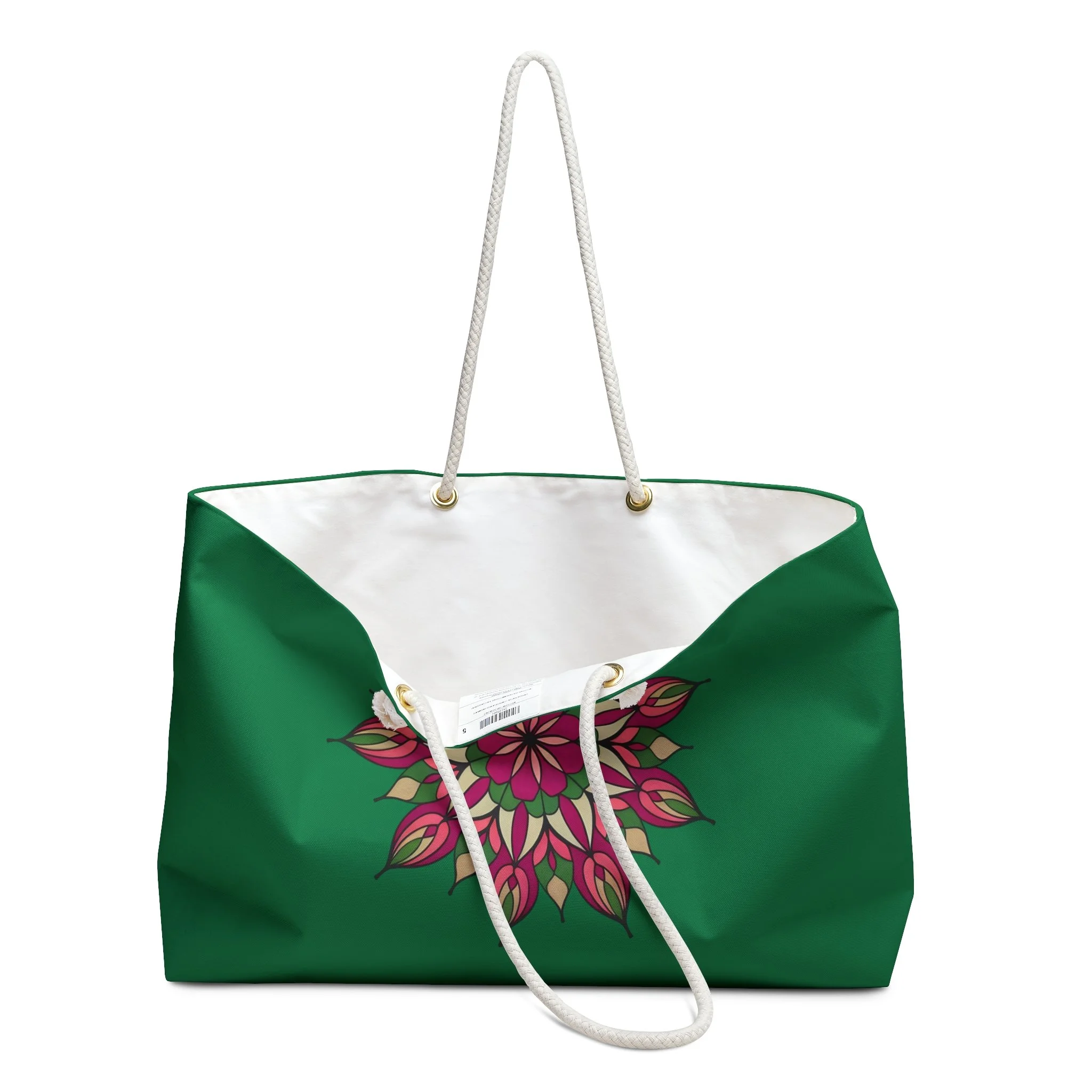 A roomy, carry-anywhere weekender that brings quiet warmth to your travels. The deep evergreen exterior sets a calm, grounded tone while the hand-drawn floral mandala at center adds a splash of jewel-toned energy. The soft cream rope handles sit comfortably on the shoulder and the T-bottom keeps the bag steady when you set it down. Inside, a cream sheeting lining gives a tidy, airy feel so outfits and essentials are easy to find. Built from wrinkle-resistant spun polyester, this bag looks composed even after a long day of errands, beach time, or a spontaneous overnight. It’s assembled in the USA from carefully sourced parts, made to travel with the kind of person who values thoughtful, reliable pieces that feel a little joyful.