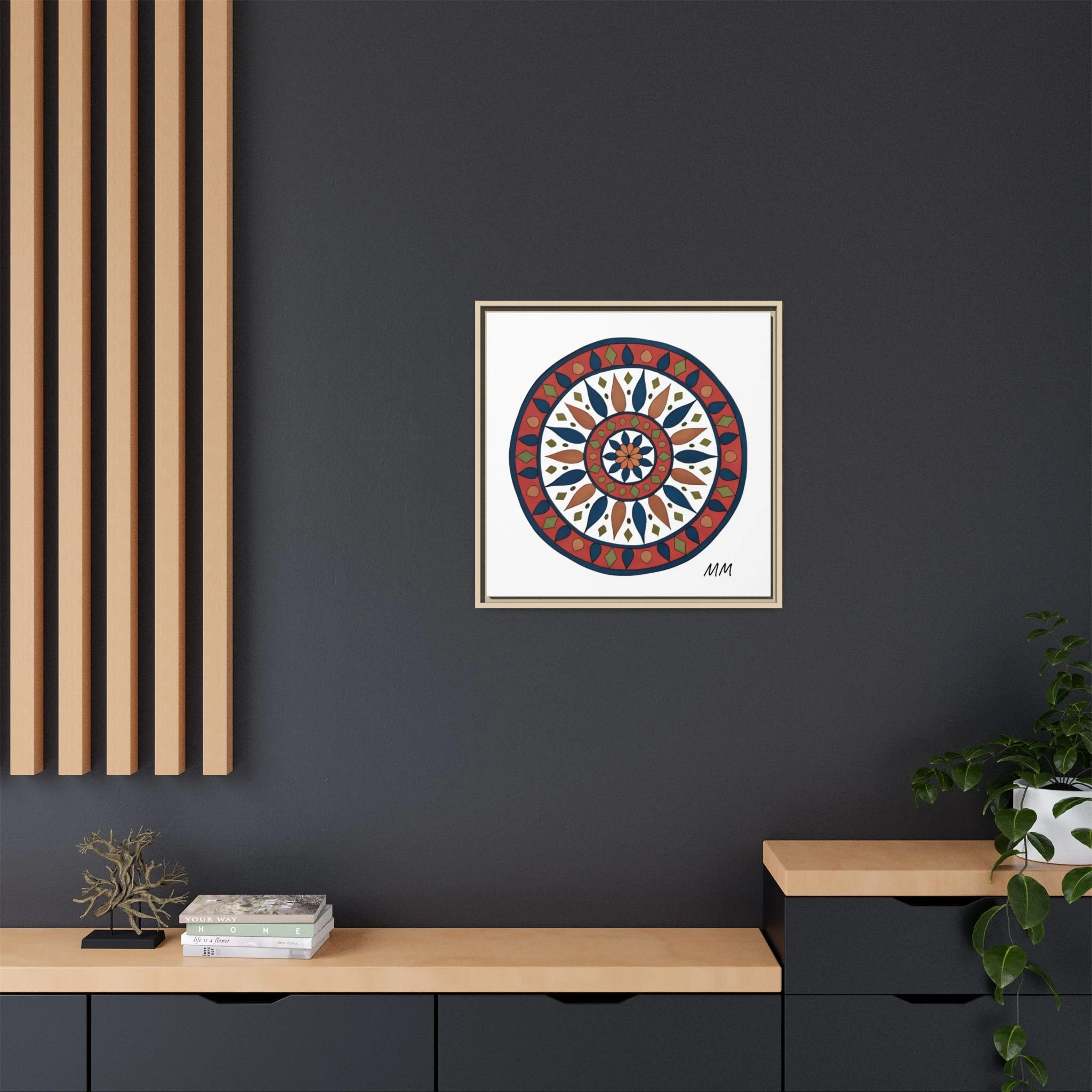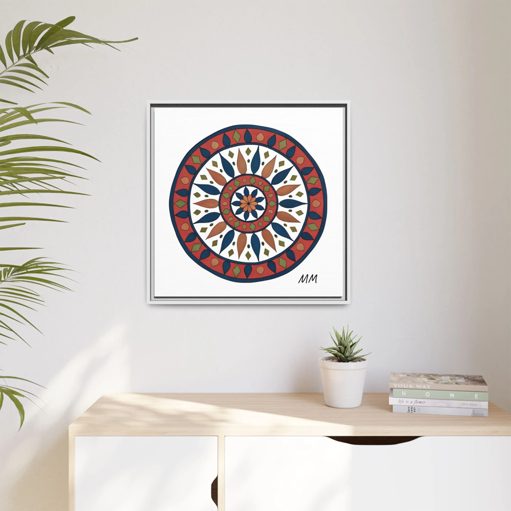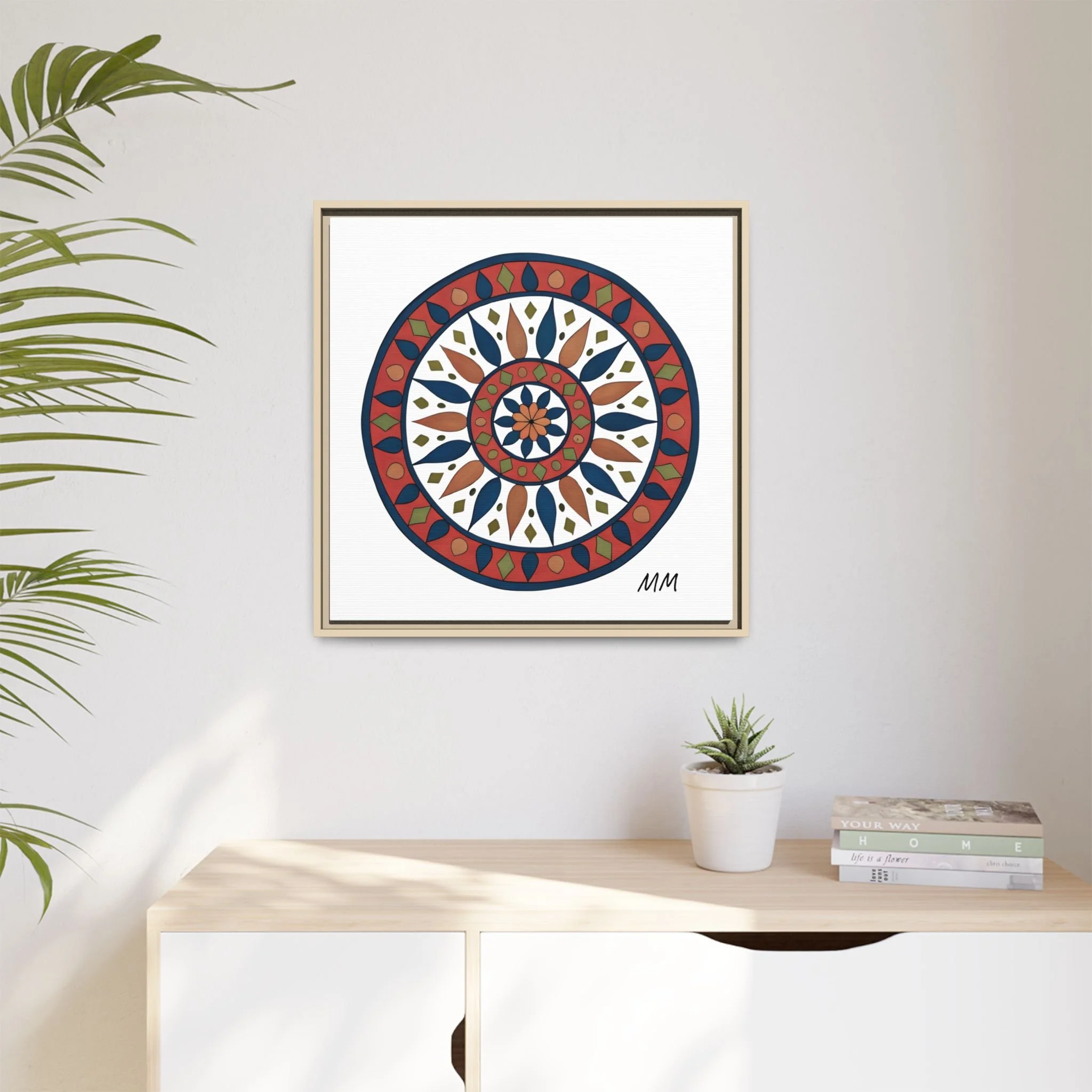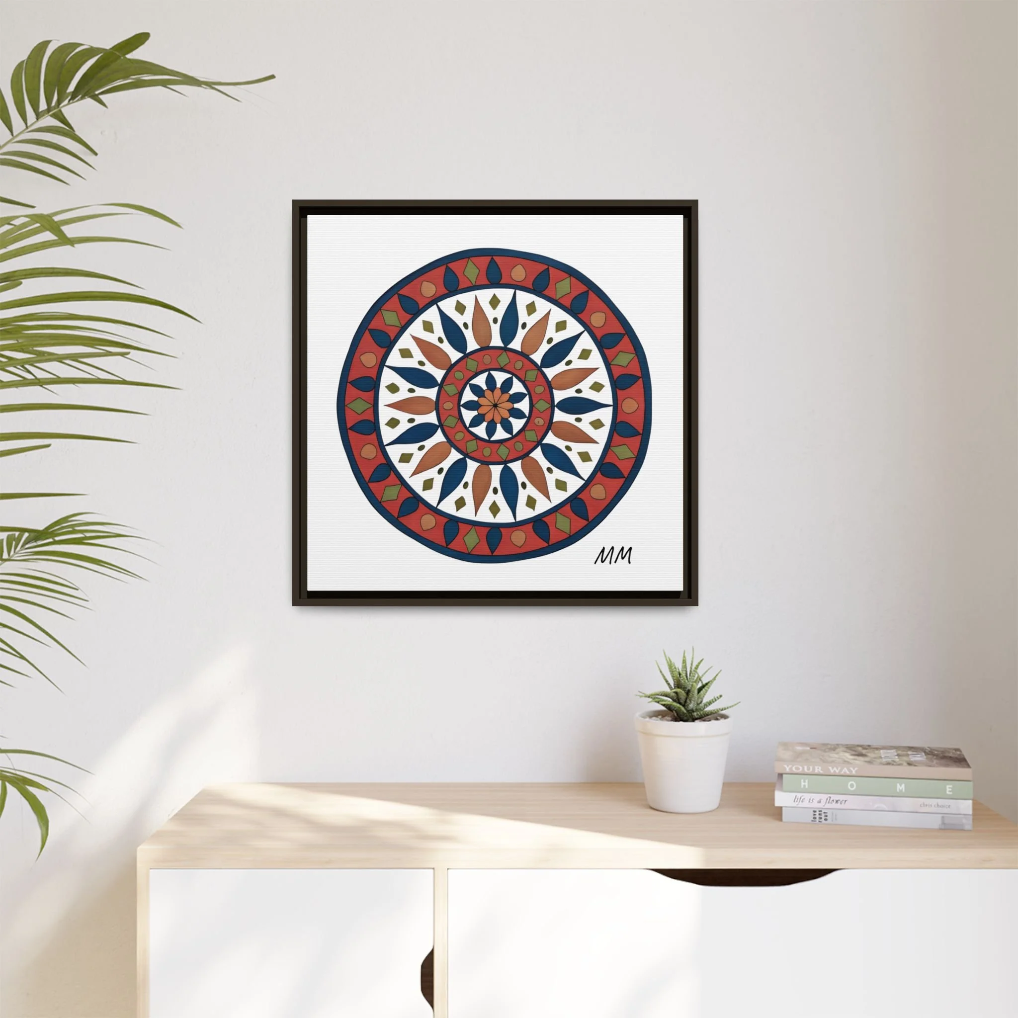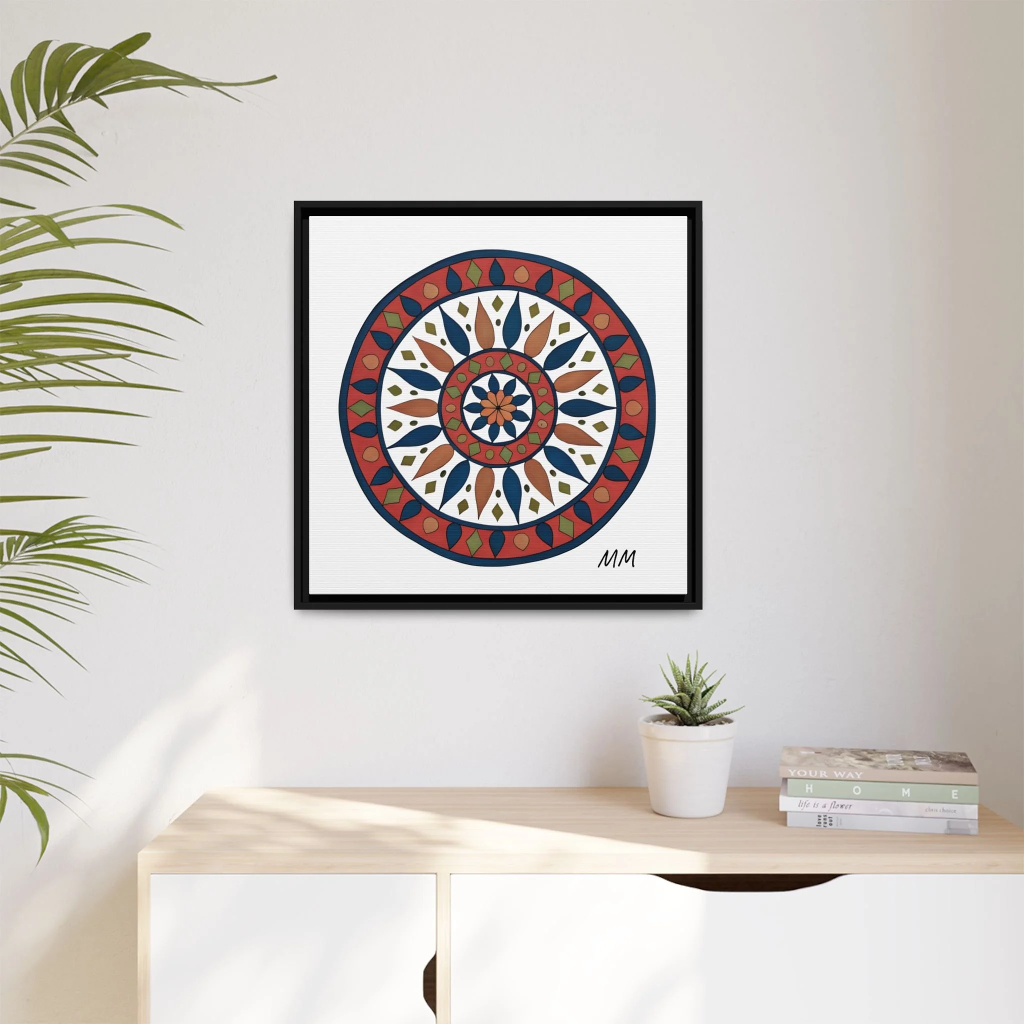 This framed matte canvas brings calm geometry and warm, earthy color into a room. The circular mandala-like design uses deep reds, navy, olive and terracotta tones that read both modern and handmade. Mounted on a slender pine frame with a soft-matte coating, the print keeps reflections low so the pattern reads clearly from across the room. It settles well above a console, in a reading nook, or as part of a gallery wall — adding quiet structure and a hand-drawn feel to everyday spaces.