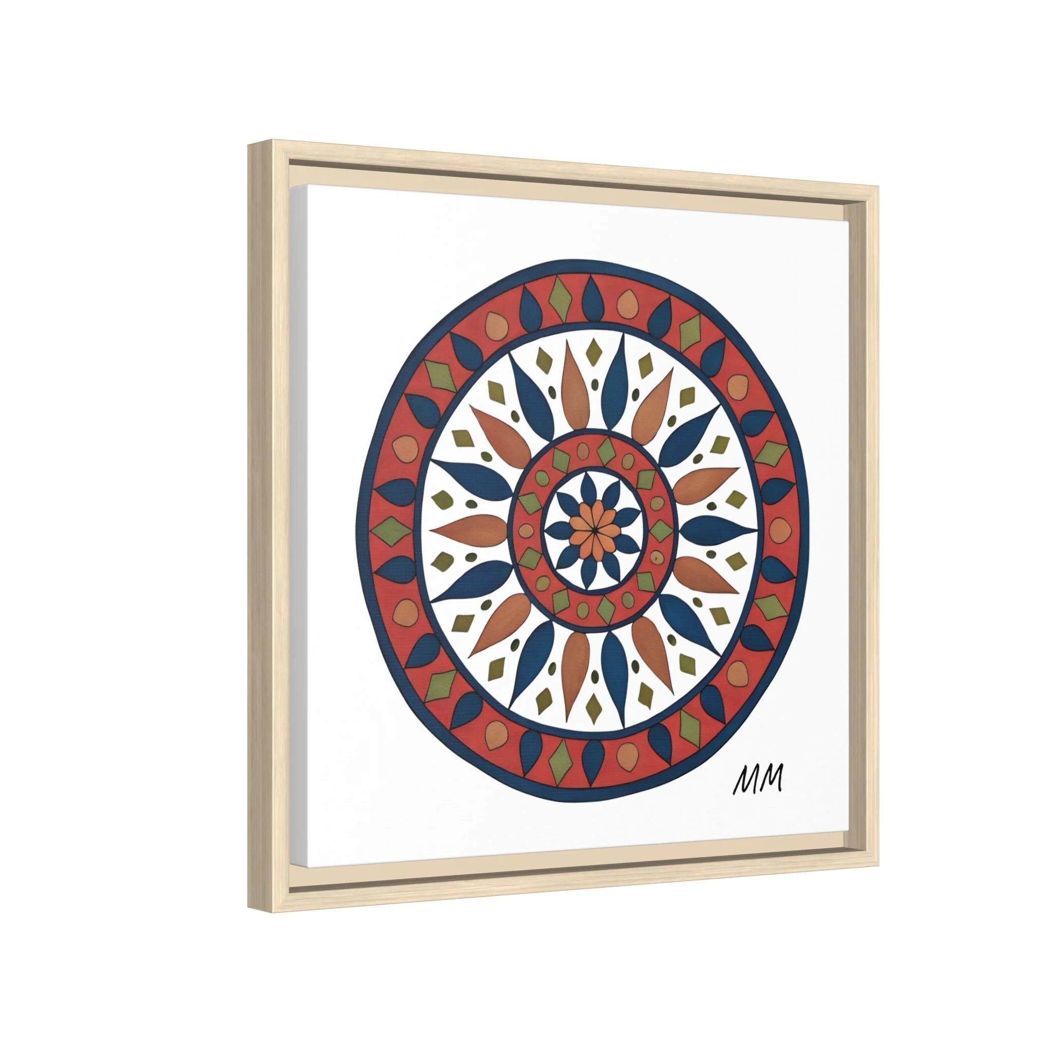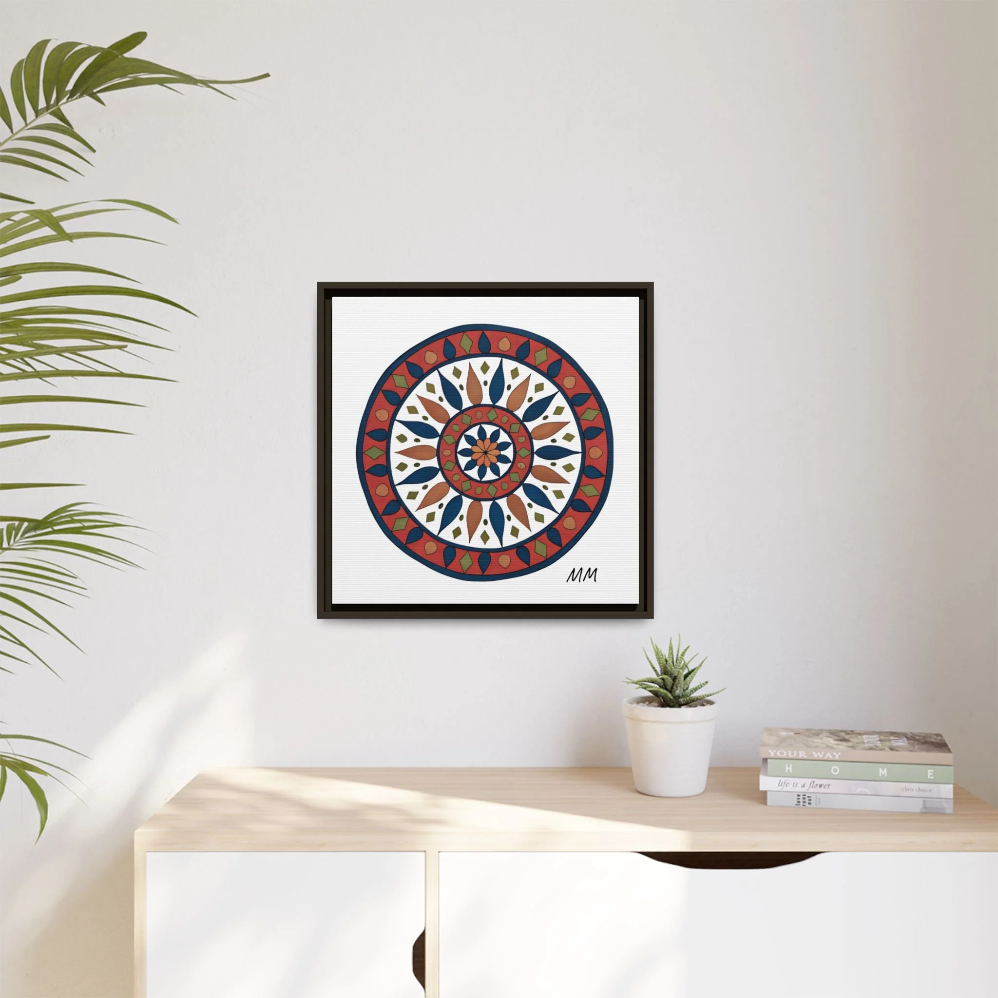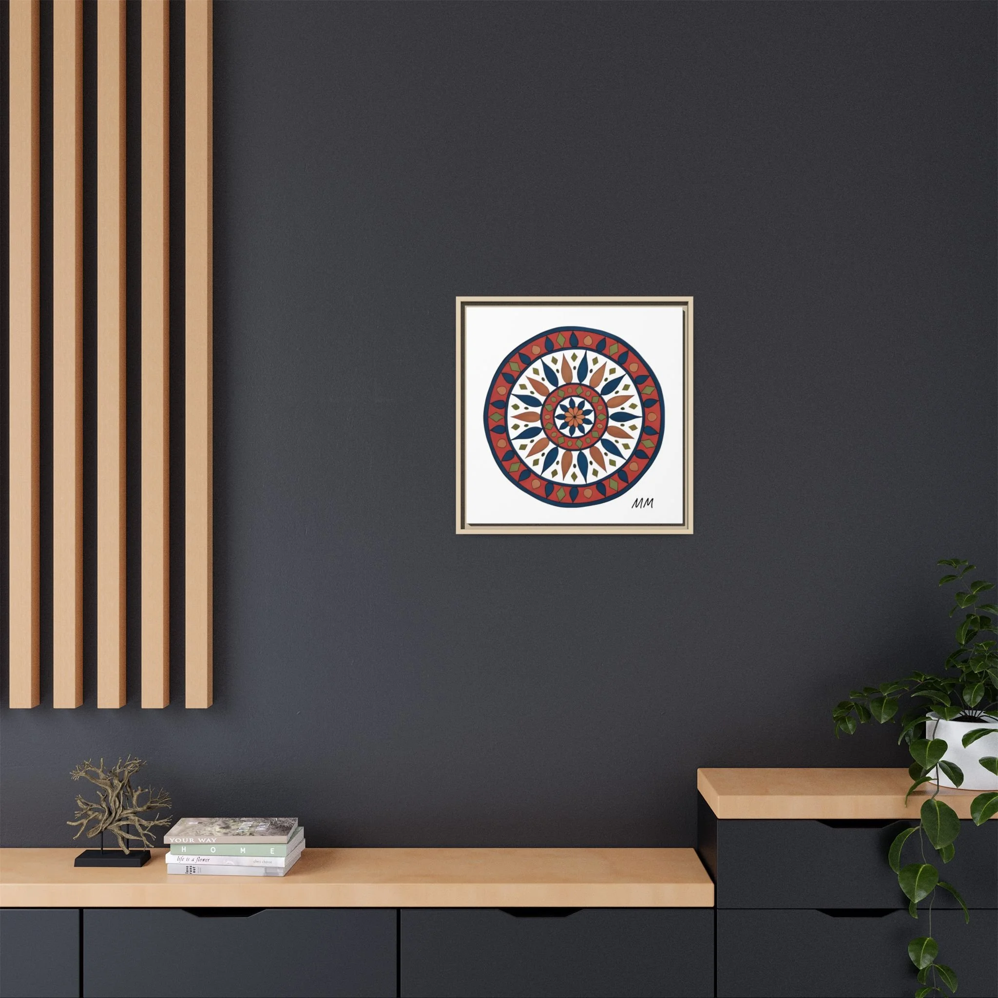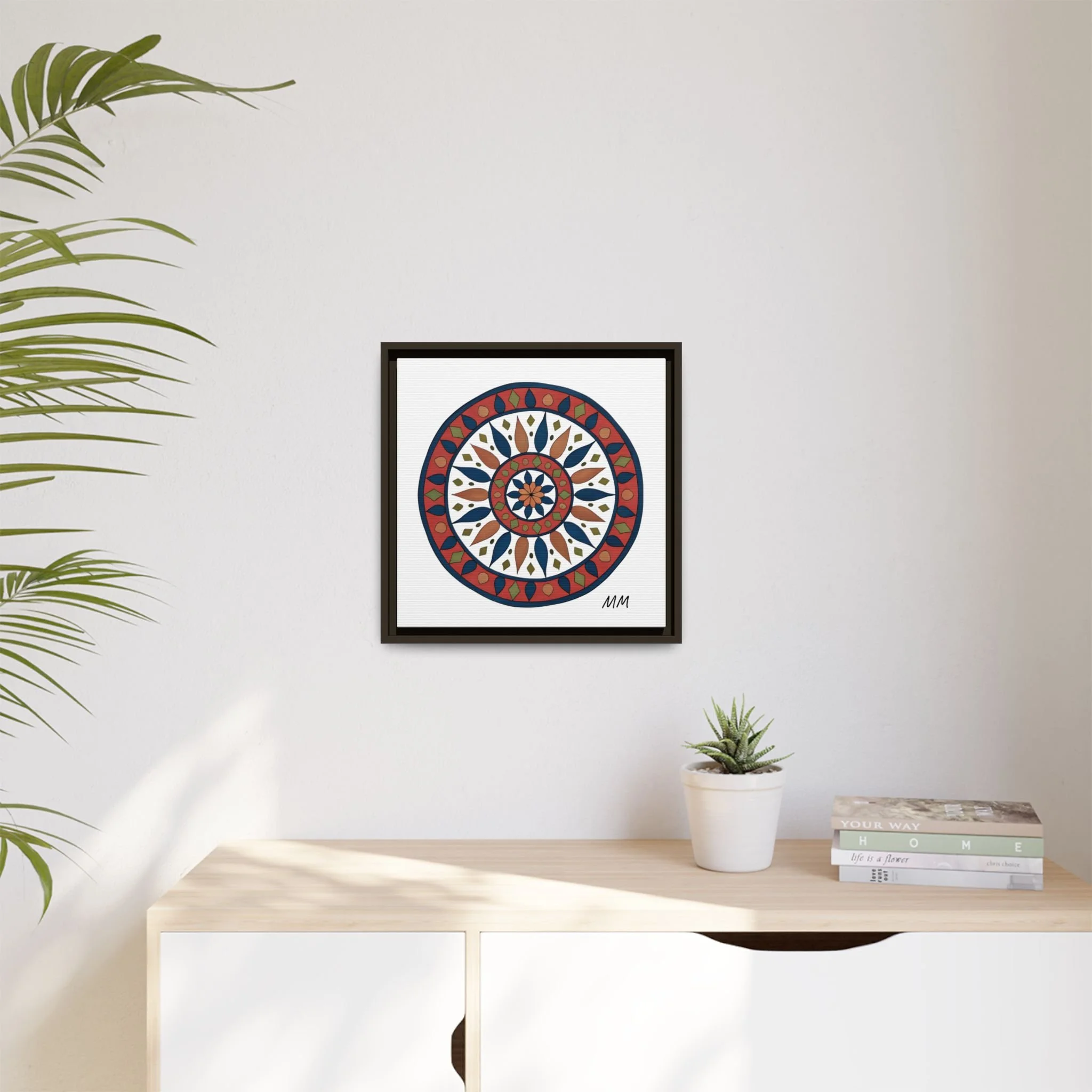 This framed matte canvas brings calm geometry and warm, earthy color into a room. The circular mandala-like design uses deep reds, navy, olive and terracotta tones that read both modern and handmade. Mounted on a slender pine frame with a soft-matte coating, the print keeps reflections low so the pattern reads clearly from across the room. It settles well above a console, in a reading nook, or as part of a gallery wall — adding quiet structure and a hand-drawn feel to everyday spaces.