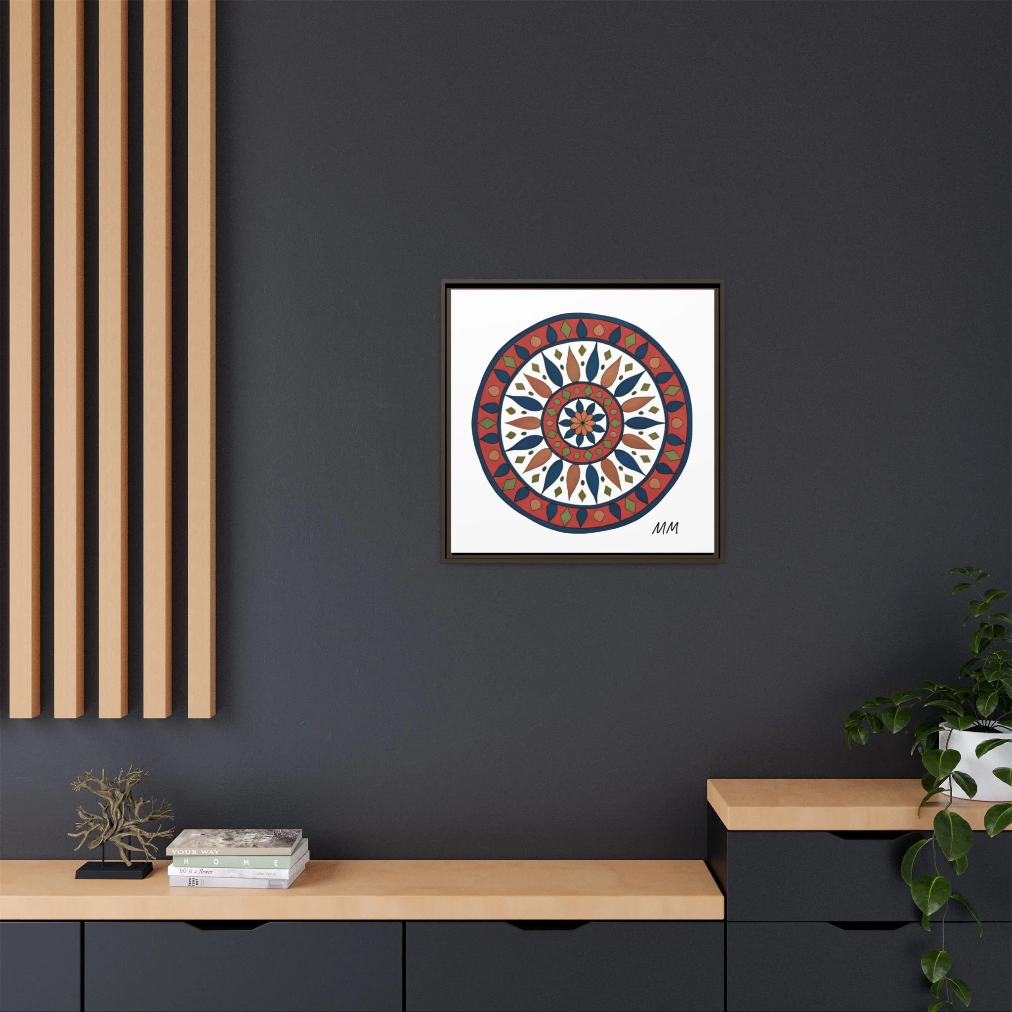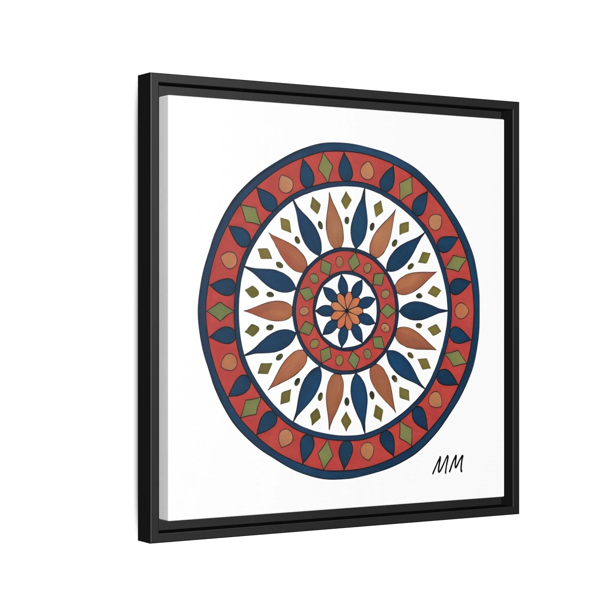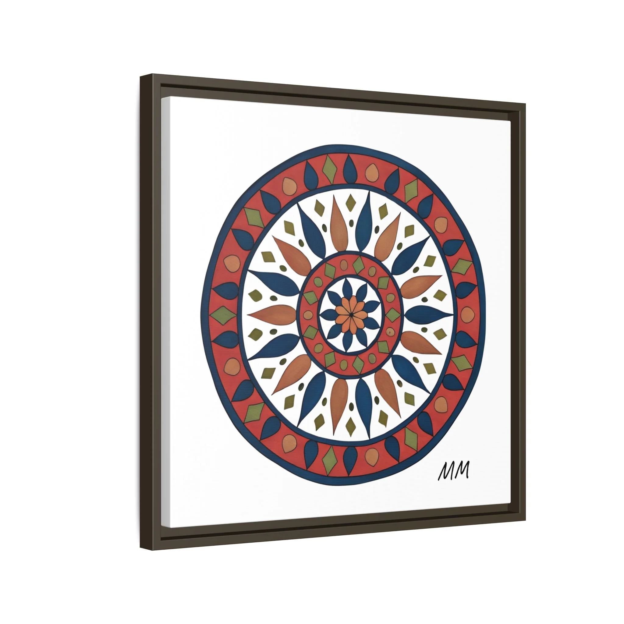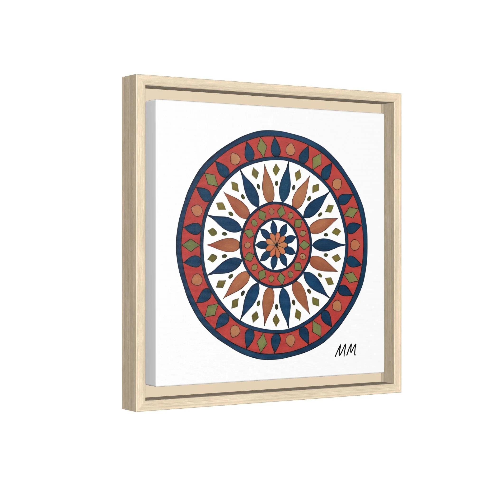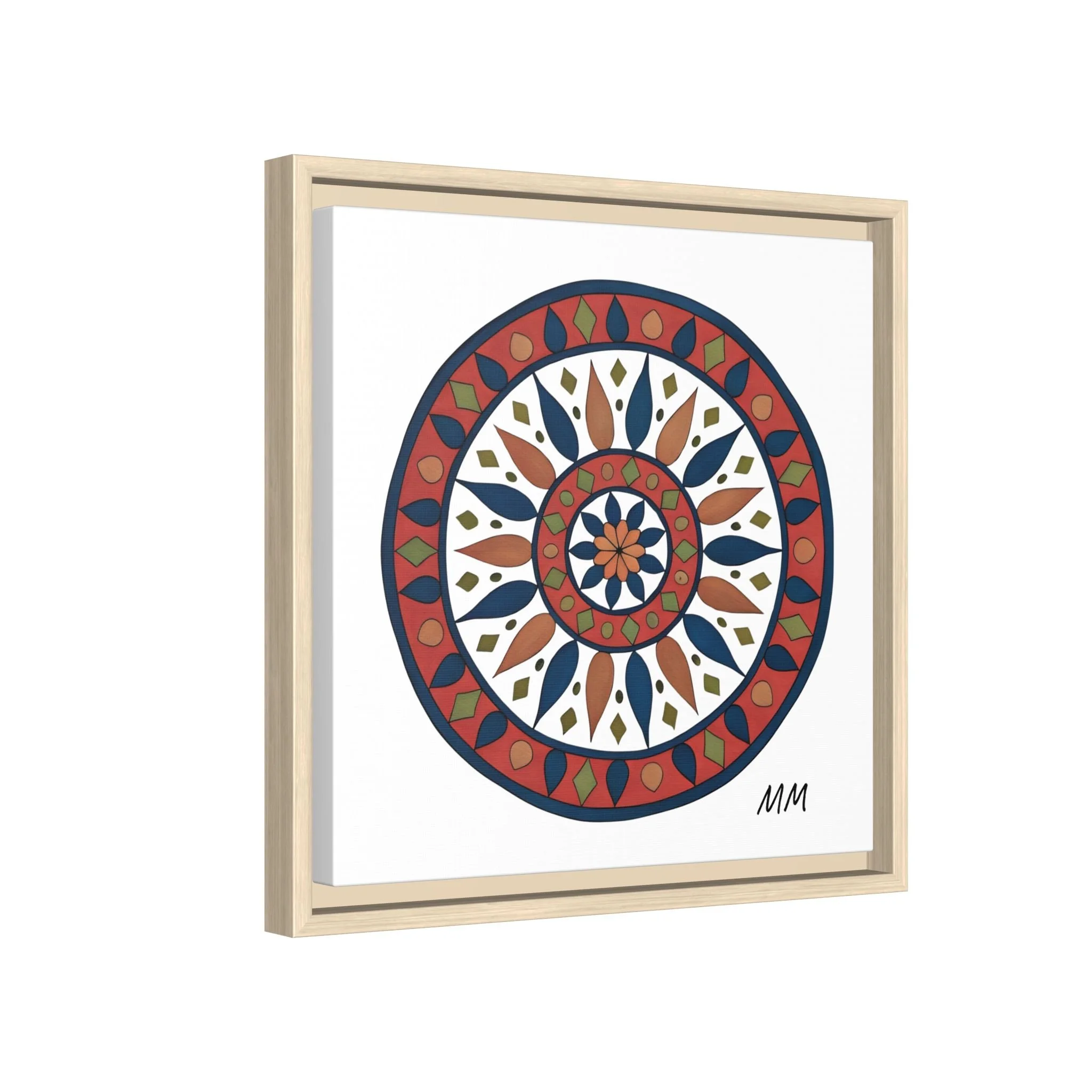 This framed matte canvas brings calm geometry and warm, earthy color into a room. The circular mandala-like design uses deep reds, navy, olive and terracotta tones that read both modern and handmade. Mounted on a slender pine frame with a soft-matte coating, the print keeps reflections low so the pattern reads clearly from across the room. It settles well above a console, in a reading nook, or as part of a gallery wall — adding quiet structure and a hand-drawn feel to everyday spaces.