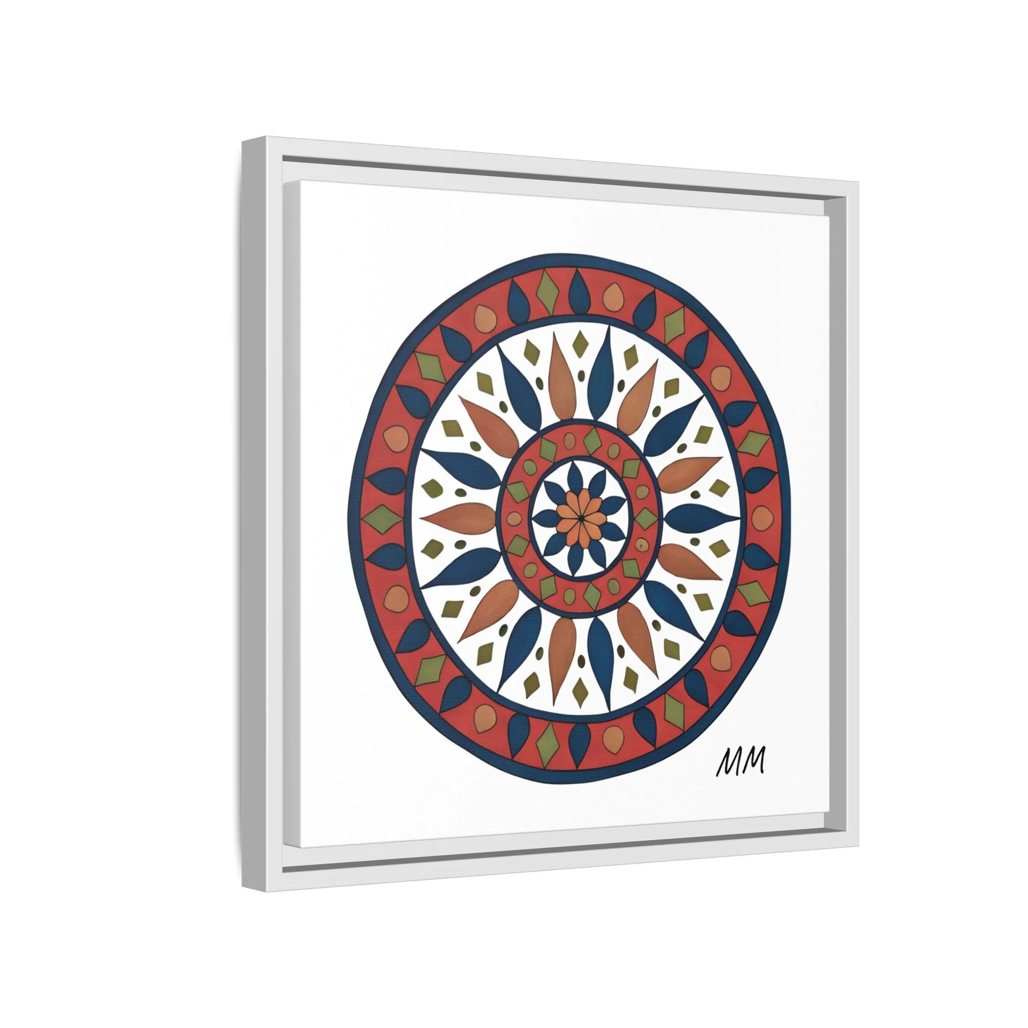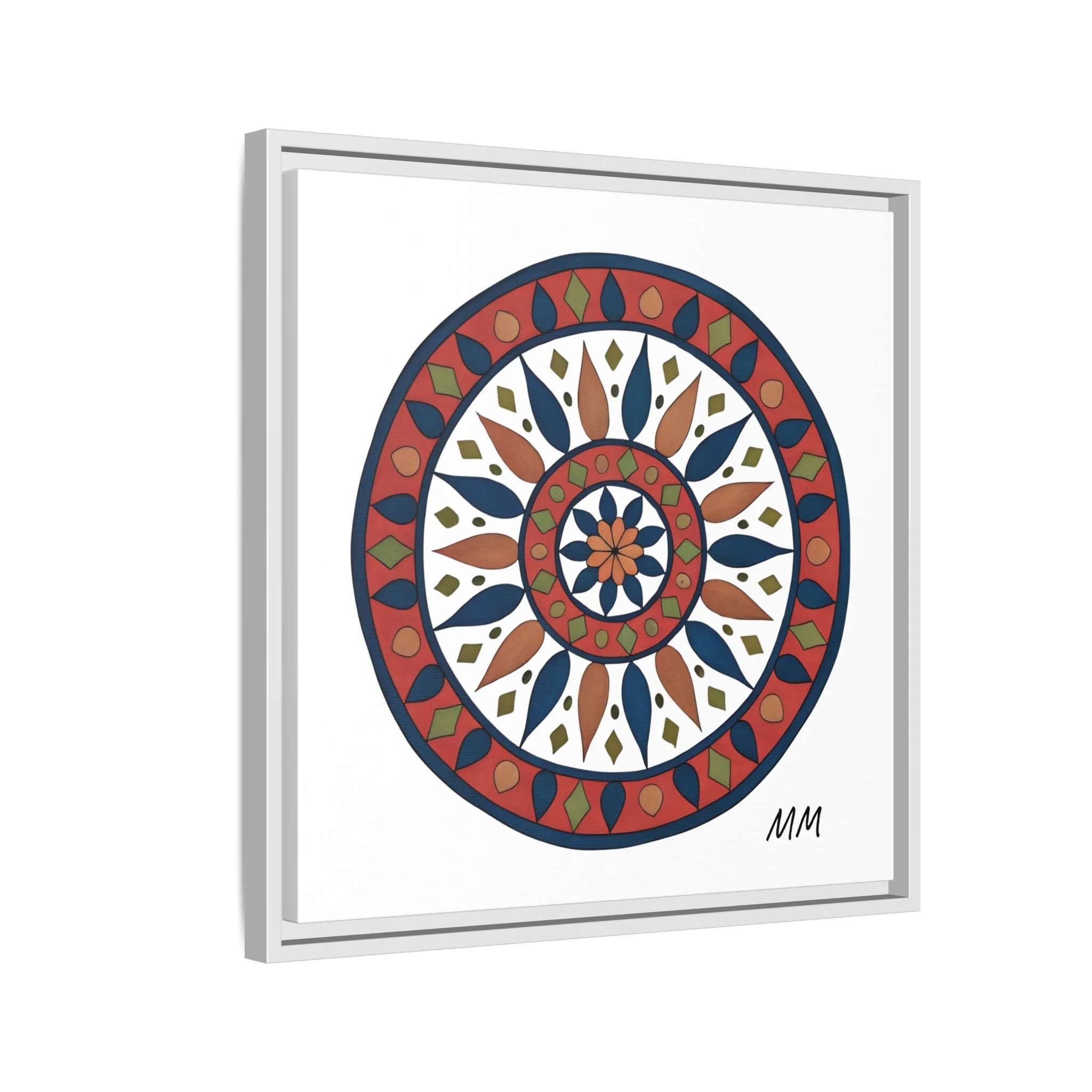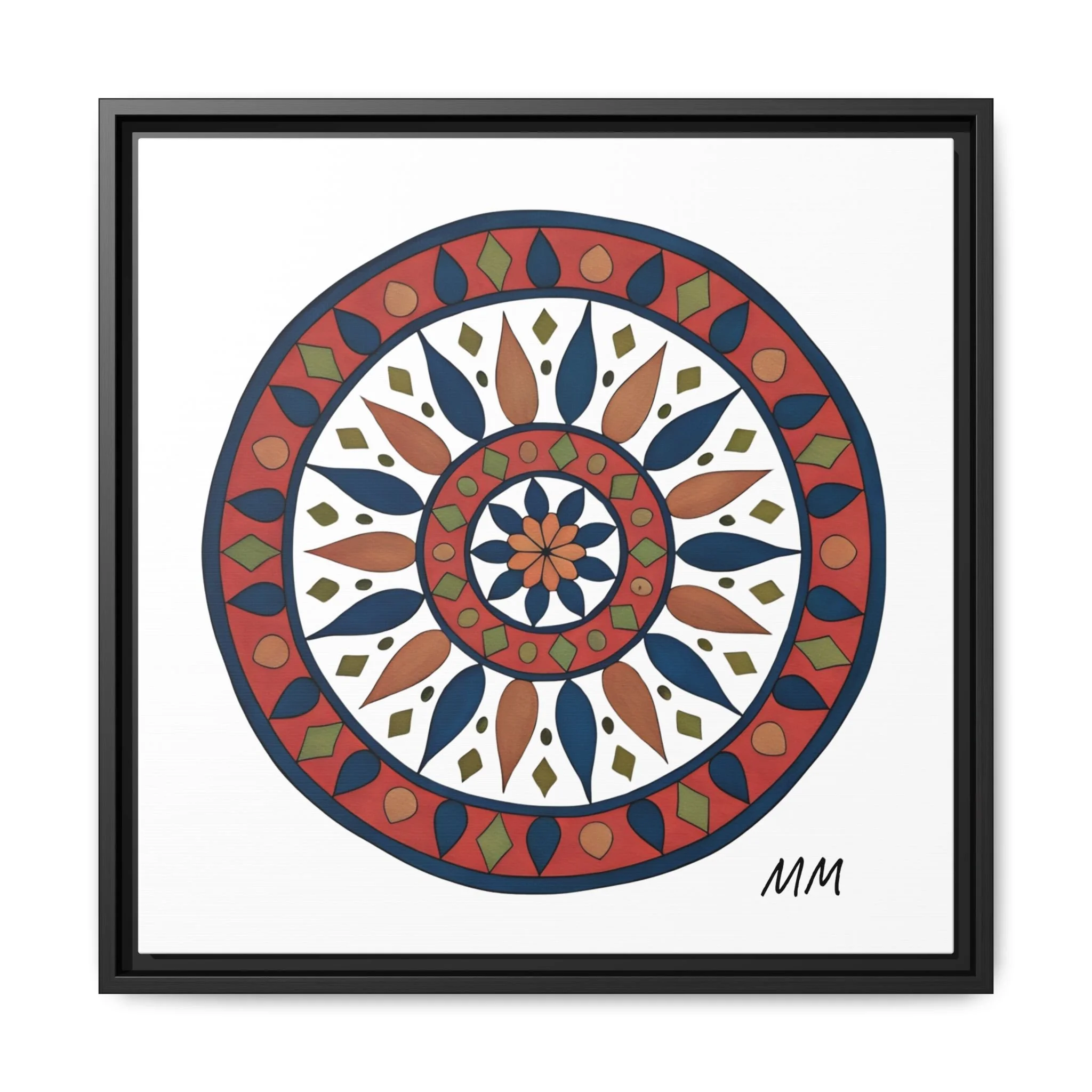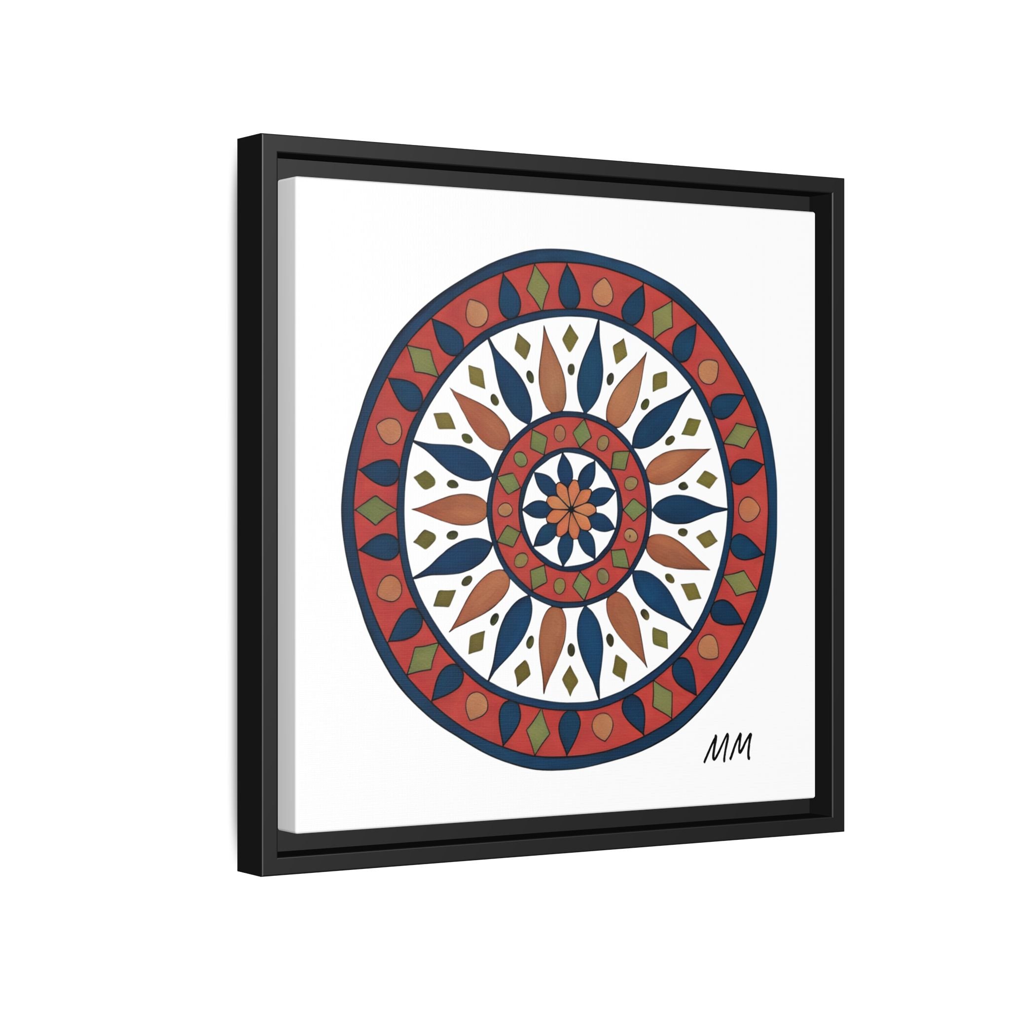This framed matte canvas brings calm geometry and warm, earthy color into a room. The circular mandala-like design uses deep reds, navy, olive and terracotta tones that read both modern and handmade. Mounted on a slender pine frame with a soft-matte coating, the print keeps reflections low so the pattern reads clearly from across the room. It settles well above a console, in a reading nook, or as part of a gallery wall — adding quiet structure and a hand-drawn feel to everyday spaces.