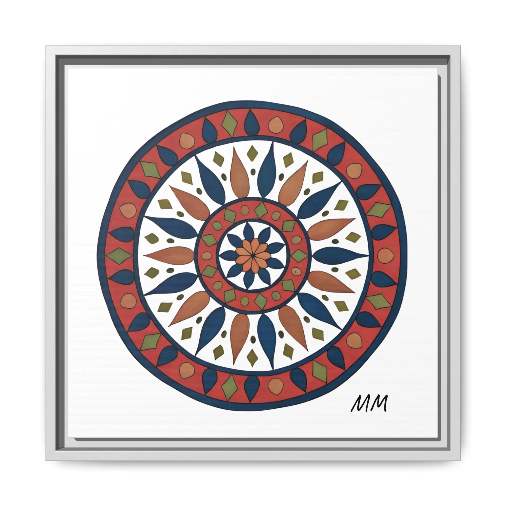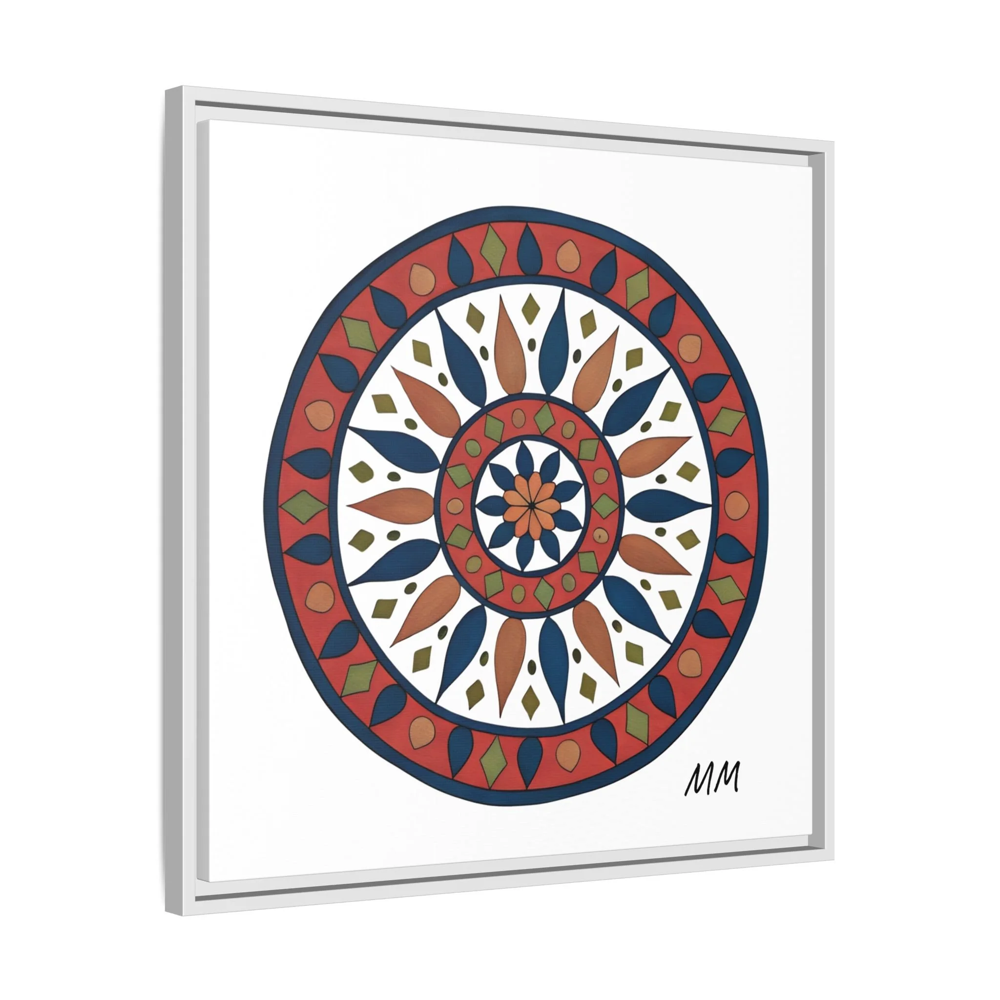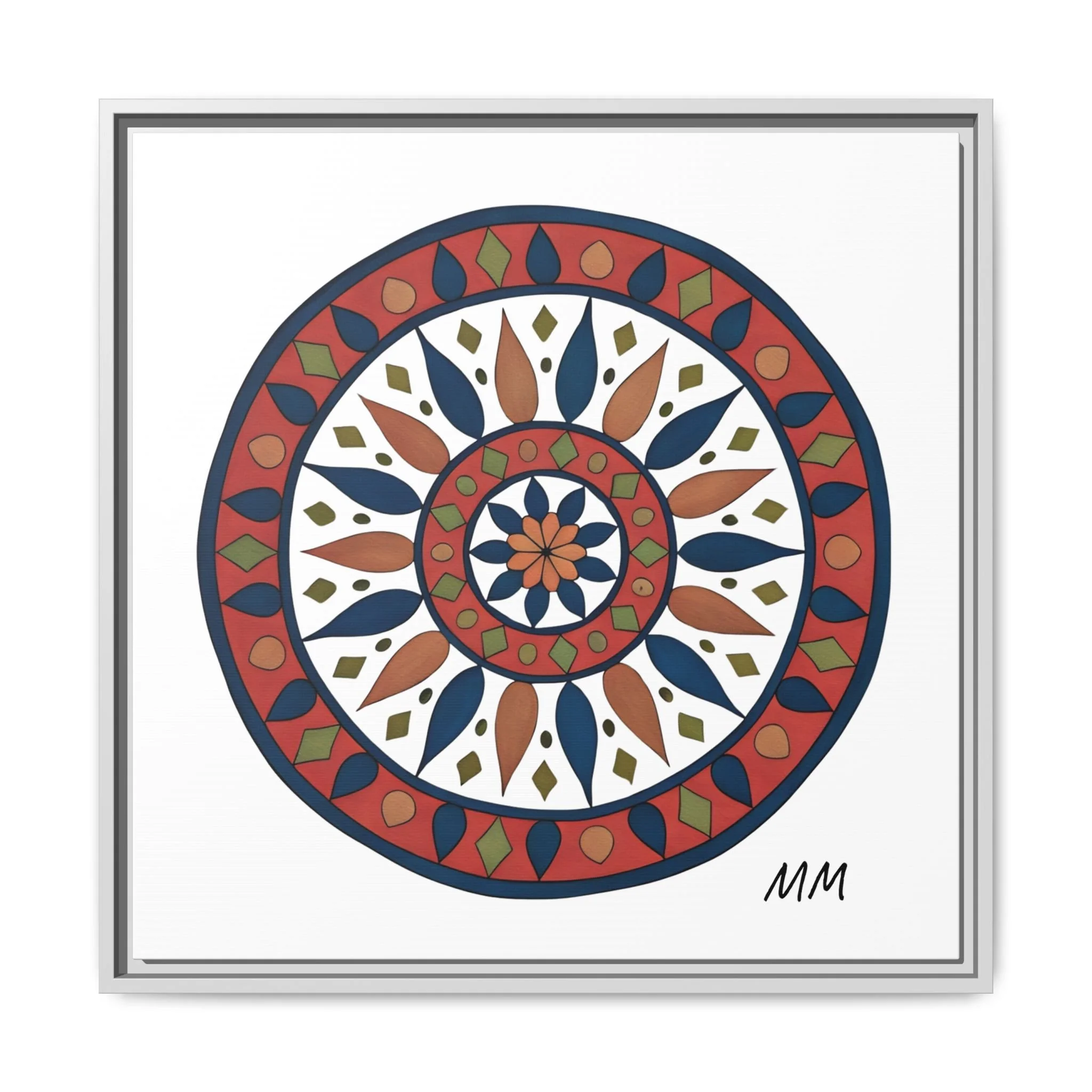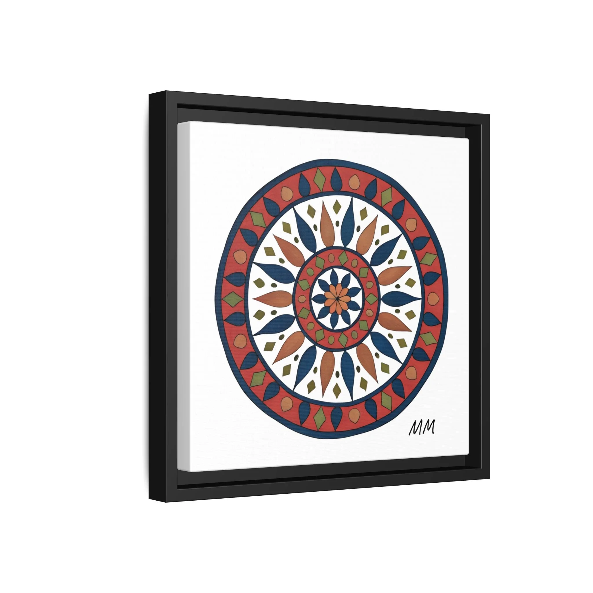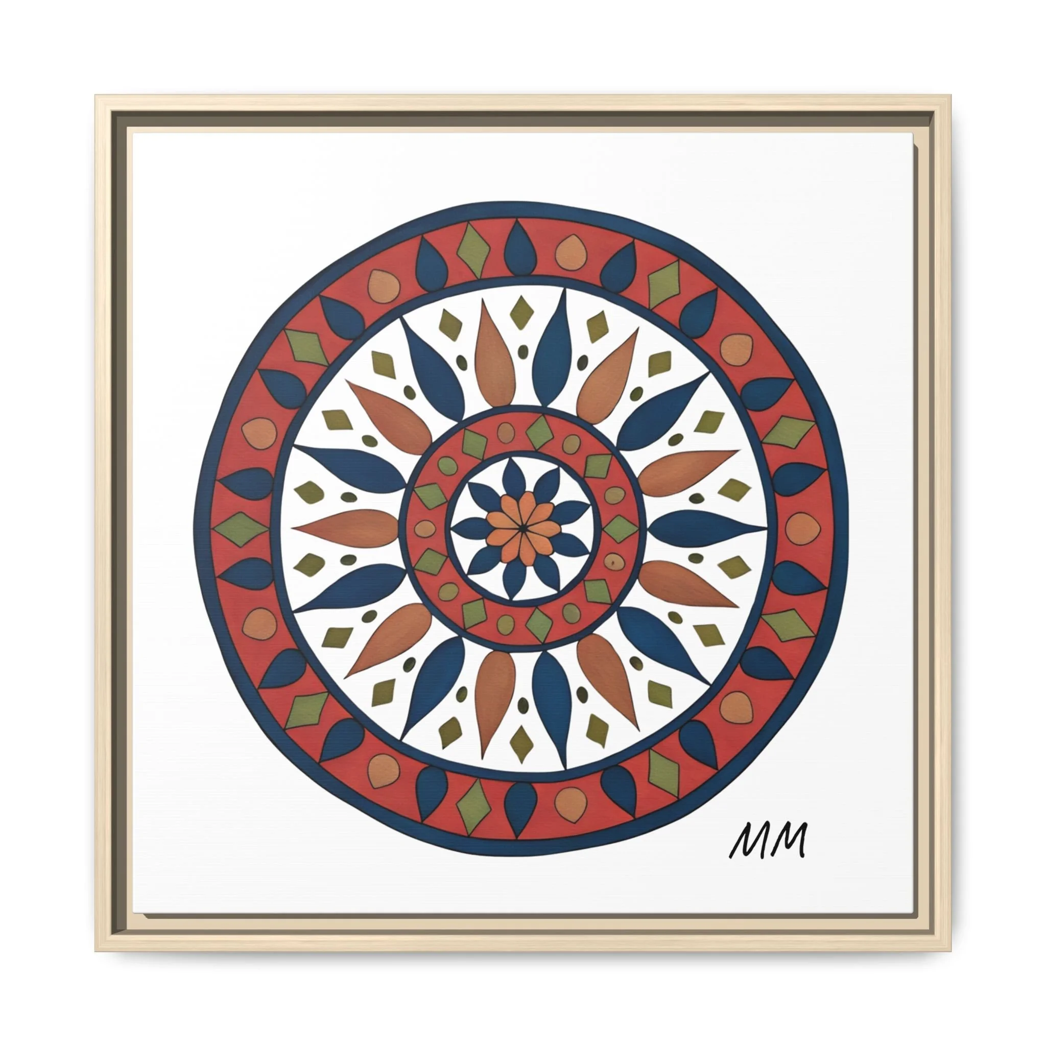 This framed matte canvas brings calm geometry and warm, earthy color into a room. The circular mandala-like design uses deep reds, navy, olive and terracotta tones that read both modern and handmade. Mounted on a slender pine frame with a soft-matte coating, the print keeps reflections low so the pattern reads clearly from across the room. It settles well above a console, in a reading nook, or as part of a gallery wall — adding quiet structure and a hand-drawn feel to everyday spaces.