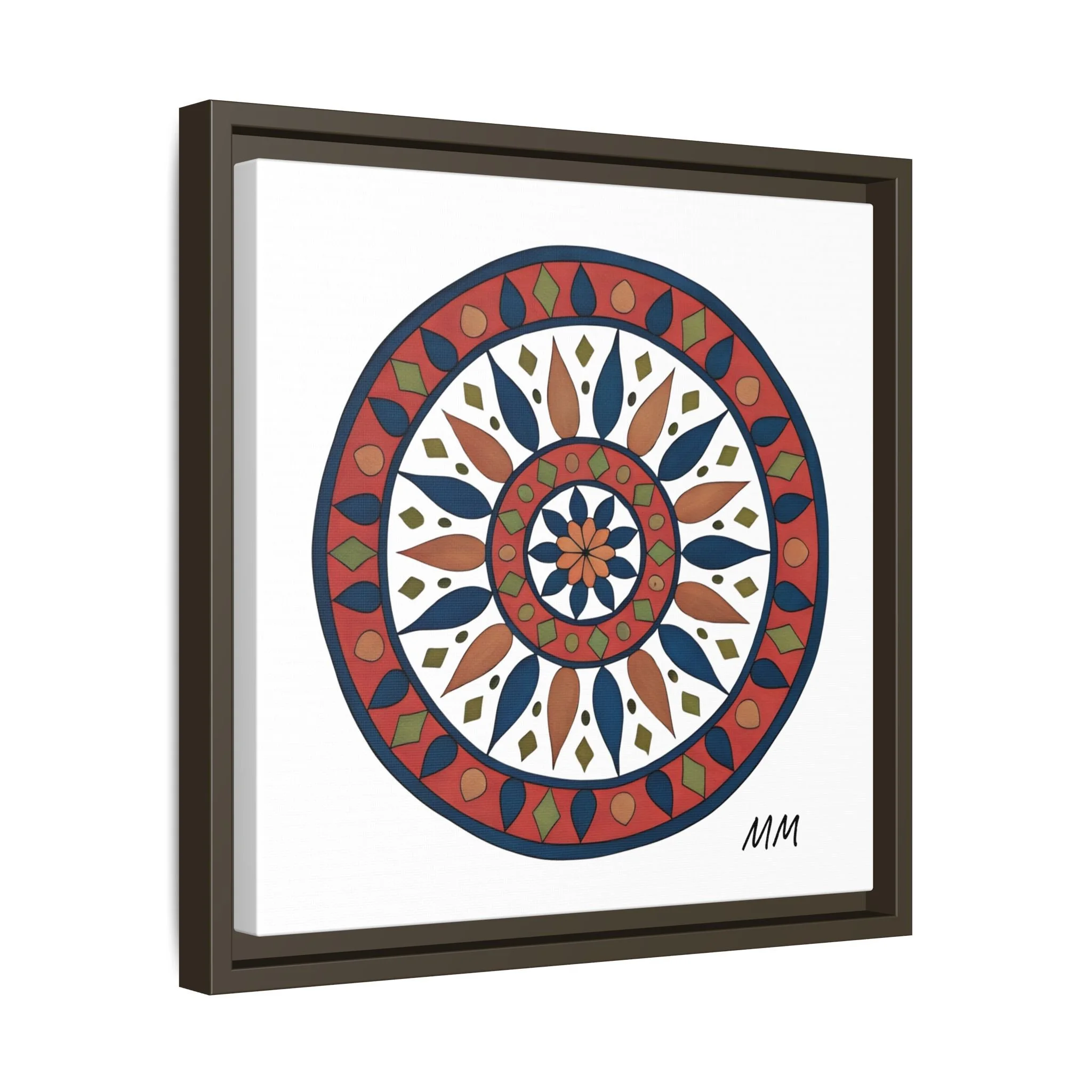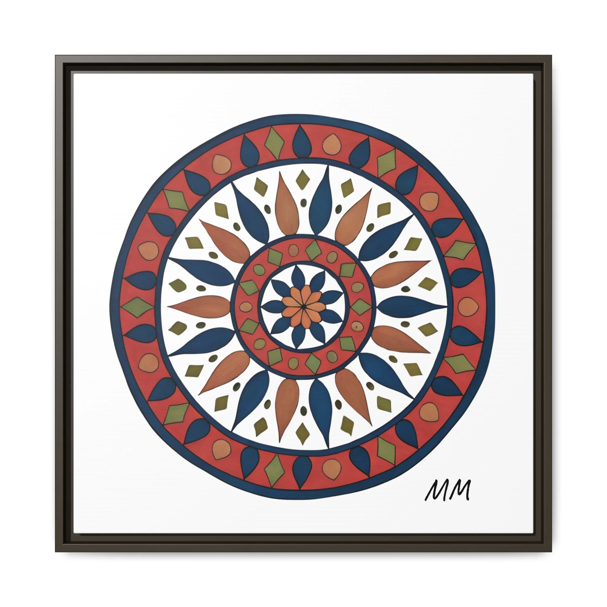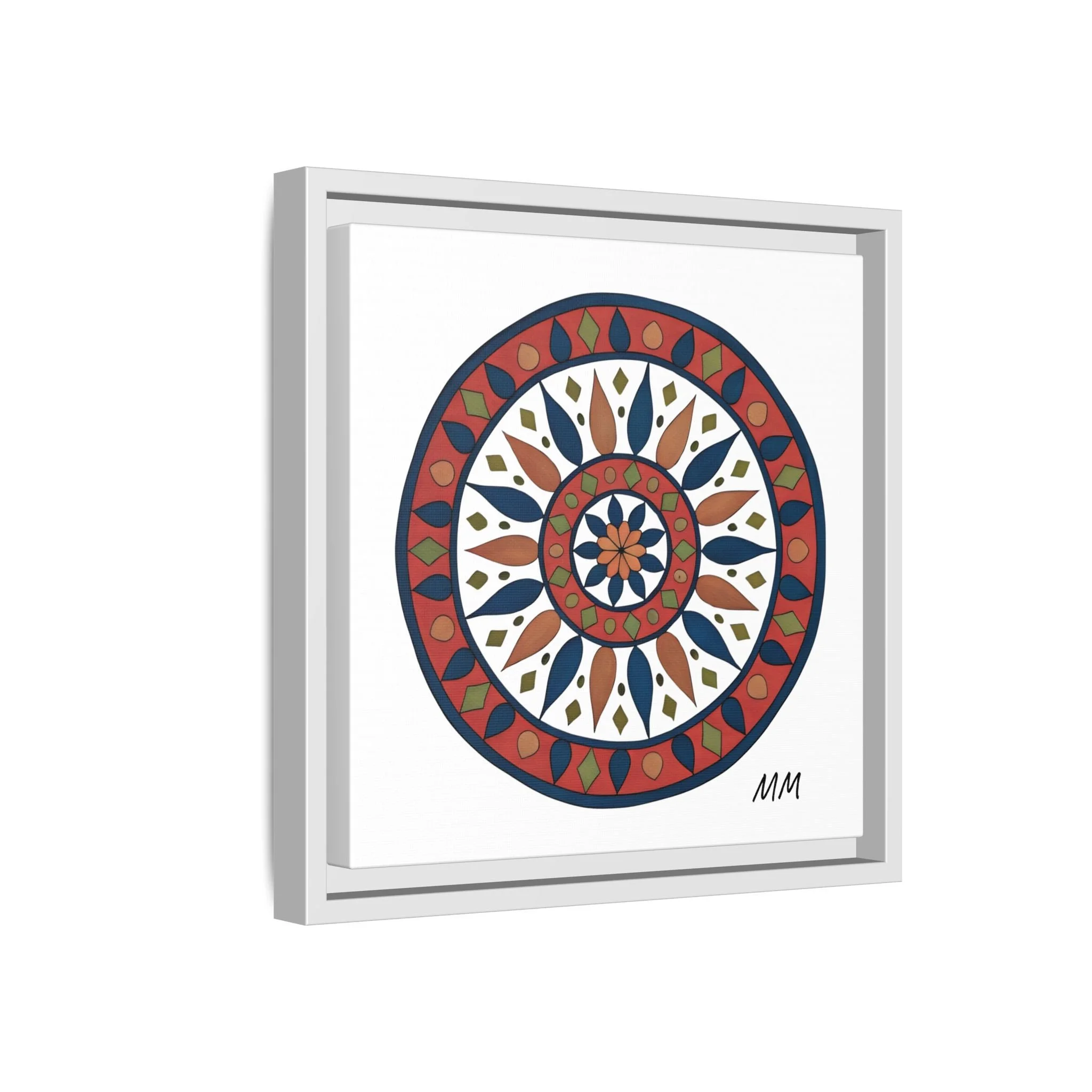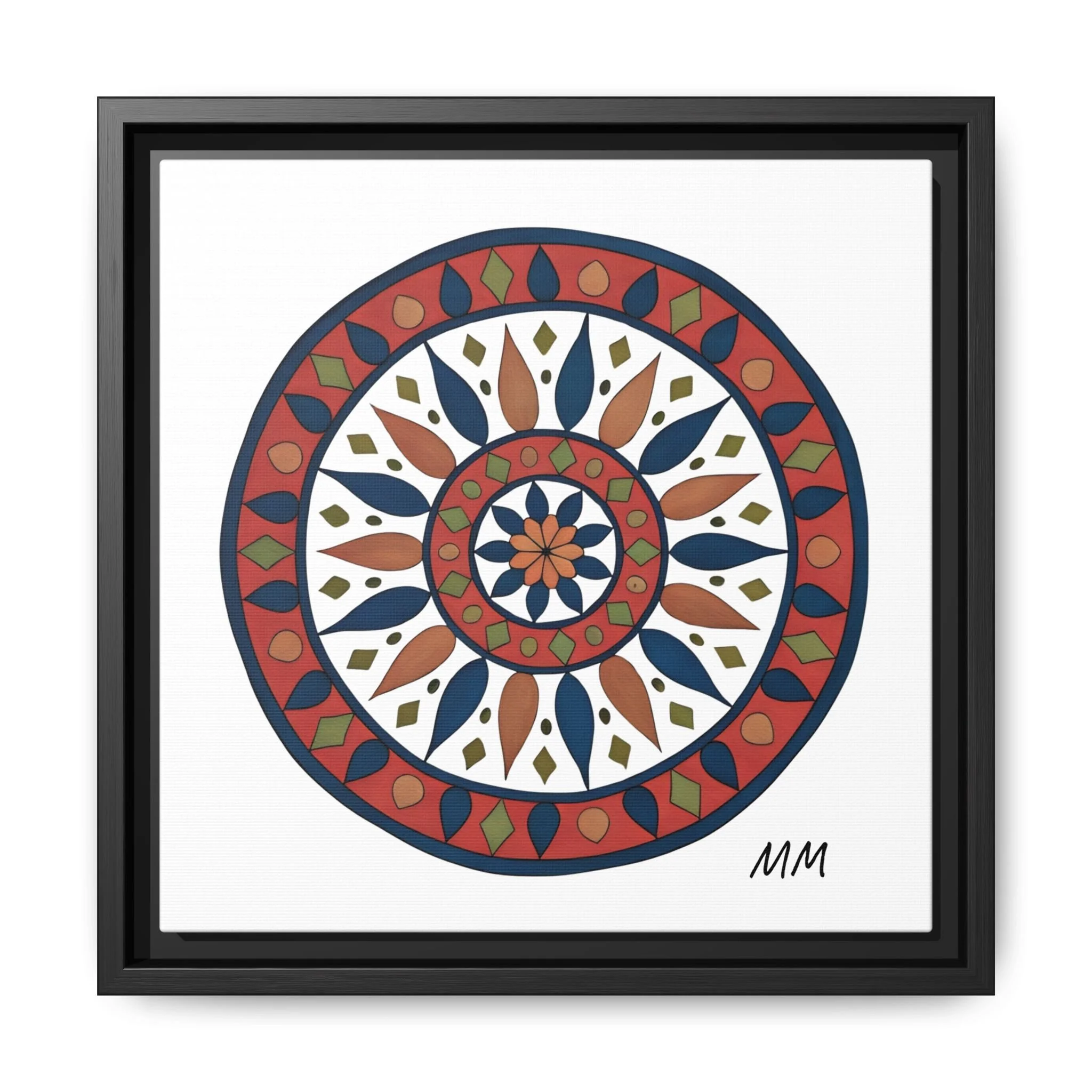 This framed matte canvas brings calm geometry and warm, earthy color into a room. The circular mandala-like design uses deep reds, navy, olive and terracotta tones that read both modern and handmade. Mounted on a slender pine frame with a soft-matte coating, the print keeps reflections low so the pattern reads clearly from across the room. It settles well above a console, in a reading nook, or as part of a gallery wall — adding quiet structure and a hand-drawn feel to everyday spaces.