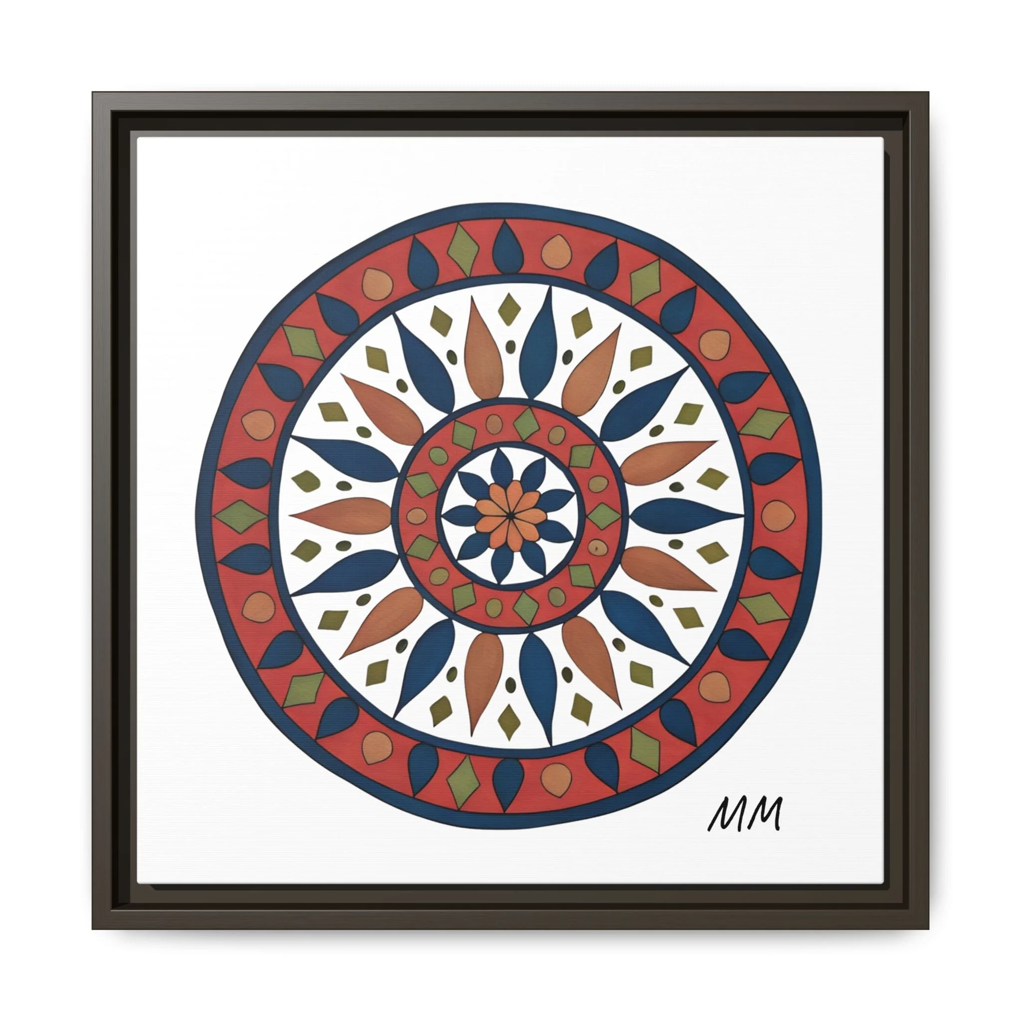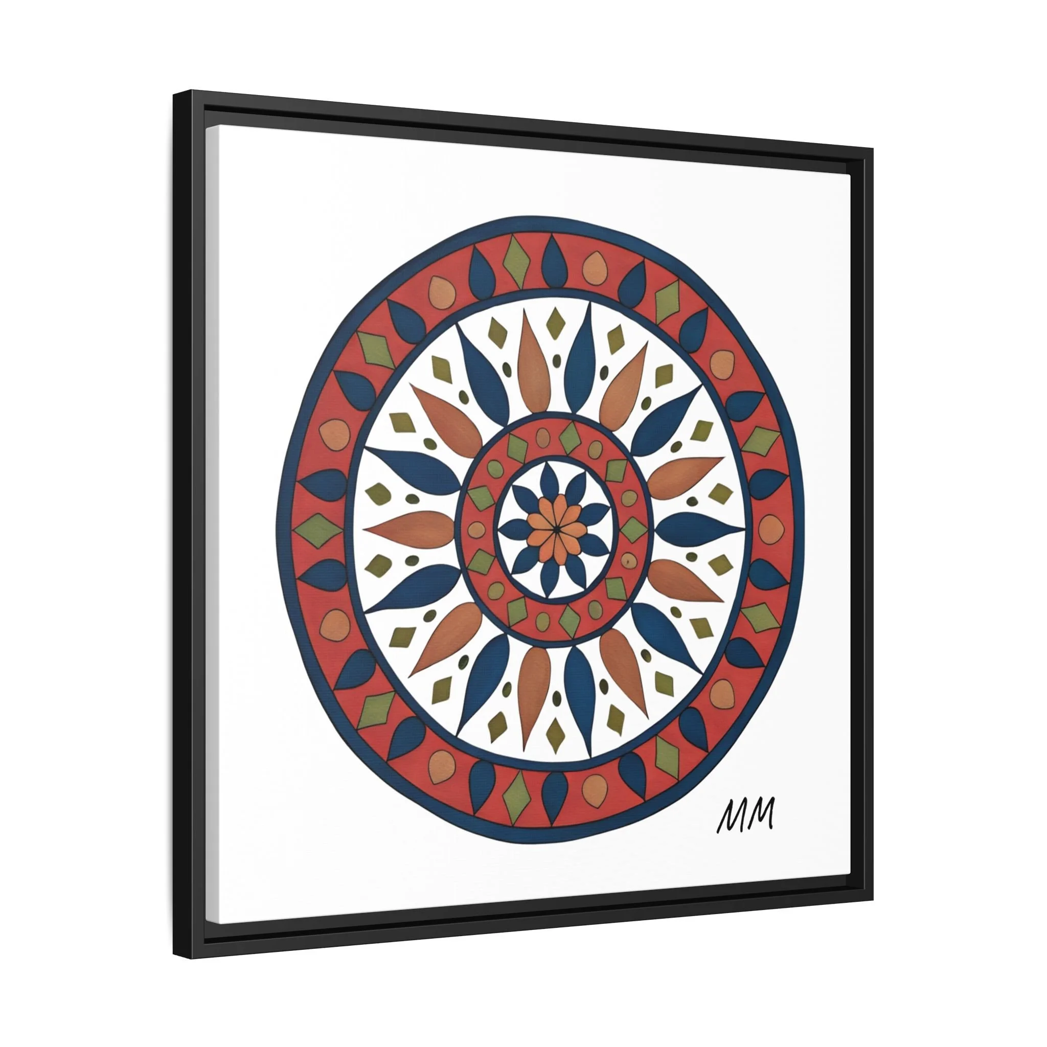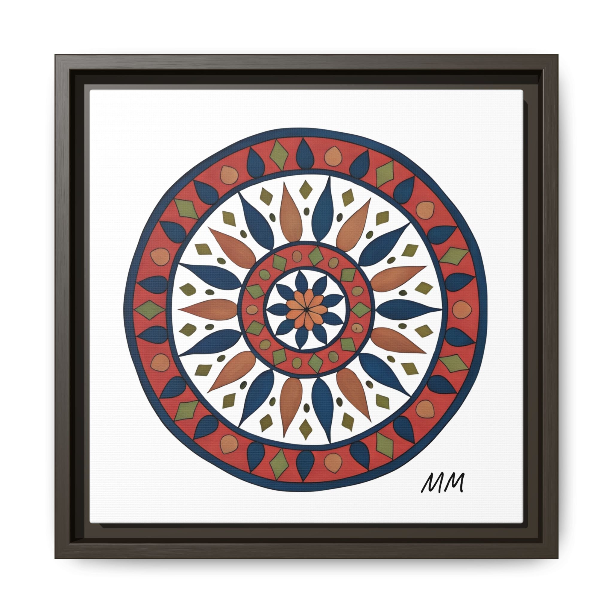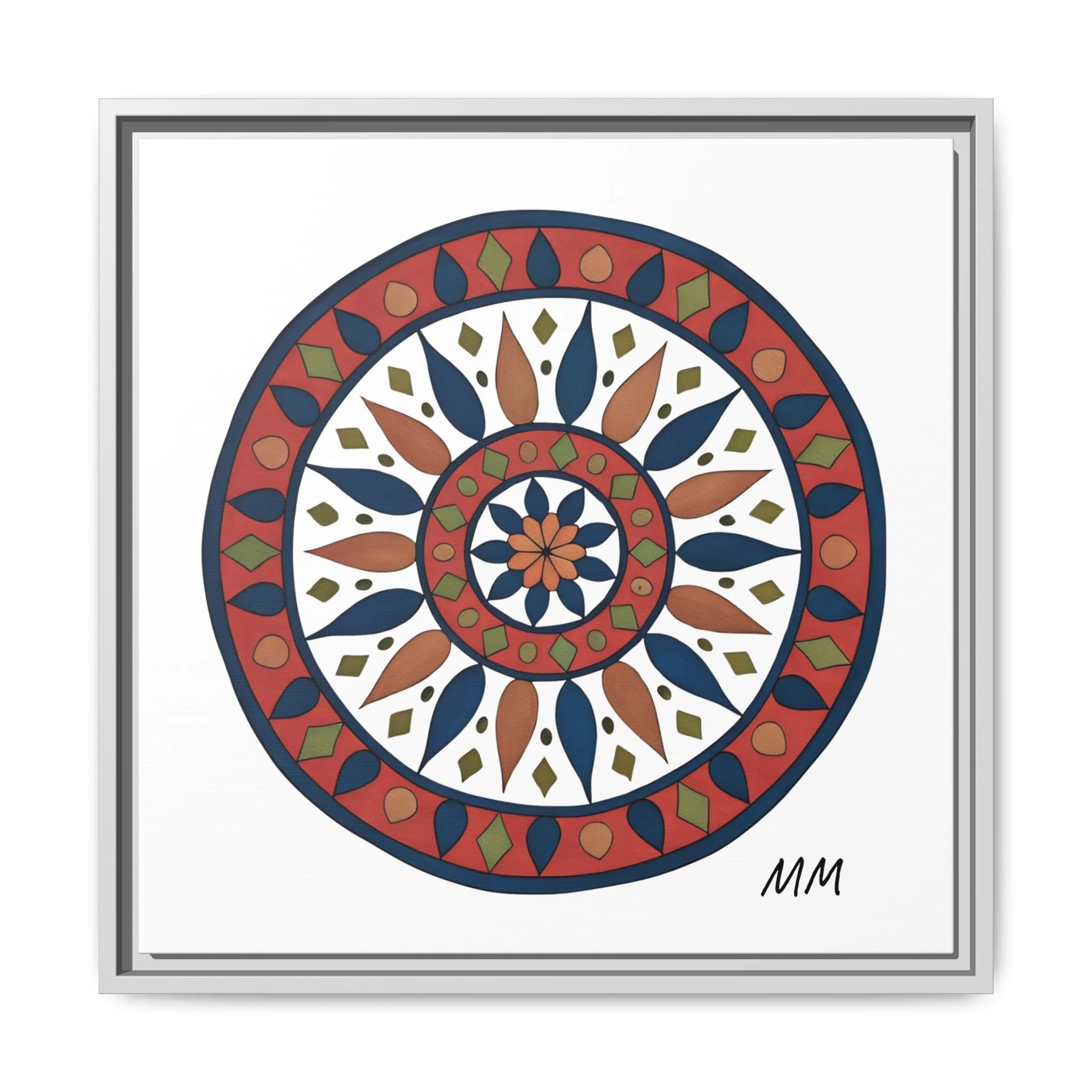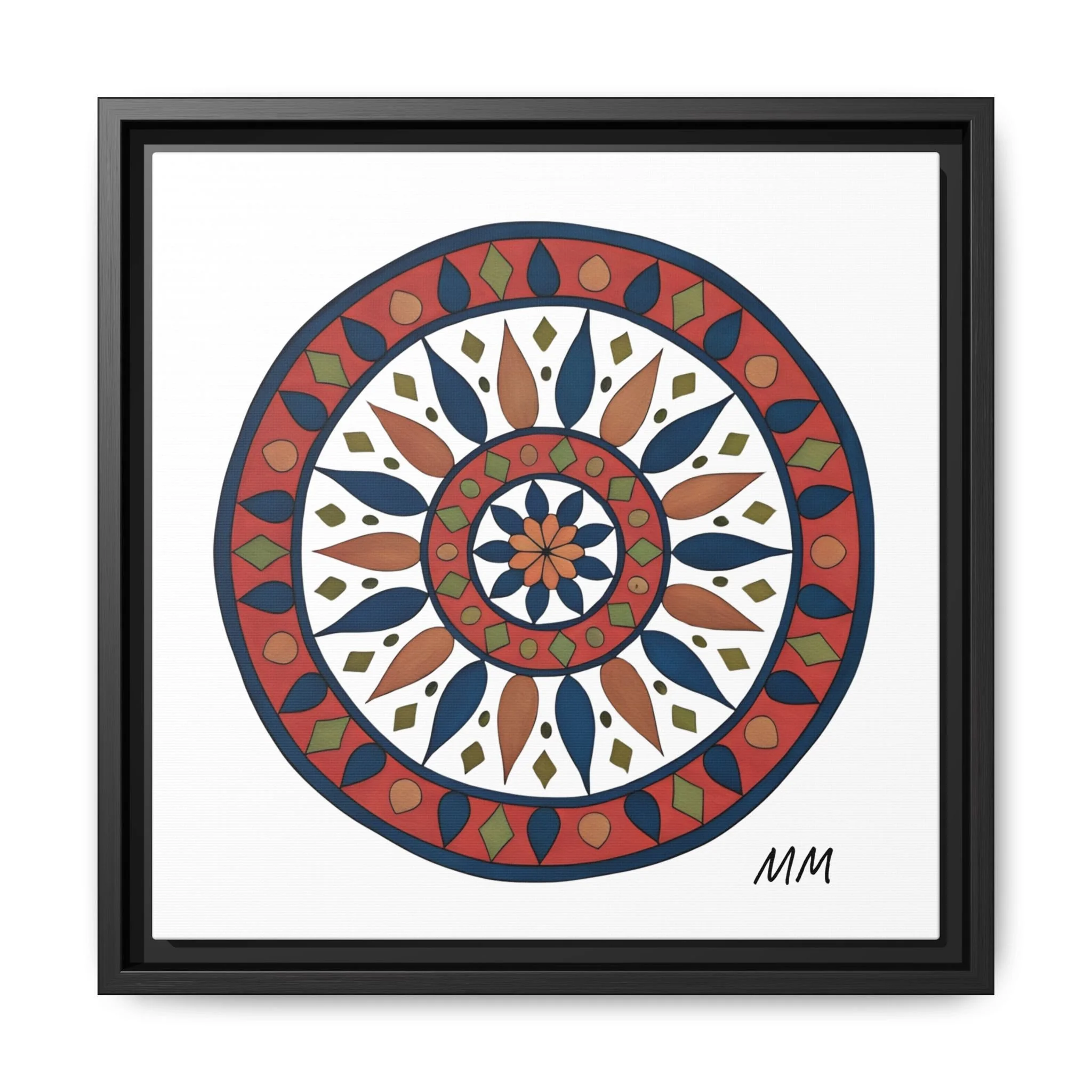 This framed matte canvas brings calm geometry and warm, earthy color into a room. The circular mandala-like design uses deep reds, navy, olive and terracotta tones that read both modern and handmade. Mounted on a slender pine frame with a soft-matte coating, the print keeps reflections low so the pattern reads clearly from across the room. It settles well above a console, in a reading nook, or as part of a gallery wall — adding quiet structure and a hand-drawn feel to everyday spaces.