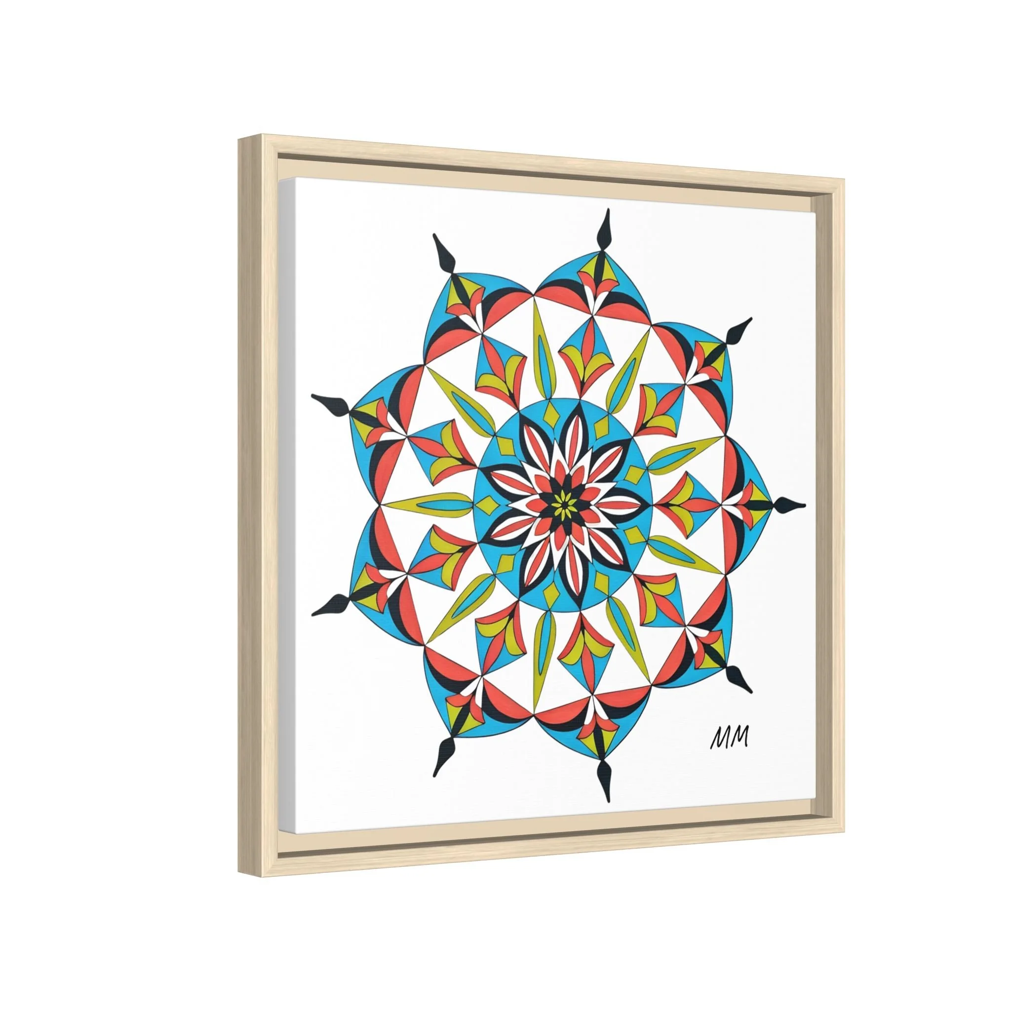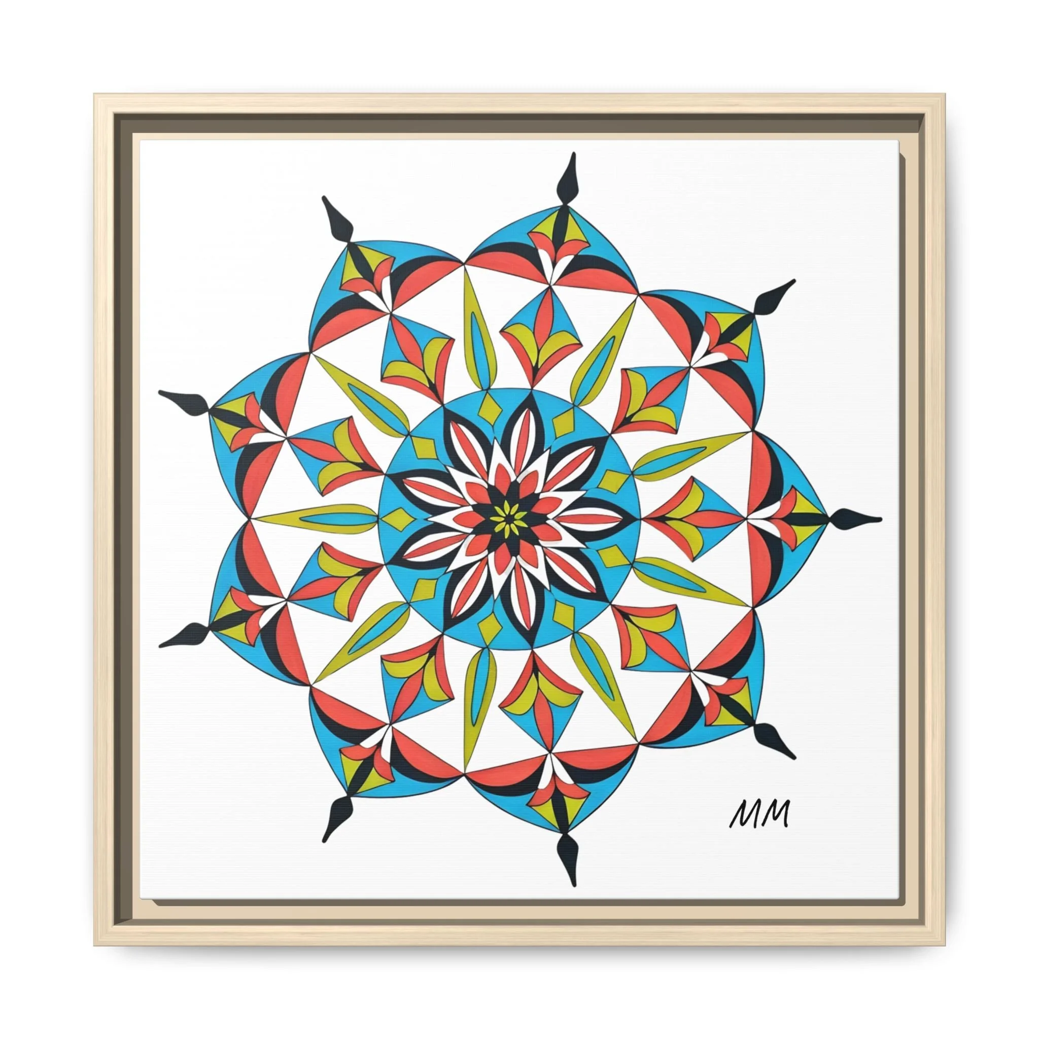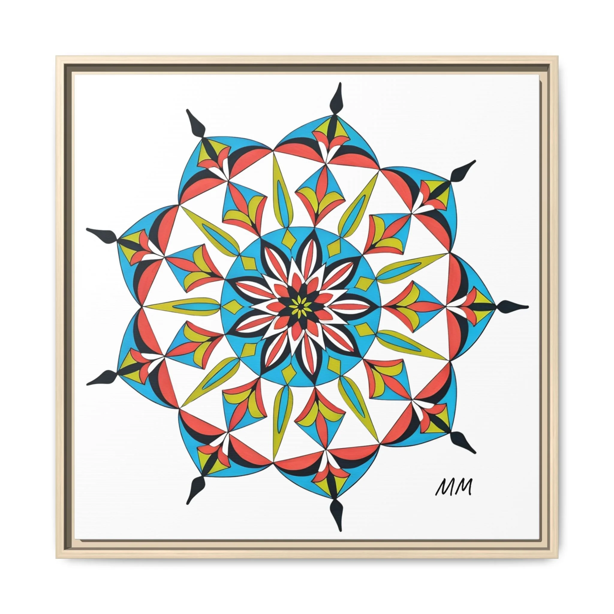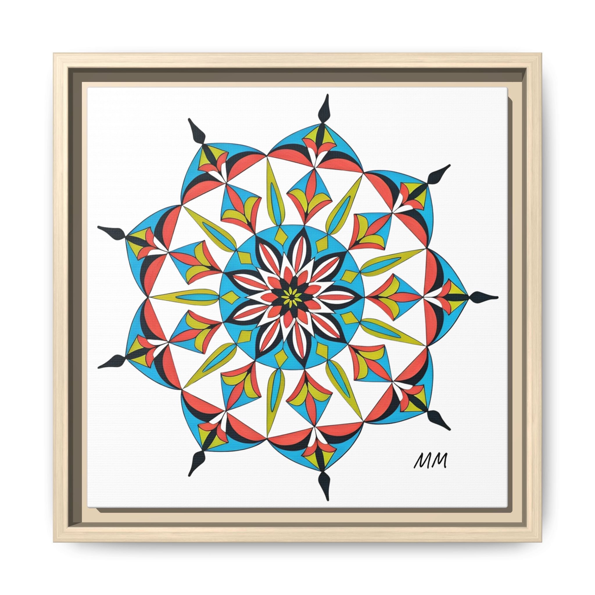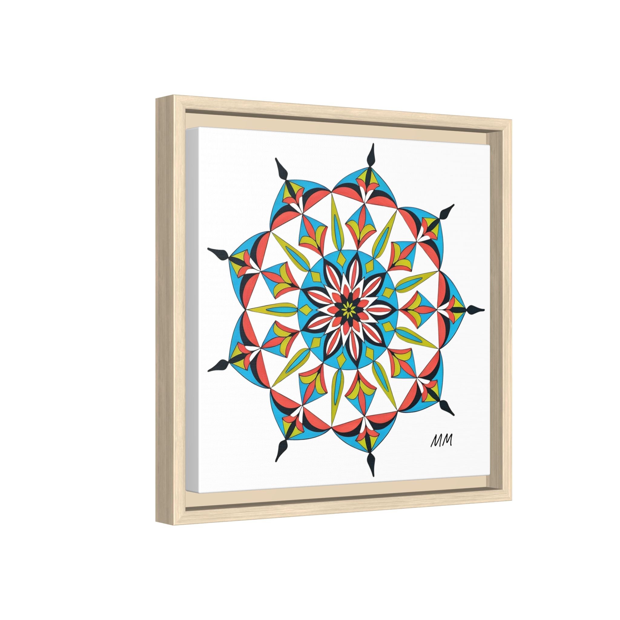 This framed matte canvas brings a burst of handcrafted pattern and color into a calm, modern space. The mandala-like design balances bright cyan, coral, lime and black in delicate, petal-shaped forms that draw the eye inward. Hung in an entryway, above a console, or paired in a gallery wall, the piece feels like a quiet celebration — lively yet measured. The slim pine frame and matte finish keep the focus on texture and line, so the artwork reads crisp from across a room and intimate up close. For someone who collects bold geometry or seeks a playful anchor for minimalist decor, this canvas settles into daily life and lifts the mood without shouting.