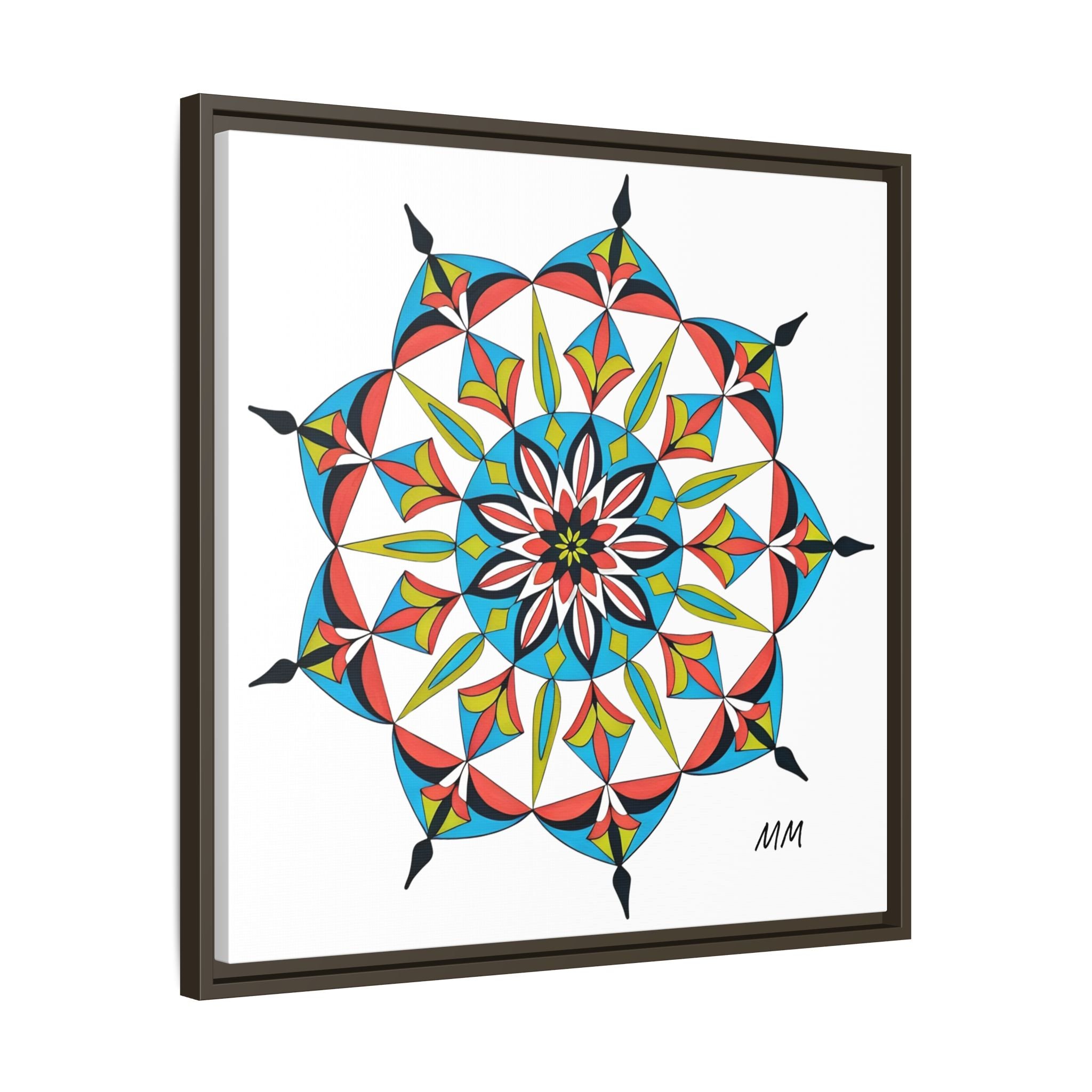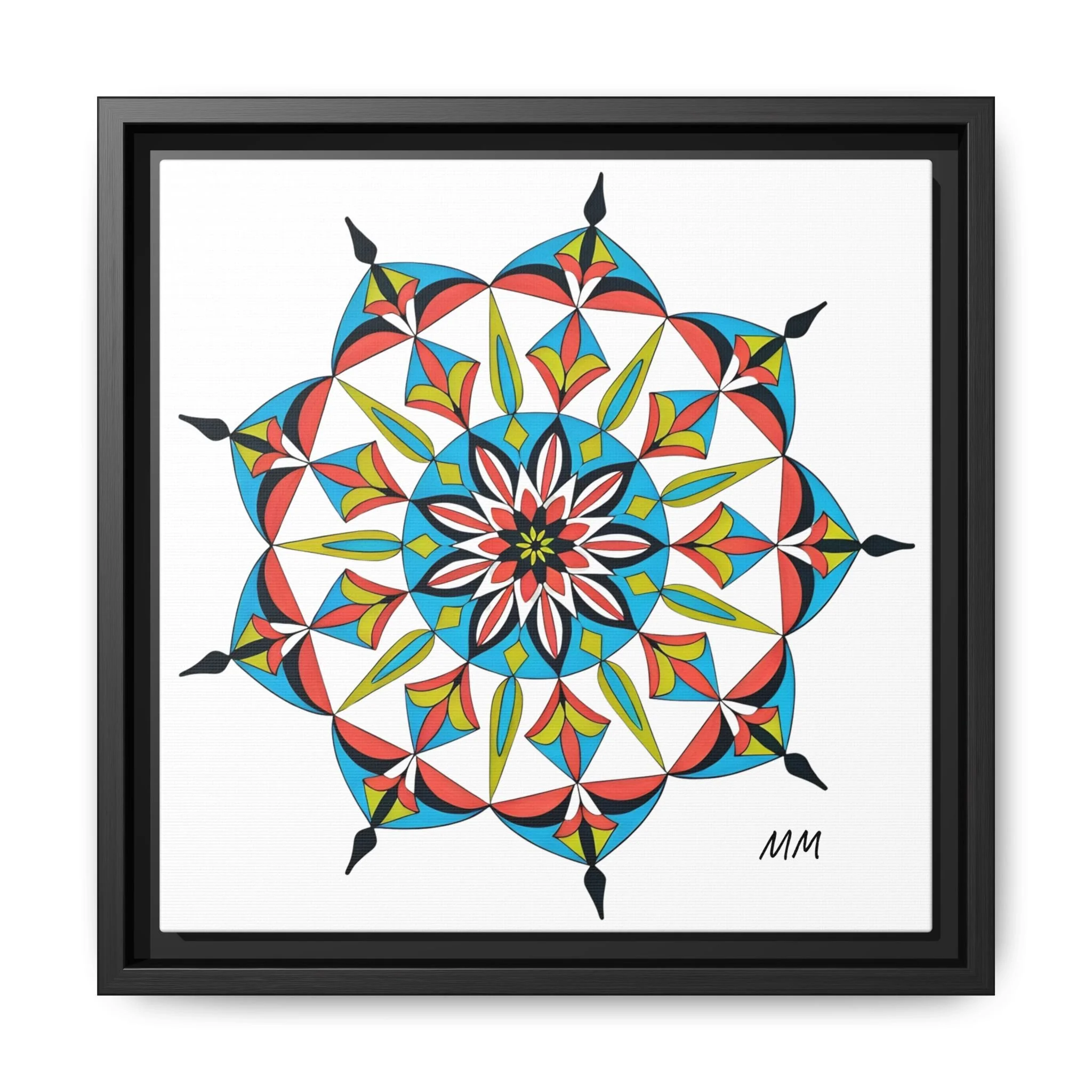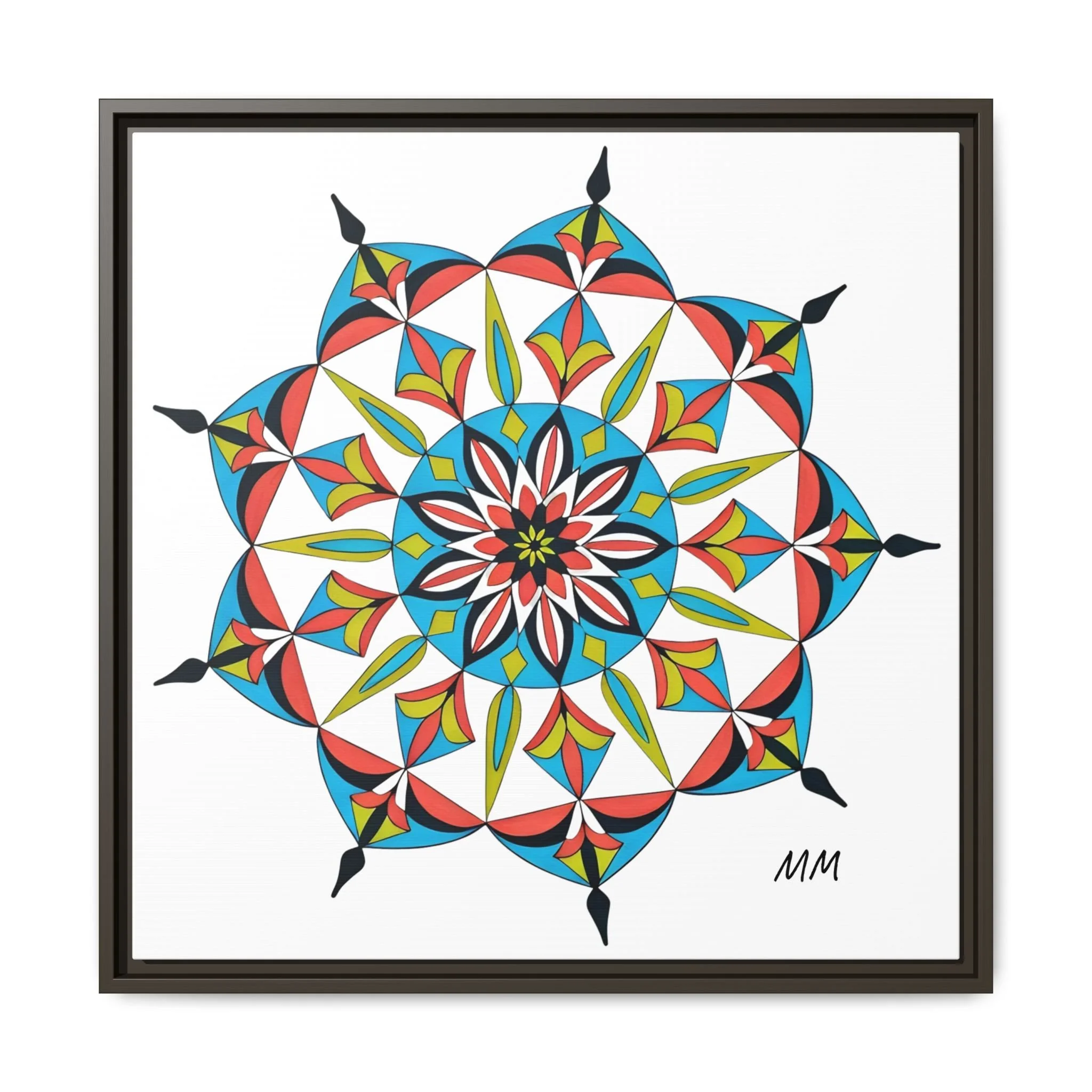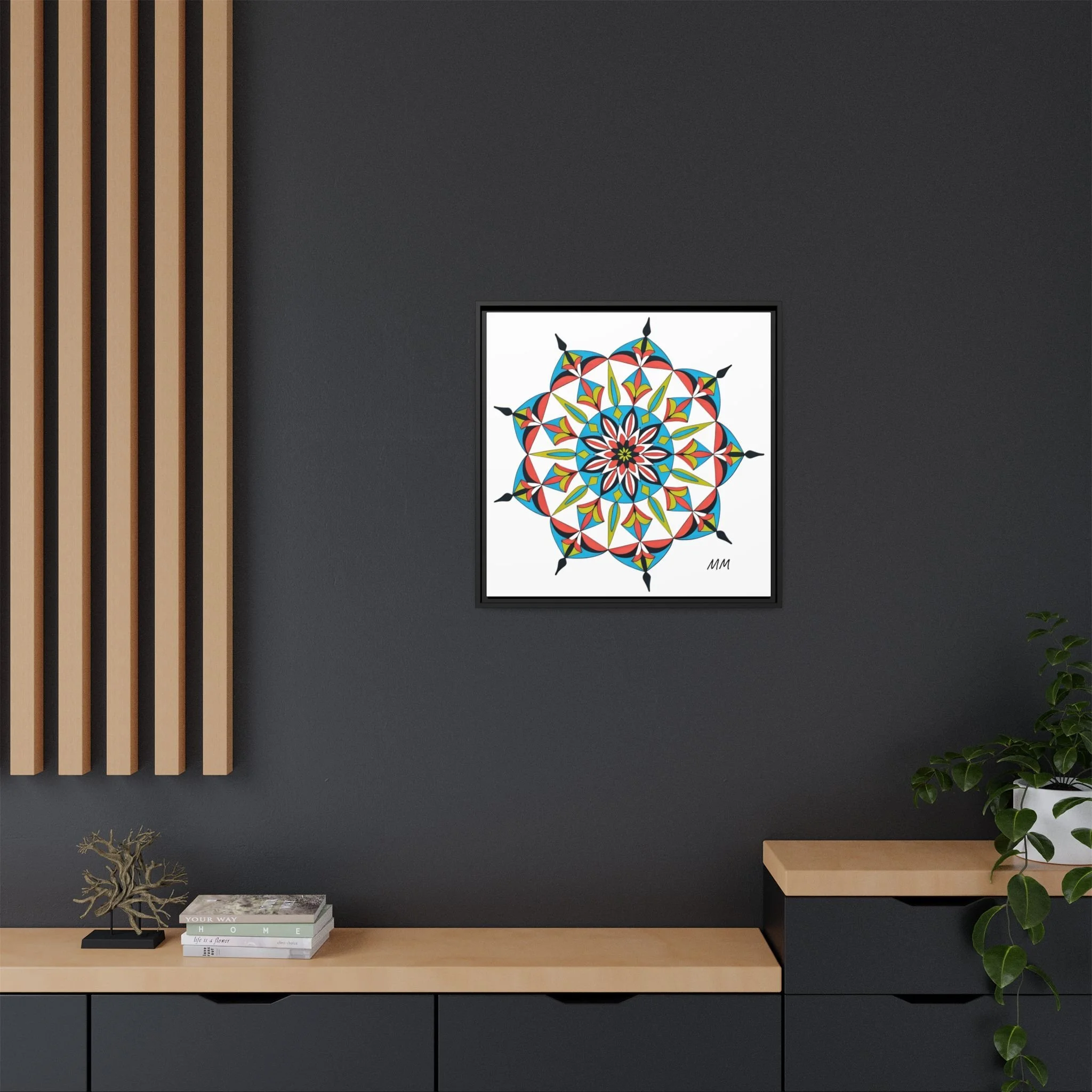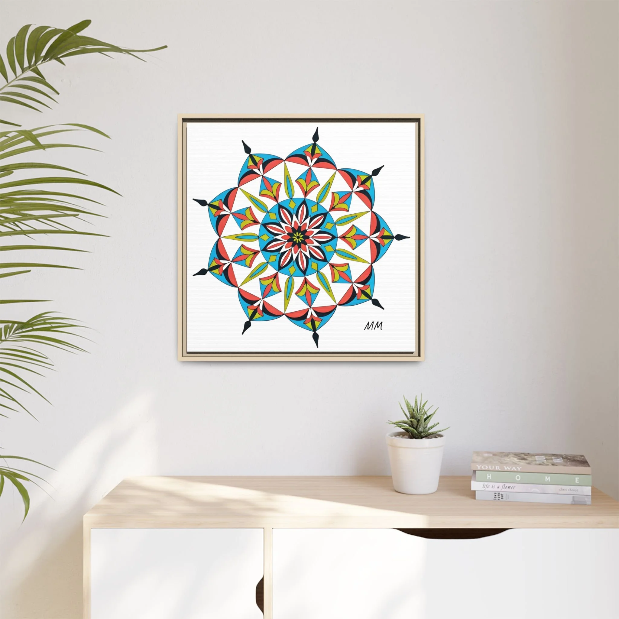 This framed matte canvas brings a burst of handcrafted pattern and color into a calm, modern space. The mandala-like design balances bright cyan, coral, lime and black in delicate, petal-shaped forms that draw the eye inward. Hung in an entryway, above a console, or paired in a gallery wall, the piece feels like a quiet celebration — lively yet measured. The slim pine frame and matte finish keep the focus on texture and line, so the artwork reads crisp from across a room and intimate up close. For someone who collects bold geometry or seeks a playful anchor for minimalist decor, this canvas settles into daily life and lifts the mood without shouting.