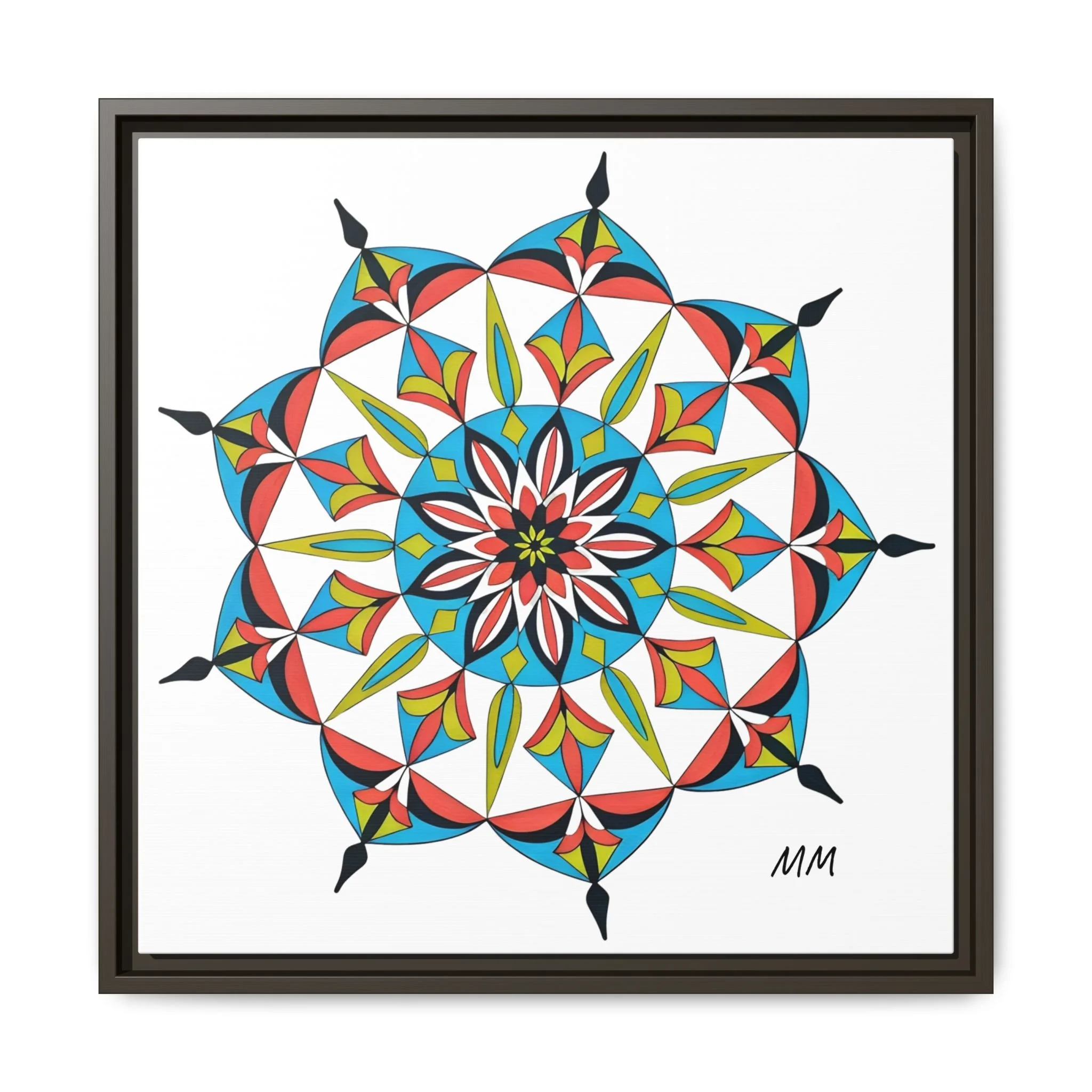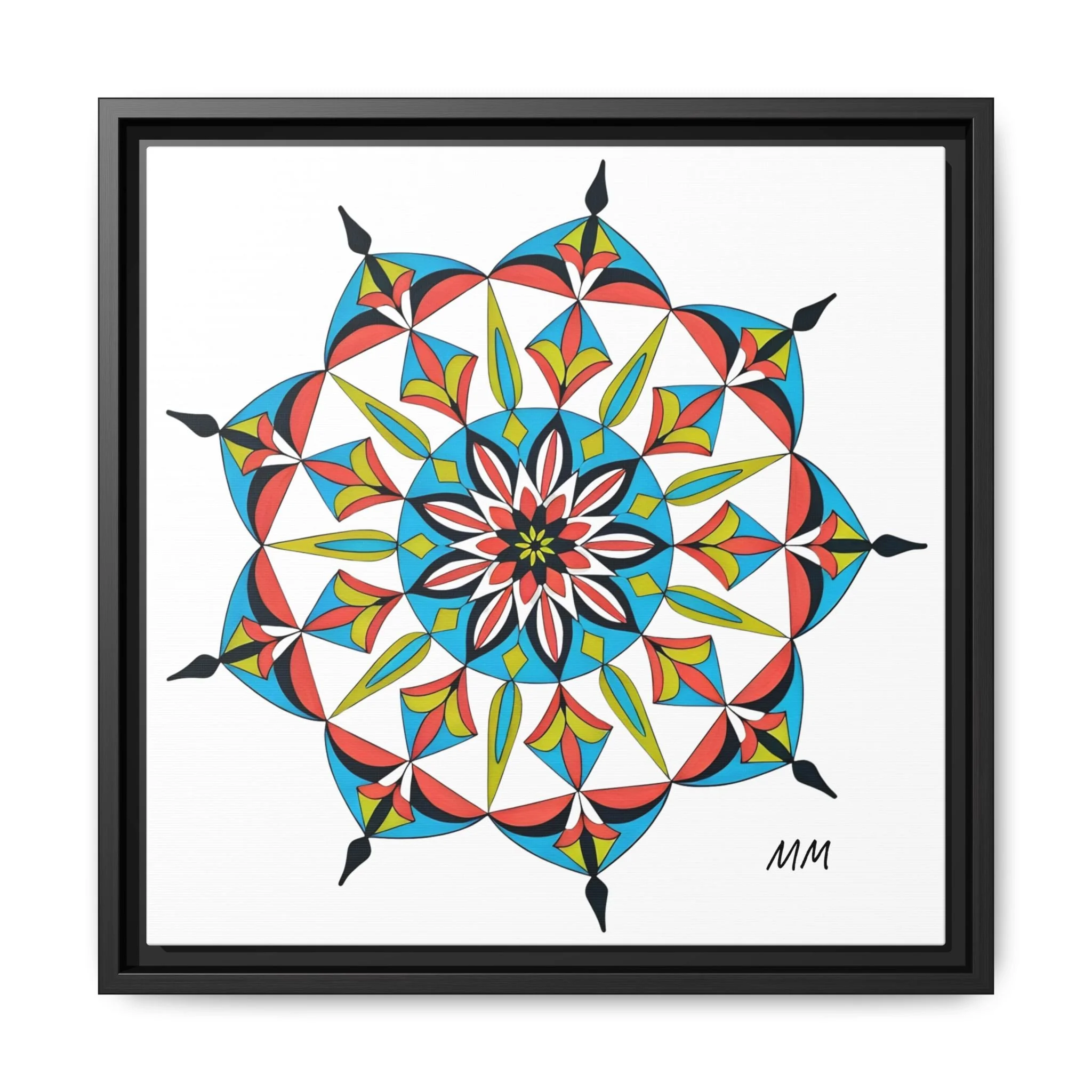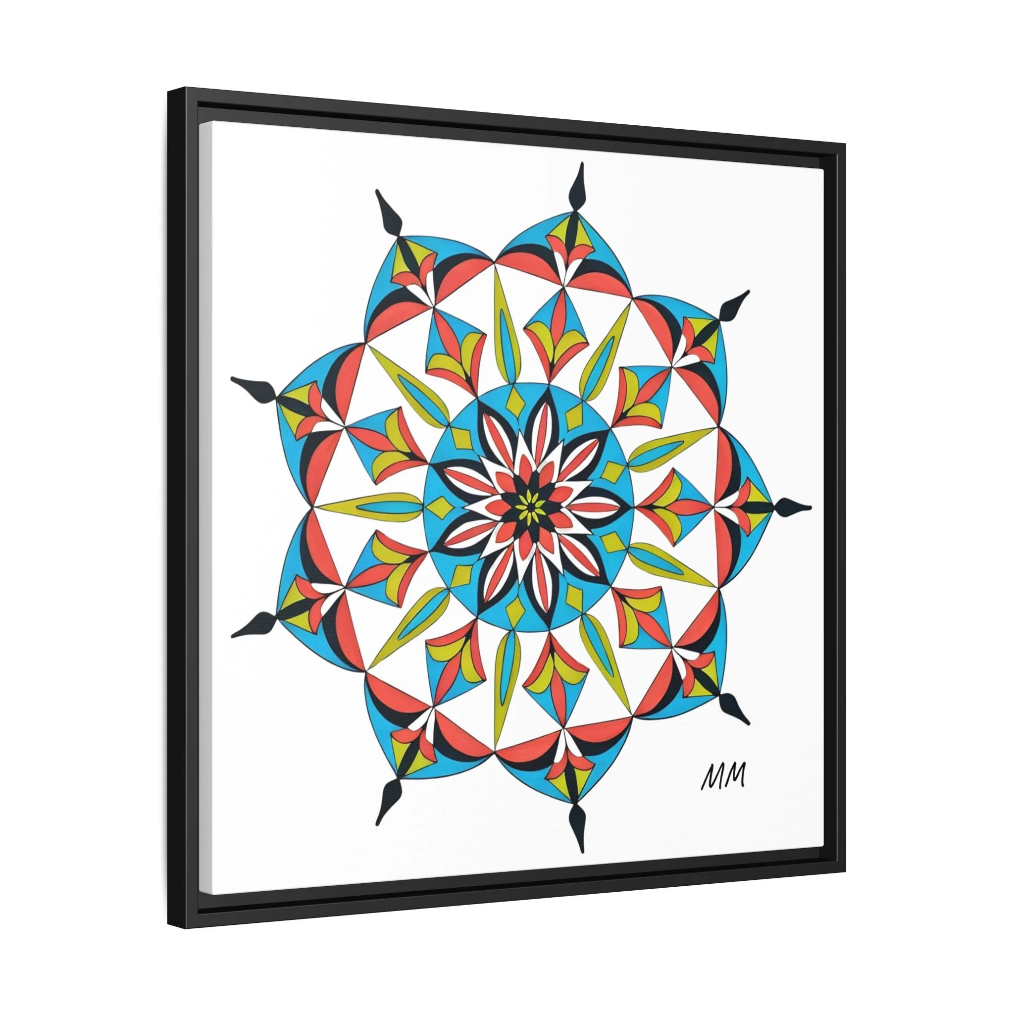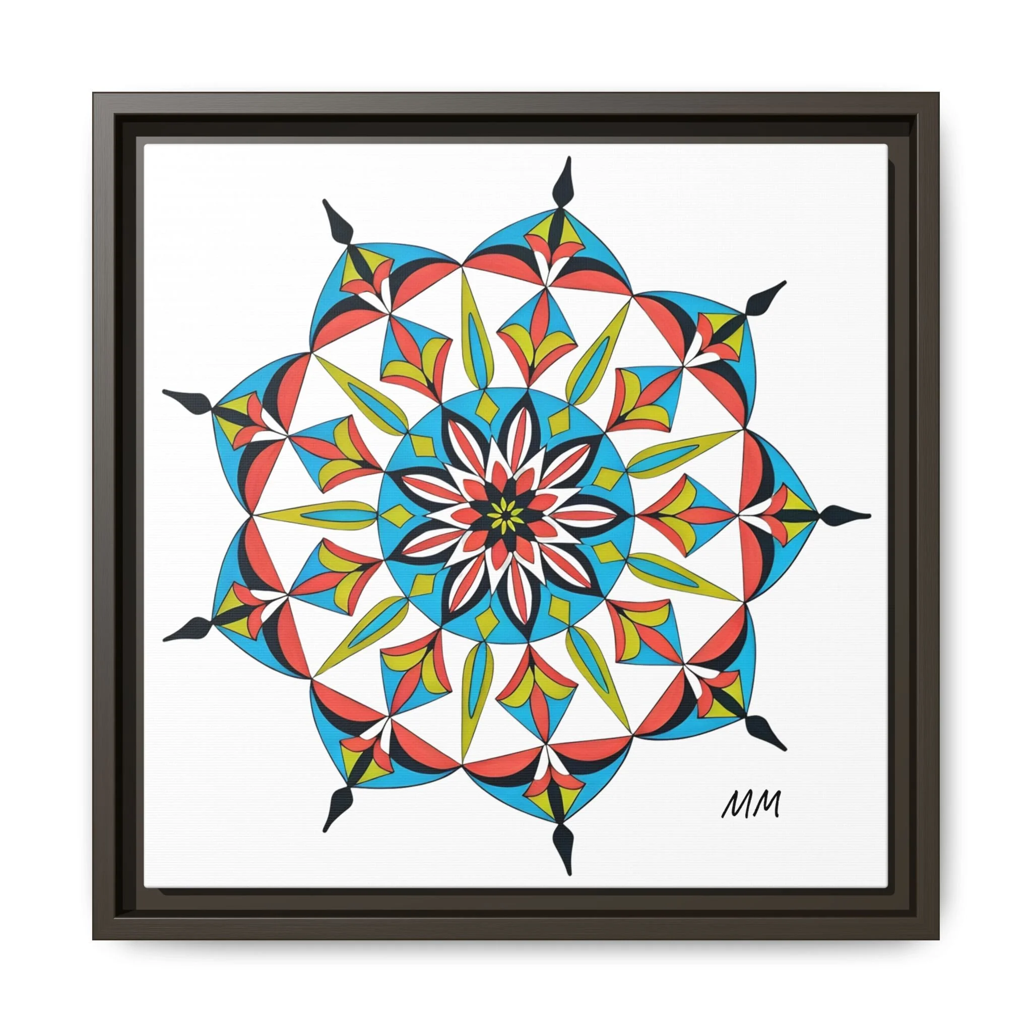 This framed matte canvas brings a burst of handcrafted pattern and color into a calm, modern space. The mandala-like design balances bright cyan, coral, lime and black in delicate, petal-shaped forms that draw the eye inward. Hung in an entryway, above a console, or paired in a gallery wall, the piece feels like a quiet celebration — lively yet measured. The slim pine frame and matte finish keep the focus on texture and line, so the artwork reads crisp from across a room and intimate up close. For someone who collects bold geometry or seeks a playful anchor for minimalist decor, this canvas settles into daily life and lifts the mood without shouting.