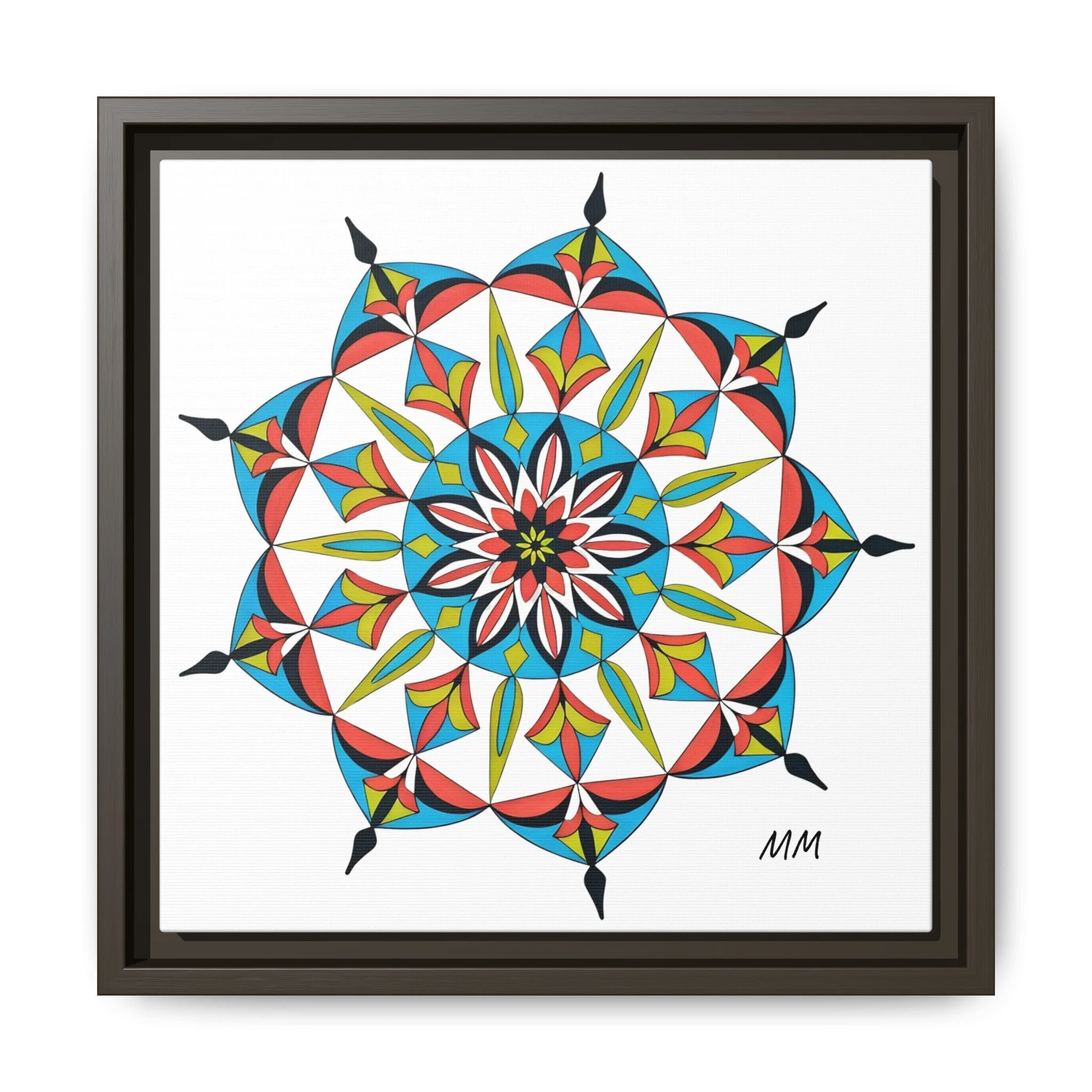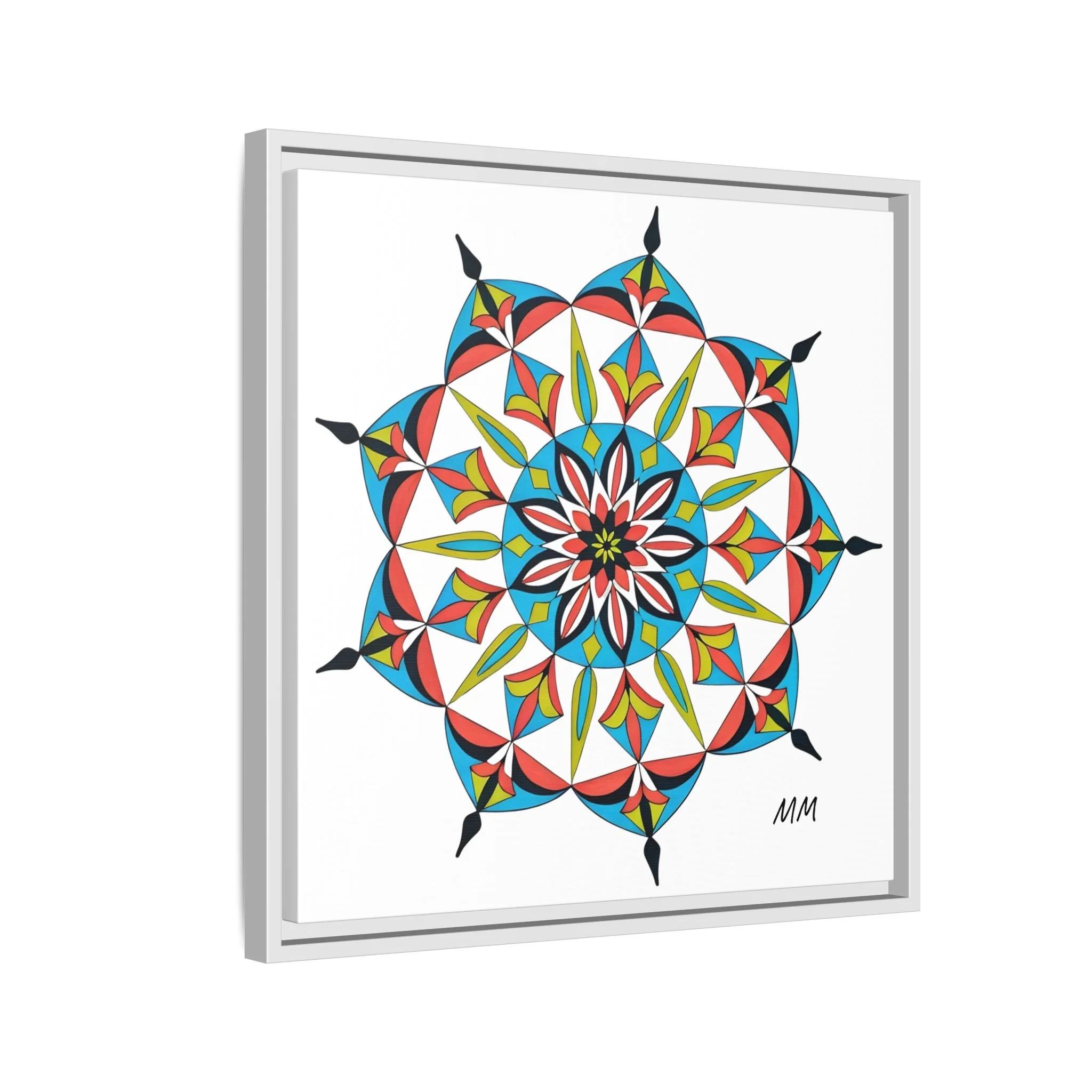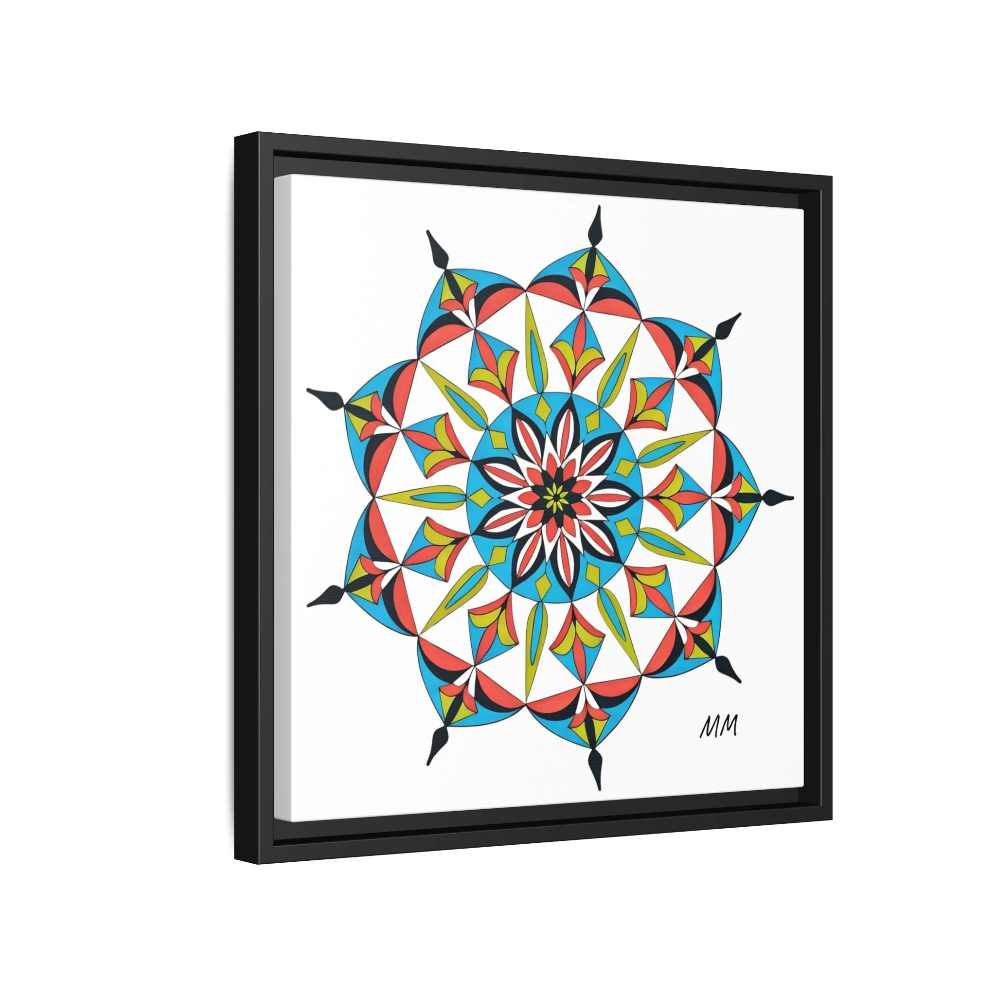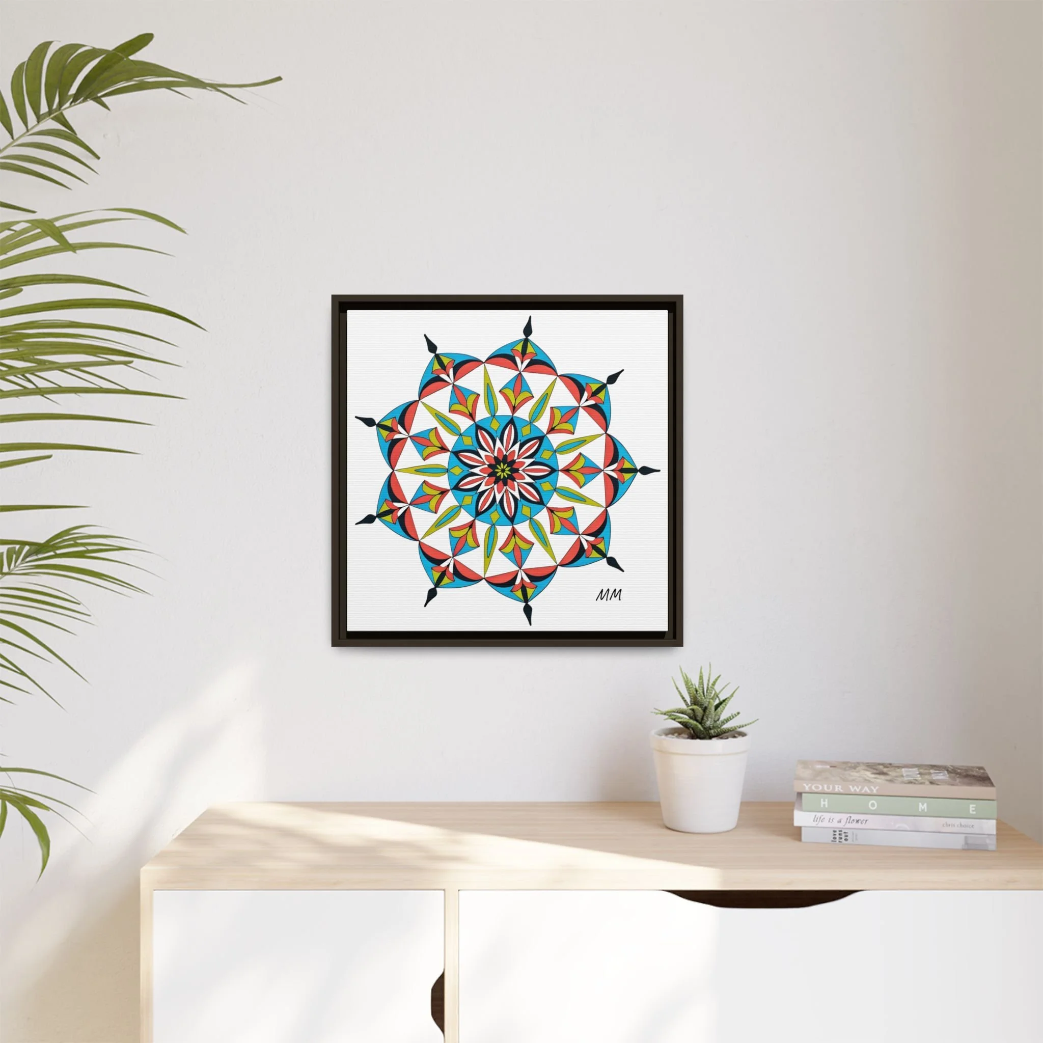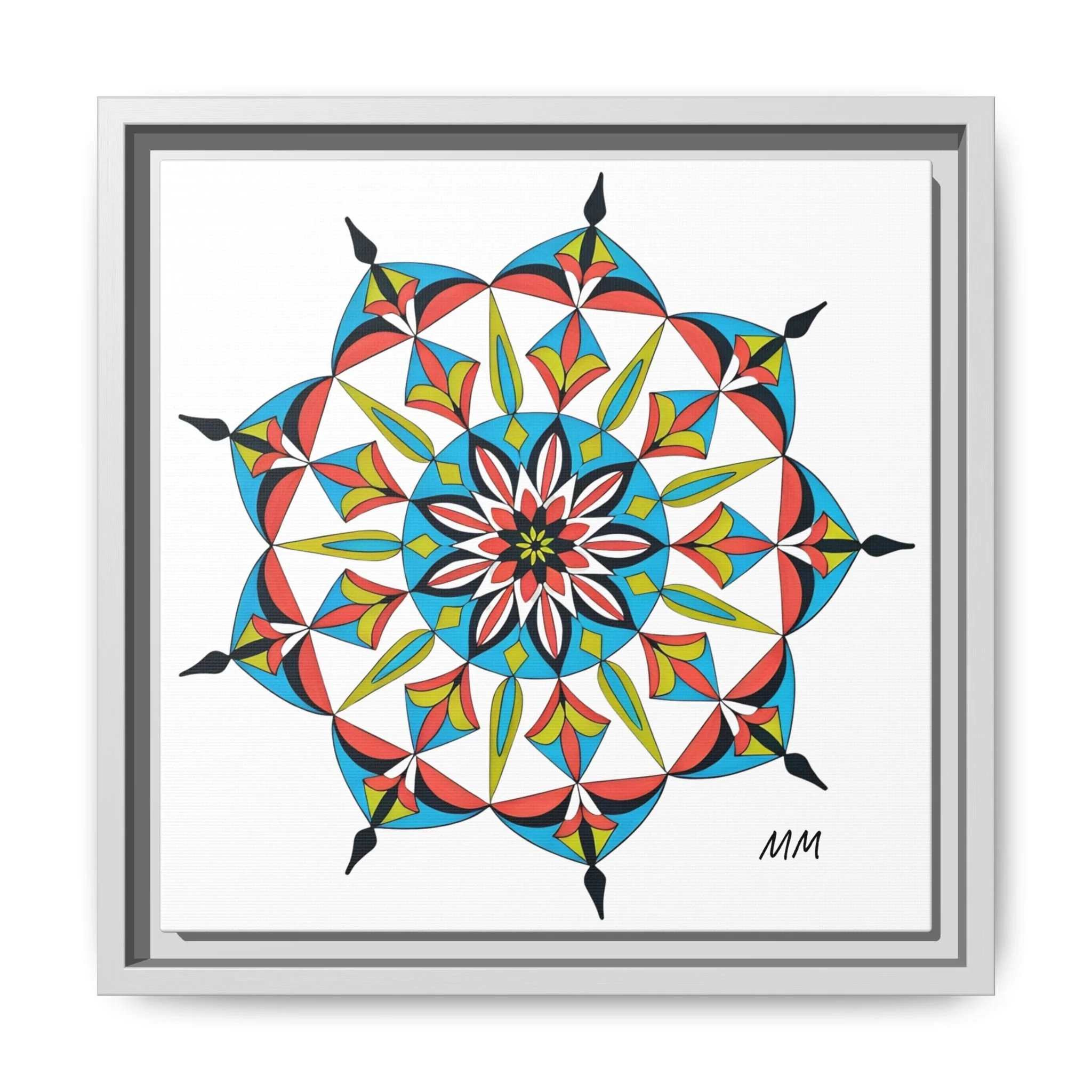 This framed matte canvas brings a burst of handcrafted pattern and color into a calm, modern space. The mandala-like design balances bright cyan, coral, lime and black in delicate, petal-shaped forms that draw the eye inward. Hung in an entryway, above a console, or paired in a gallery wall, the piece feels like a quiet celebration — lively yet measured. The slim pine frame and matte finish keep the focus on texture and line, so the artwork reads crisp from across a room and intimate up close. For someone who collects bold geometry or seeks a playful anchor for minimalist decor, this canvas settles into daily life and lifts the mood without shouting.