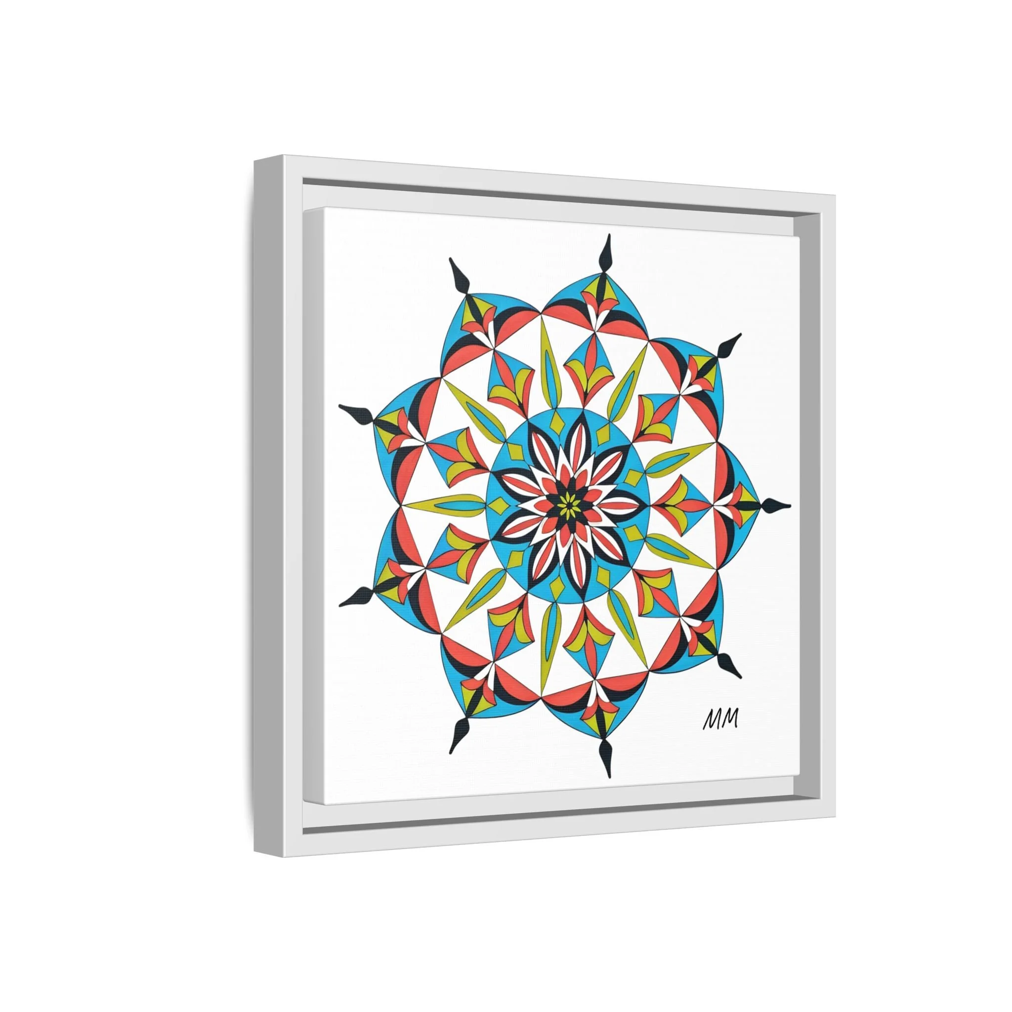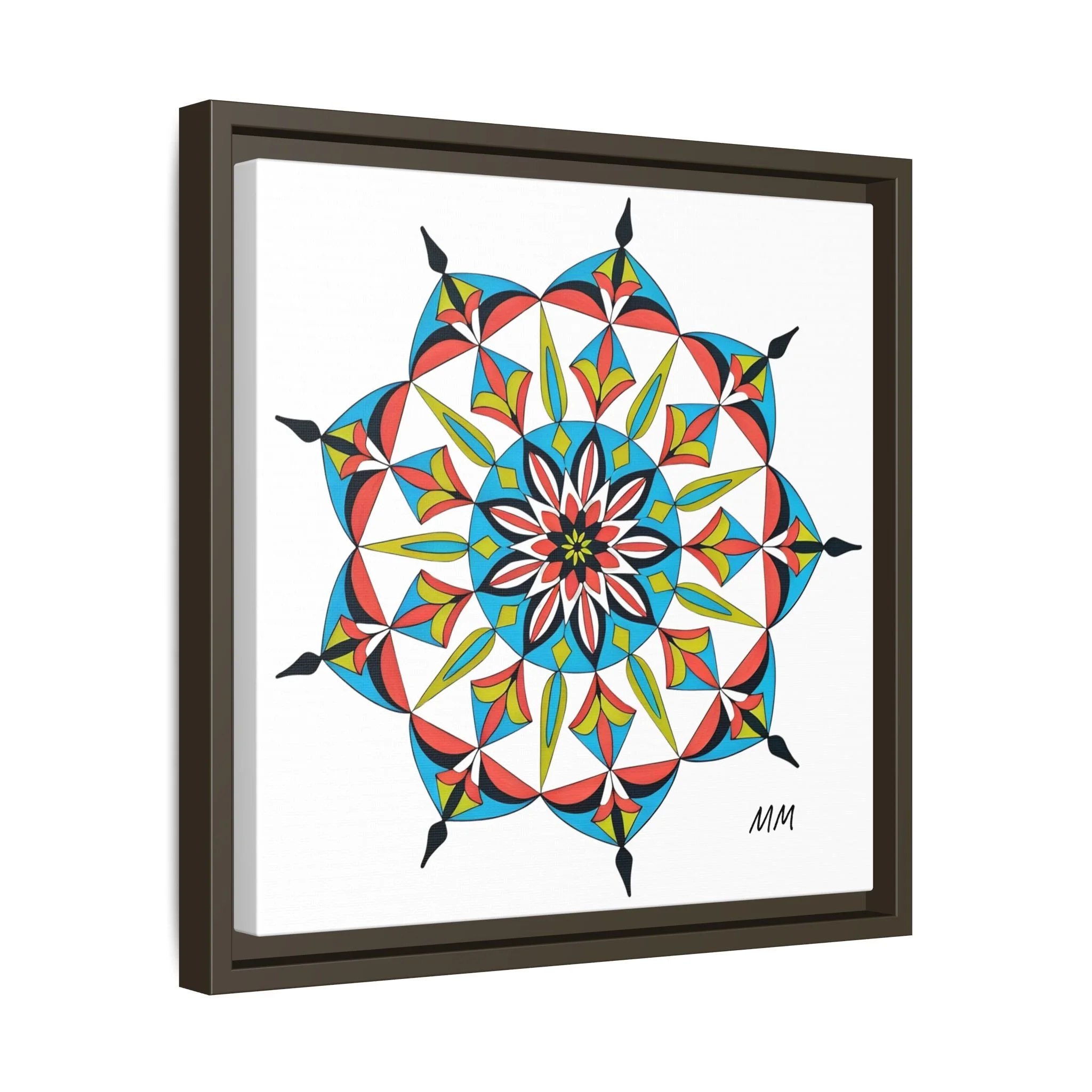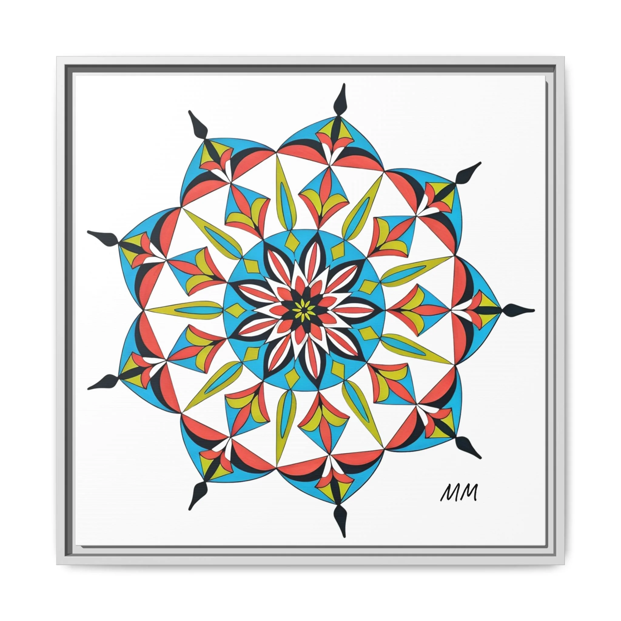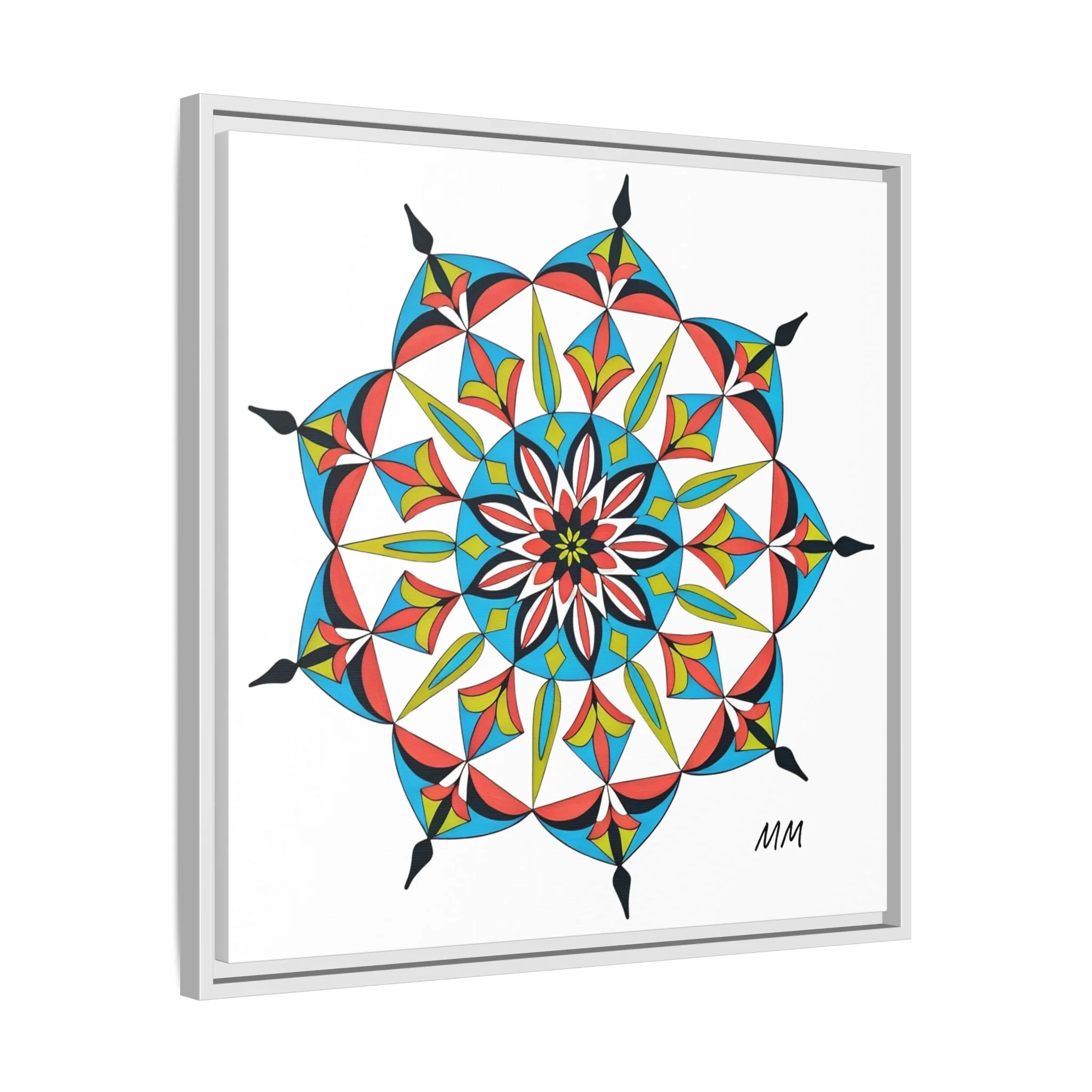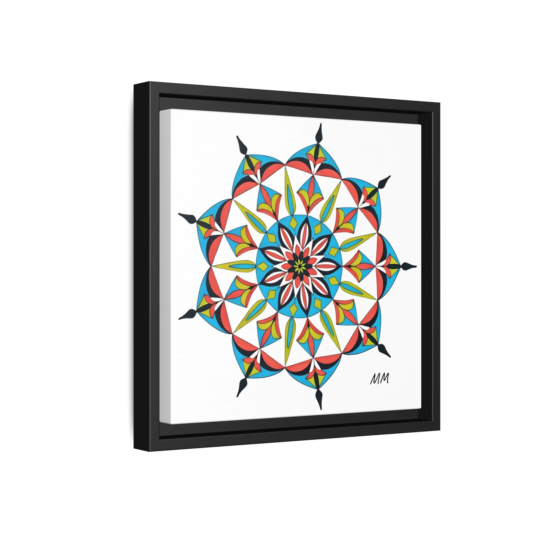 This framed matte canvas brings a burst of handcrafted pattern and color into a calm, modern space. The mandala-like design balances bright cyan, coral, lime and black in delicate, petal-shaped forms that draw the eye inward. Hung in an entryway, above a console, or paired in a gallery wall, the piece feels like a quiet celebration — lively yet measured. The slim pine frame and matte finish keep the focus on texture and line, so the artwork reads crisp from across a room and intimate up close. For someone who collects bold geometry or seeks a playful anchor for minimalist decor, this canvas settles into daily life and lifts the mood without shouting.