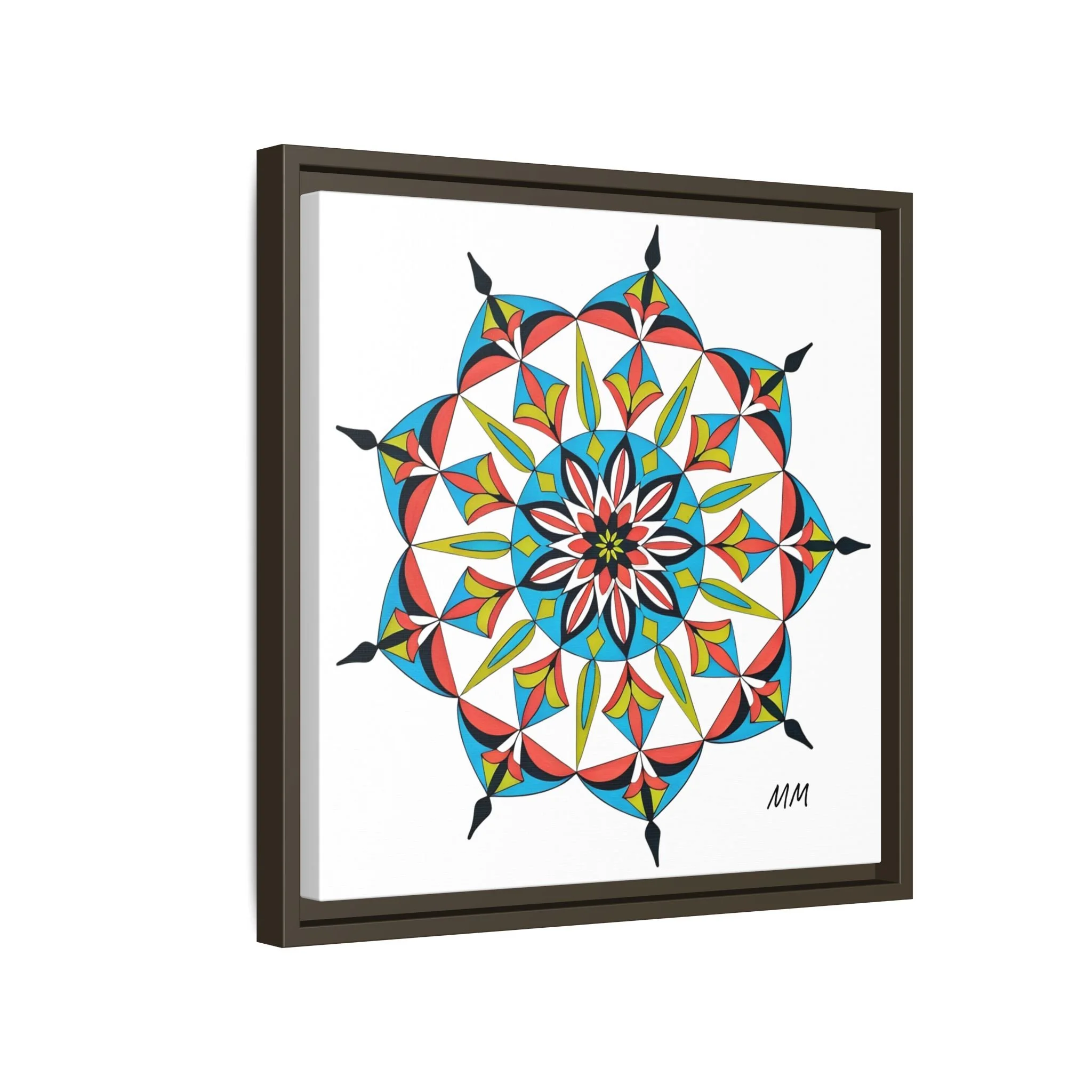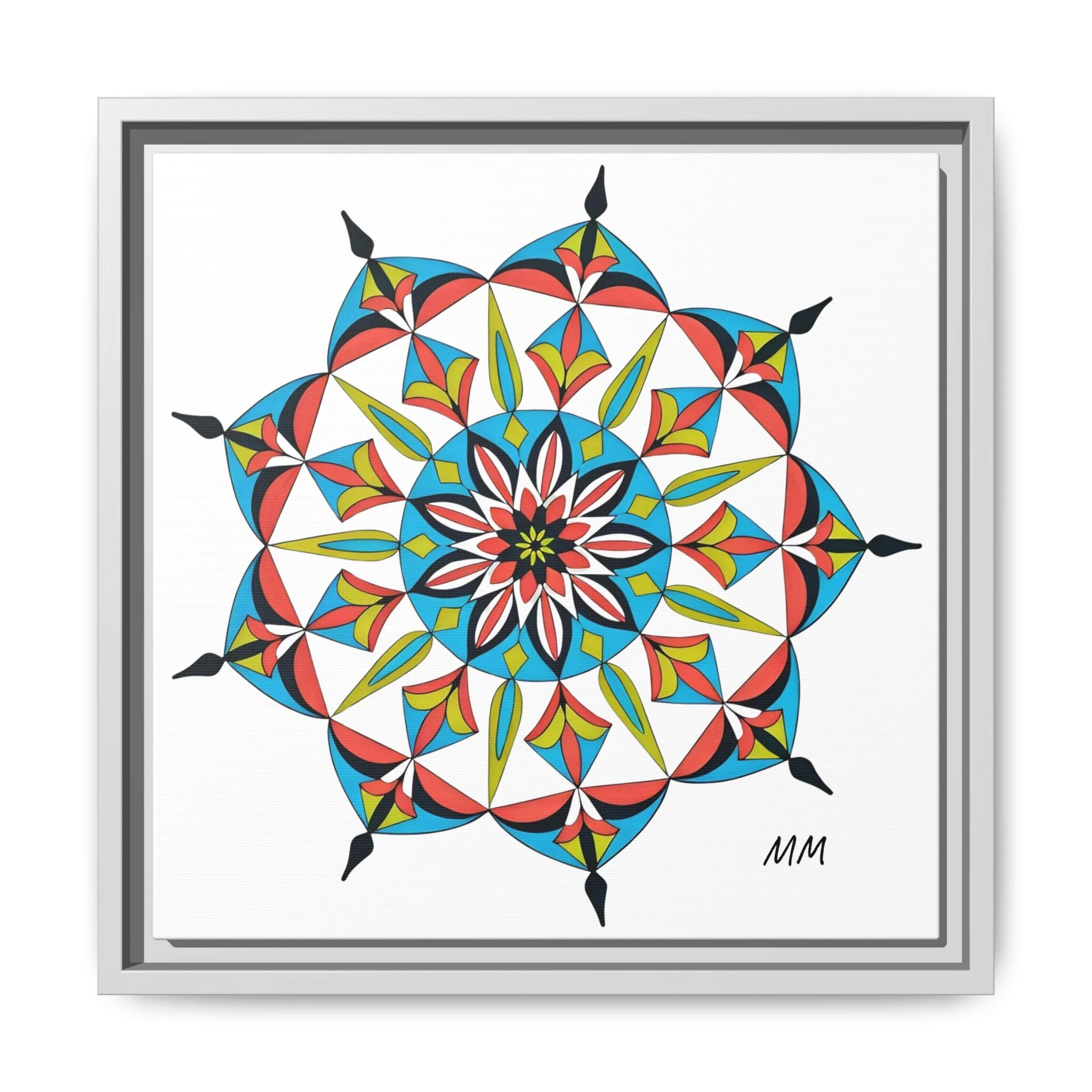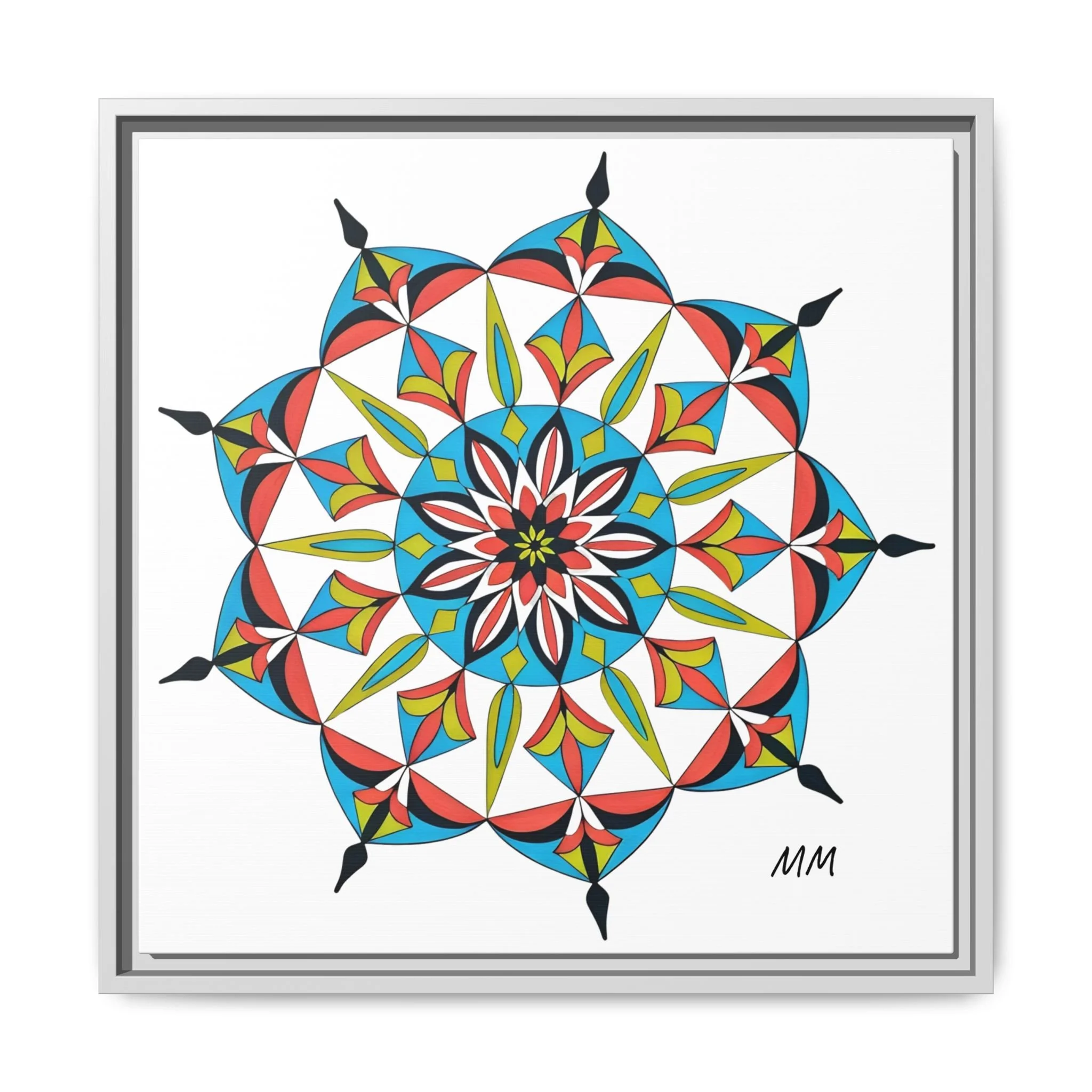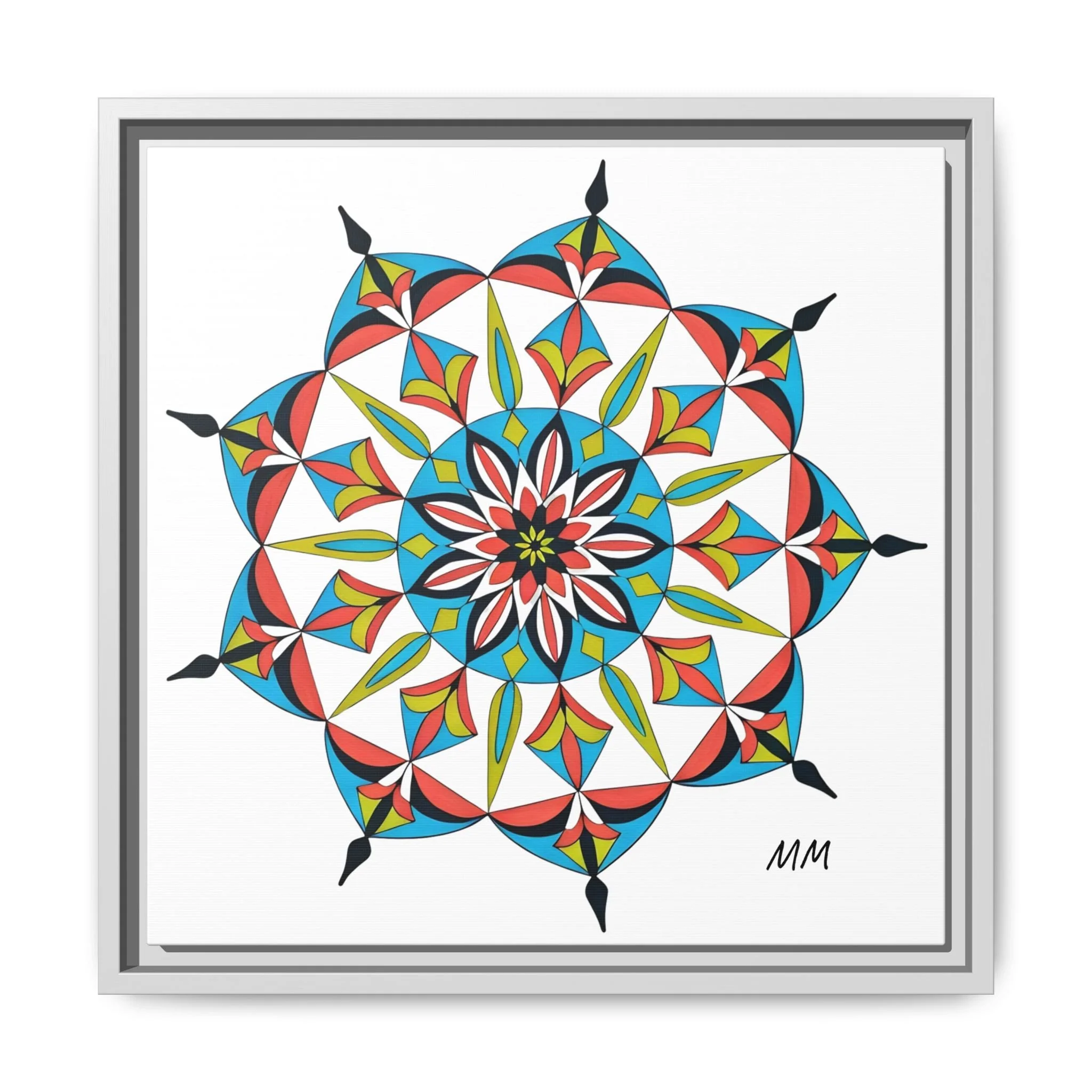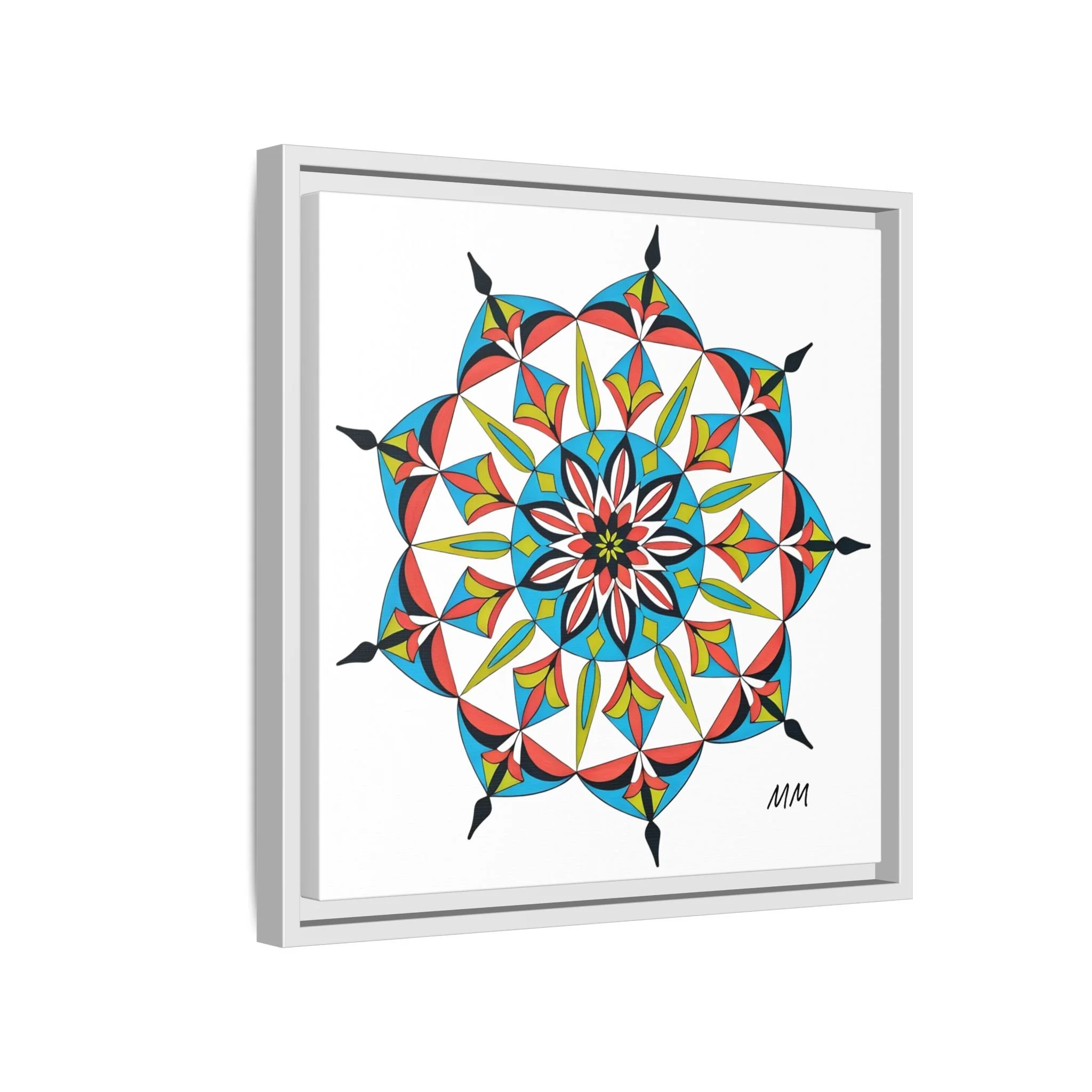 This framed matte canvas brings a burst of handcrafted pattern and color into a calm, modern space. The mandala-like design balances bright cyan, coral, lime and black in delicate, petal-shaped forms that draw the eye inward. Hung in an entryway, above a console, or paired in a gallery wall, the piece feels like a quiet celebration — lively yet measured. The slim pine frame and matte finish keep the focus on texture and line, so the artwork reads crisp from across a room and intimate up close. For someone who collects bold geometry or seeks a playful anchor for minimalist decor, this canvas settles into daily life and lifts the mood without shouting.