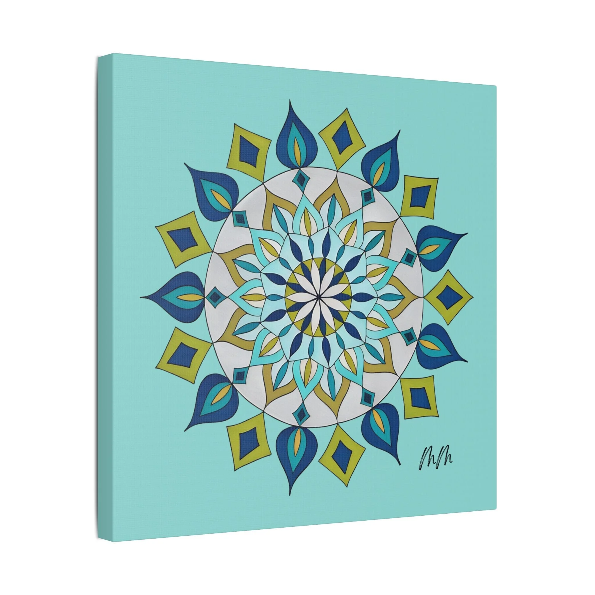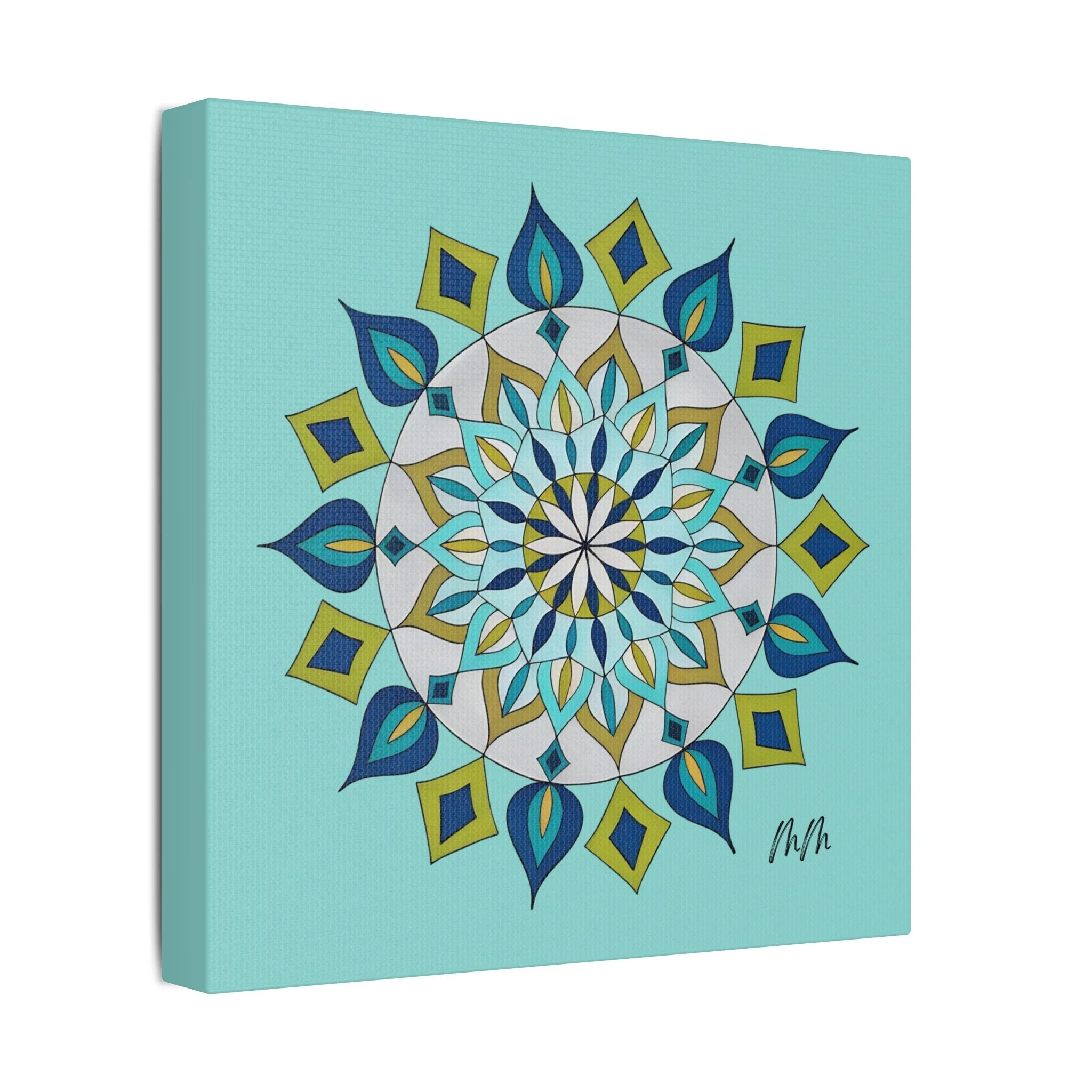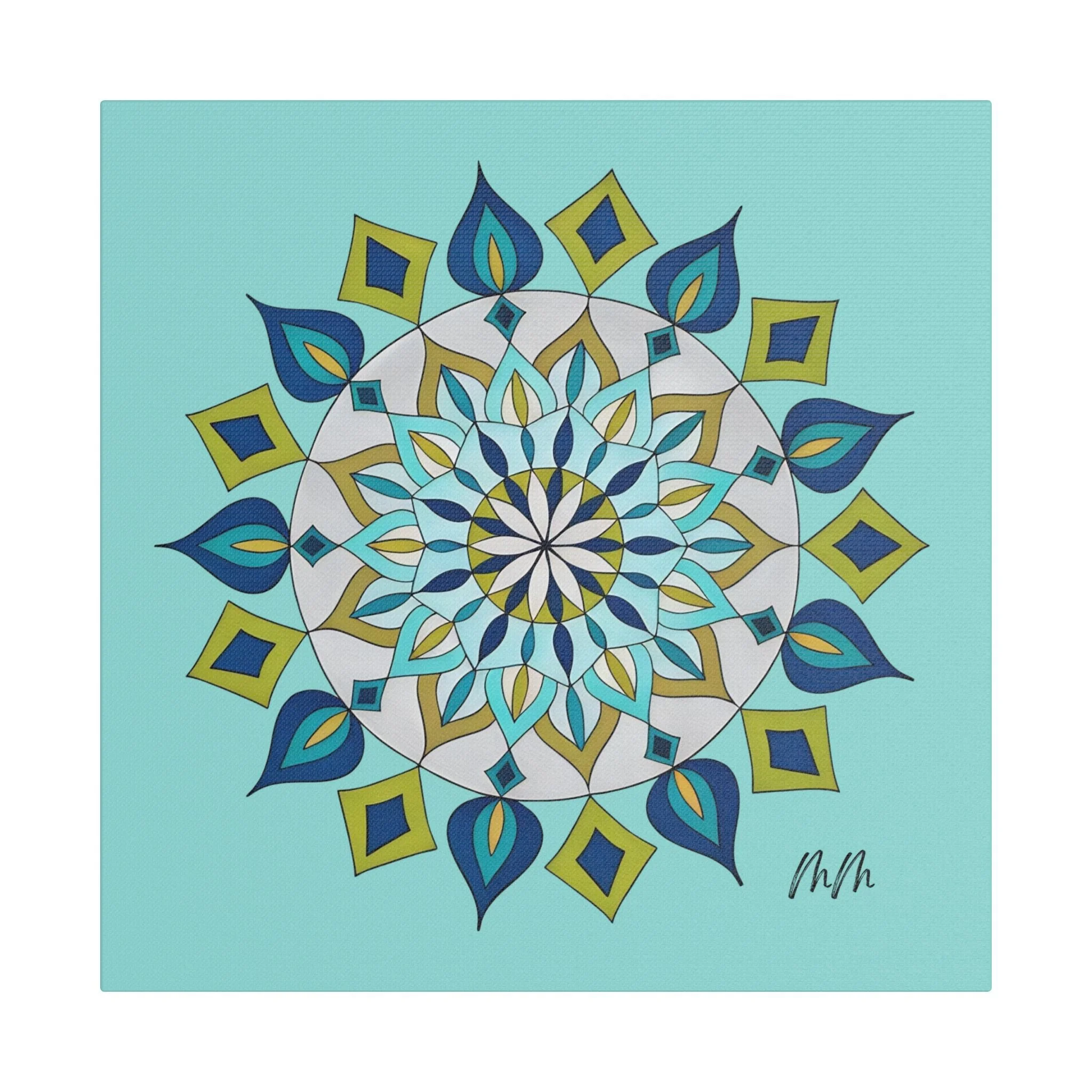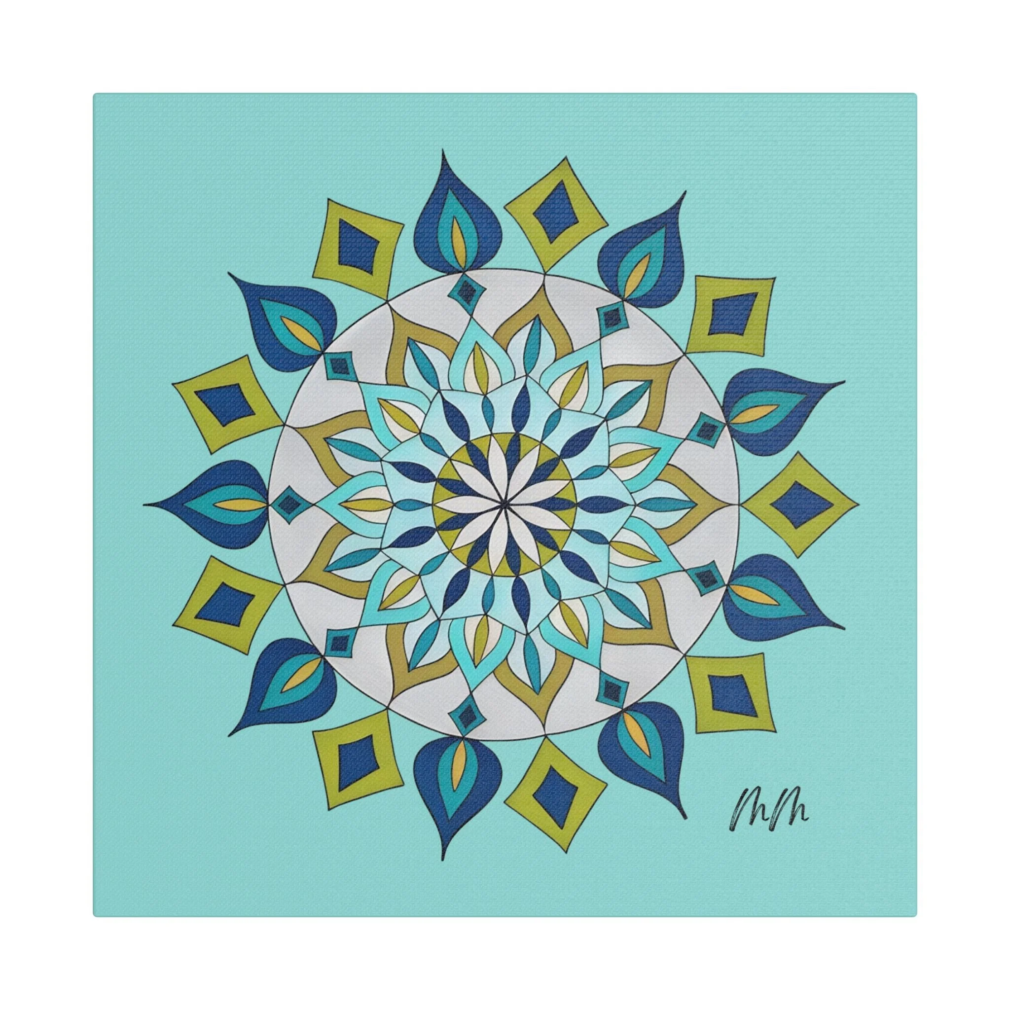 A satin-finish stretched canvas that brings calm, clarity, and a burst of color to indoor spaces. The print’s crisp mandala design sits on a bright teal background, inviting focus and balance in living rooms, studios, or bedrooms. Lightweight but sturdy, the 100% polyester canvas is stretched over a wooden inner frame and secured with metallic mounts for easy hanging. REACH-certified inks preserve the vivid blues, teals, and golds so the artwork keeps its brilliance for years. With a wide range of sizes and orientation options, this piece fits gallery walls and cozy nooks alike — a contemporary accent that reads as both modern décor and a quiet focal point.