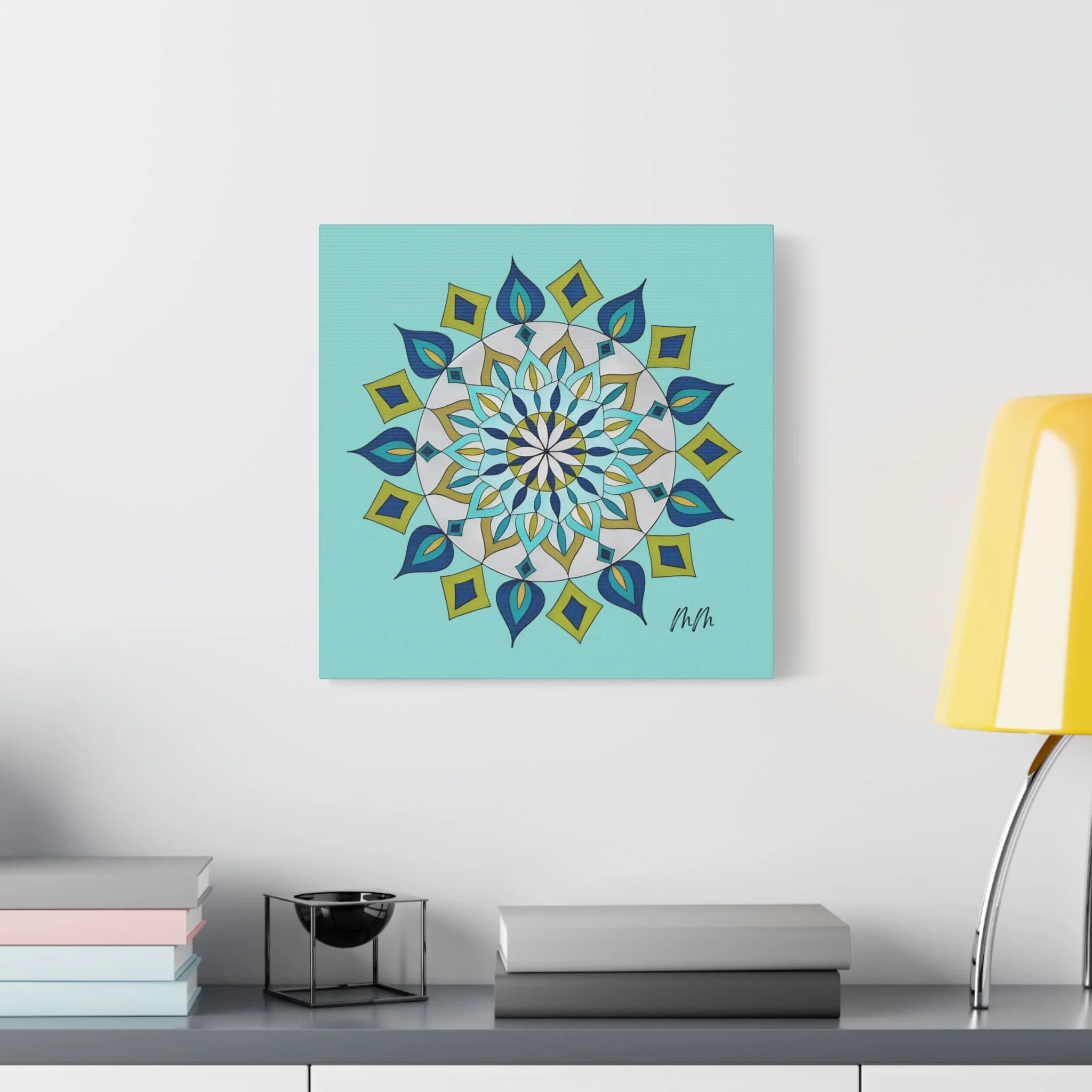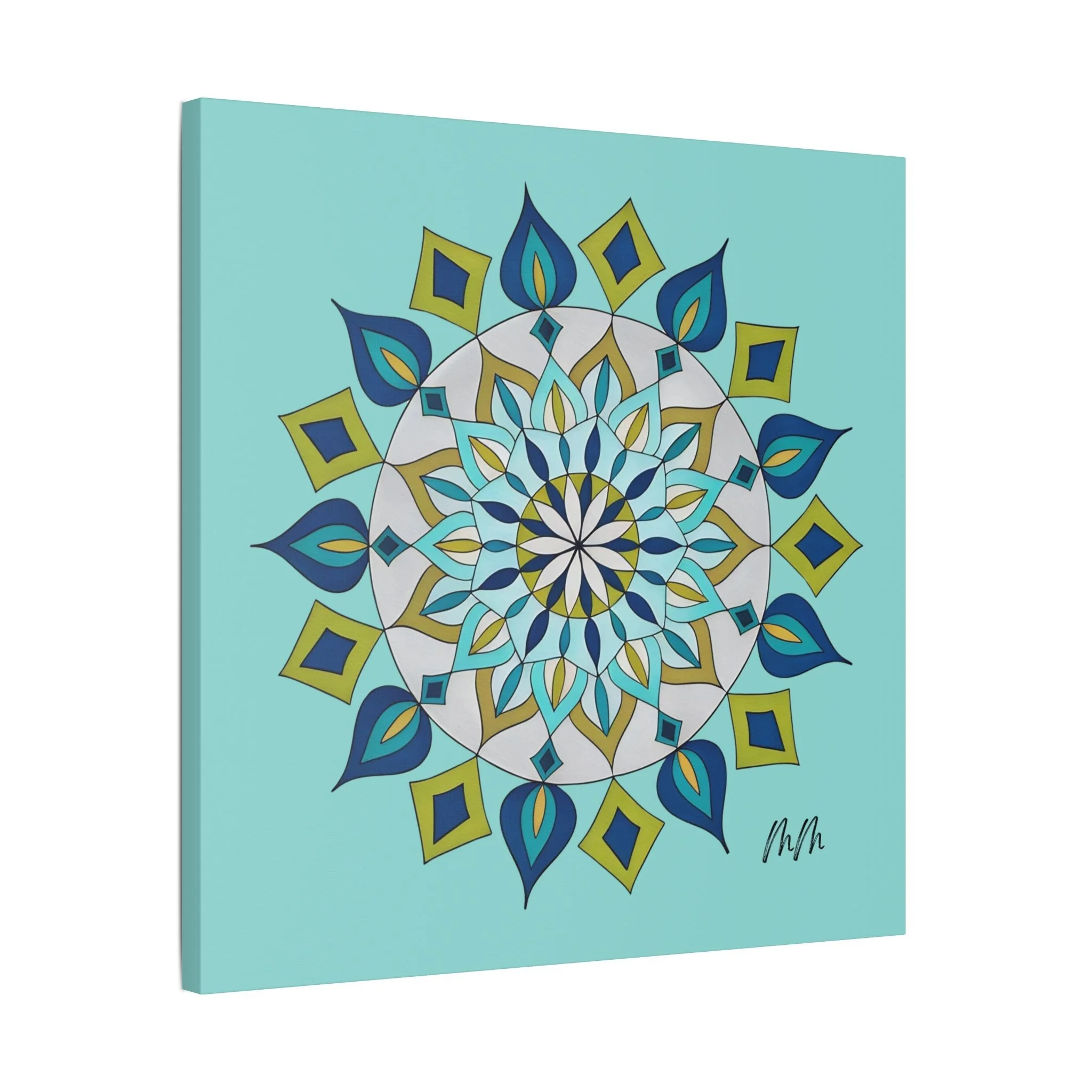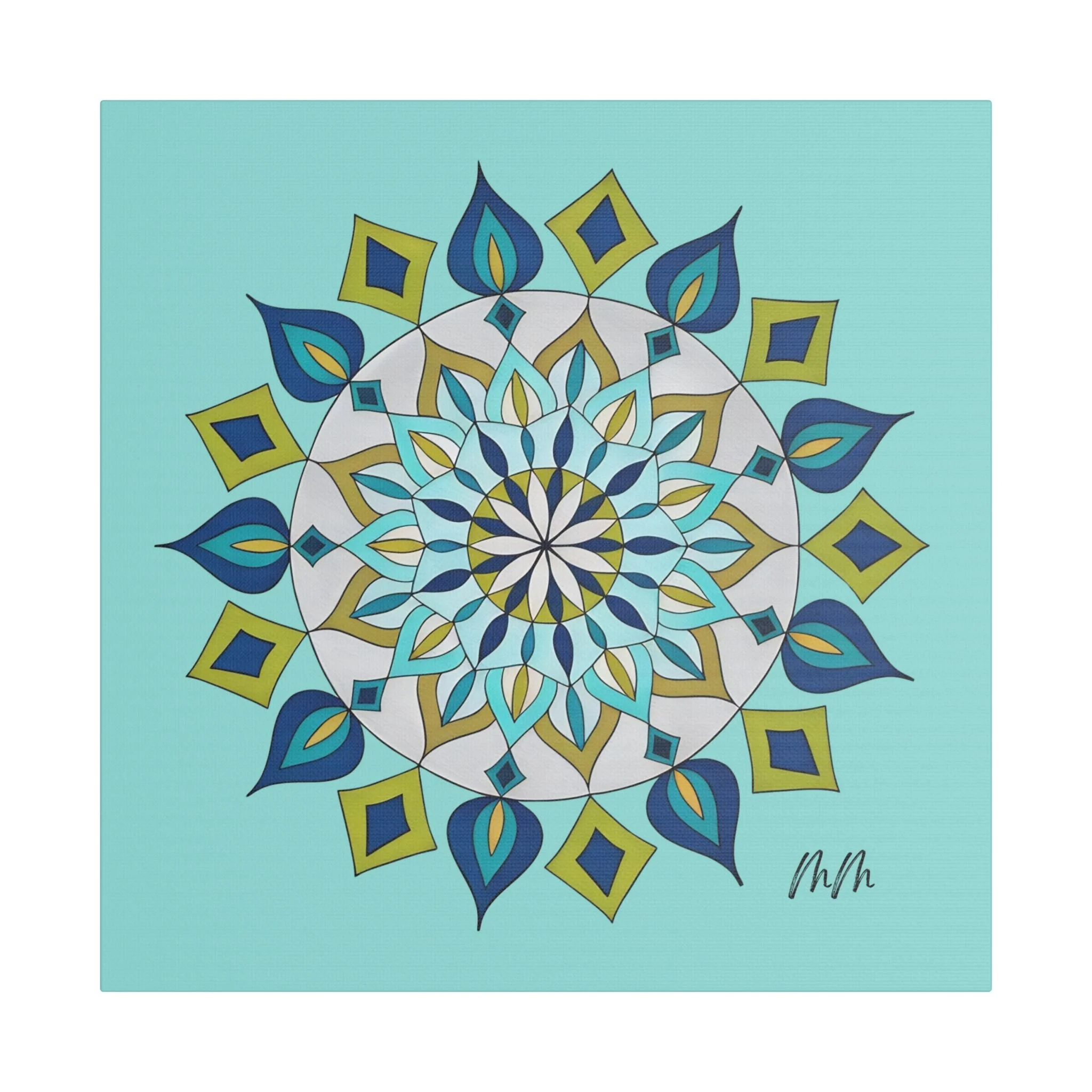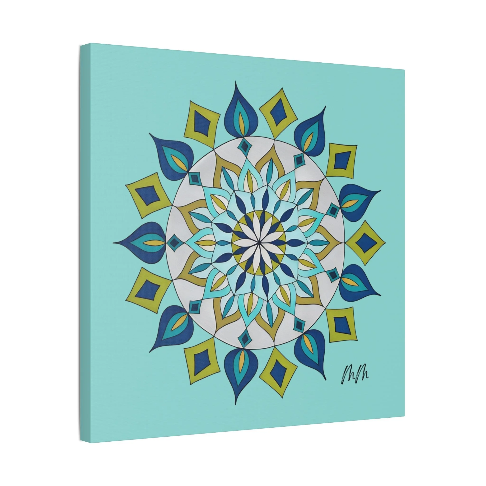 A satin-finish stretched canvas that brings calm, clarity, and a burst of color to indoor spaces. The print’s crisp mandala design sits on a bright teal background, inviting focus and balance in living rooms, studios, or bedrooms. Lightweight but sturdy, the 100% polyester canvas is stretched over a wooden inner frame and secured with metallic mounts for easy hanging. REACH-certified inks preserve the vivid blues, teals, and golds so the artwork keeps its brilliance for years. With a wide range of sizes and orientation options, this piece fits gallery walls and cozy nooks alike — a contemporary accent that reads as both modern décor and a quiet focal point.