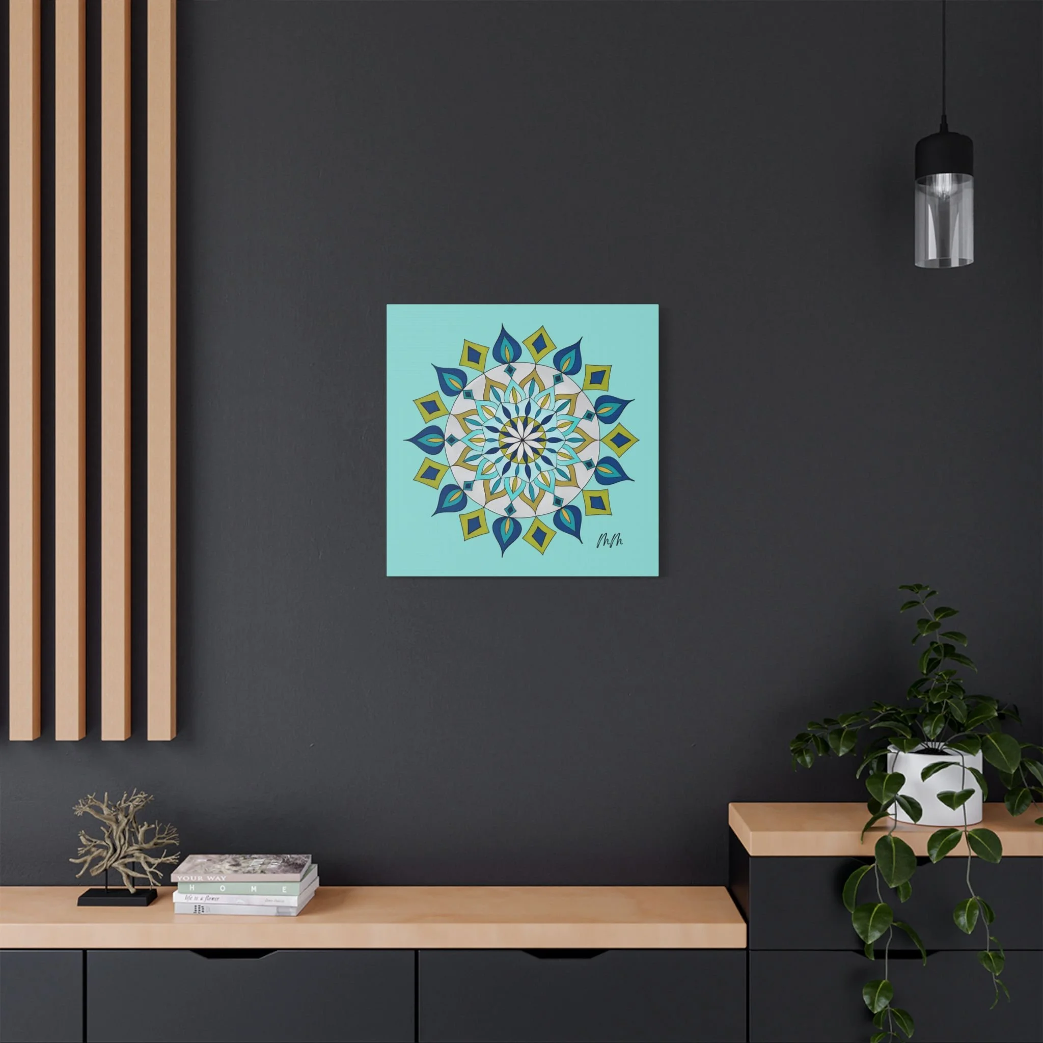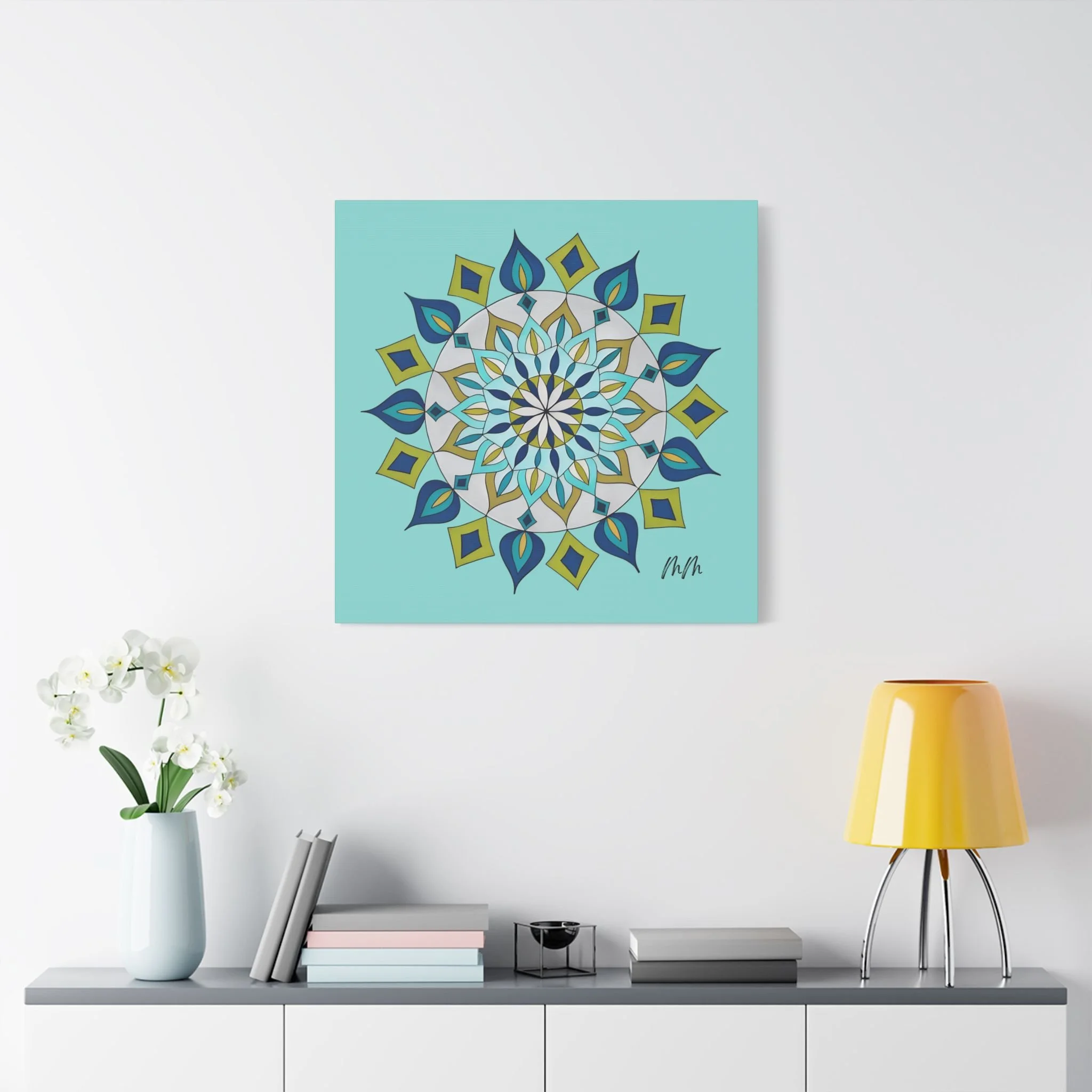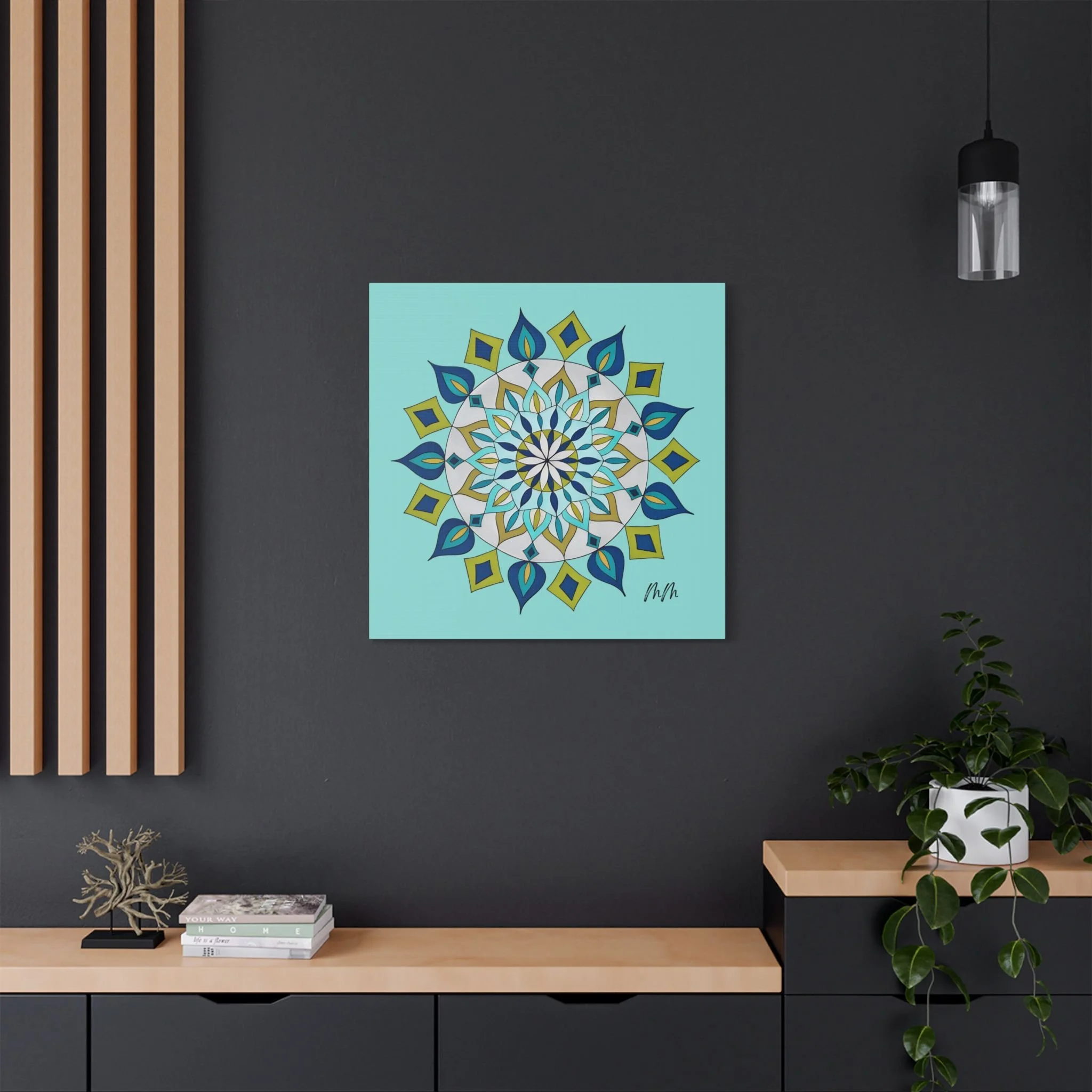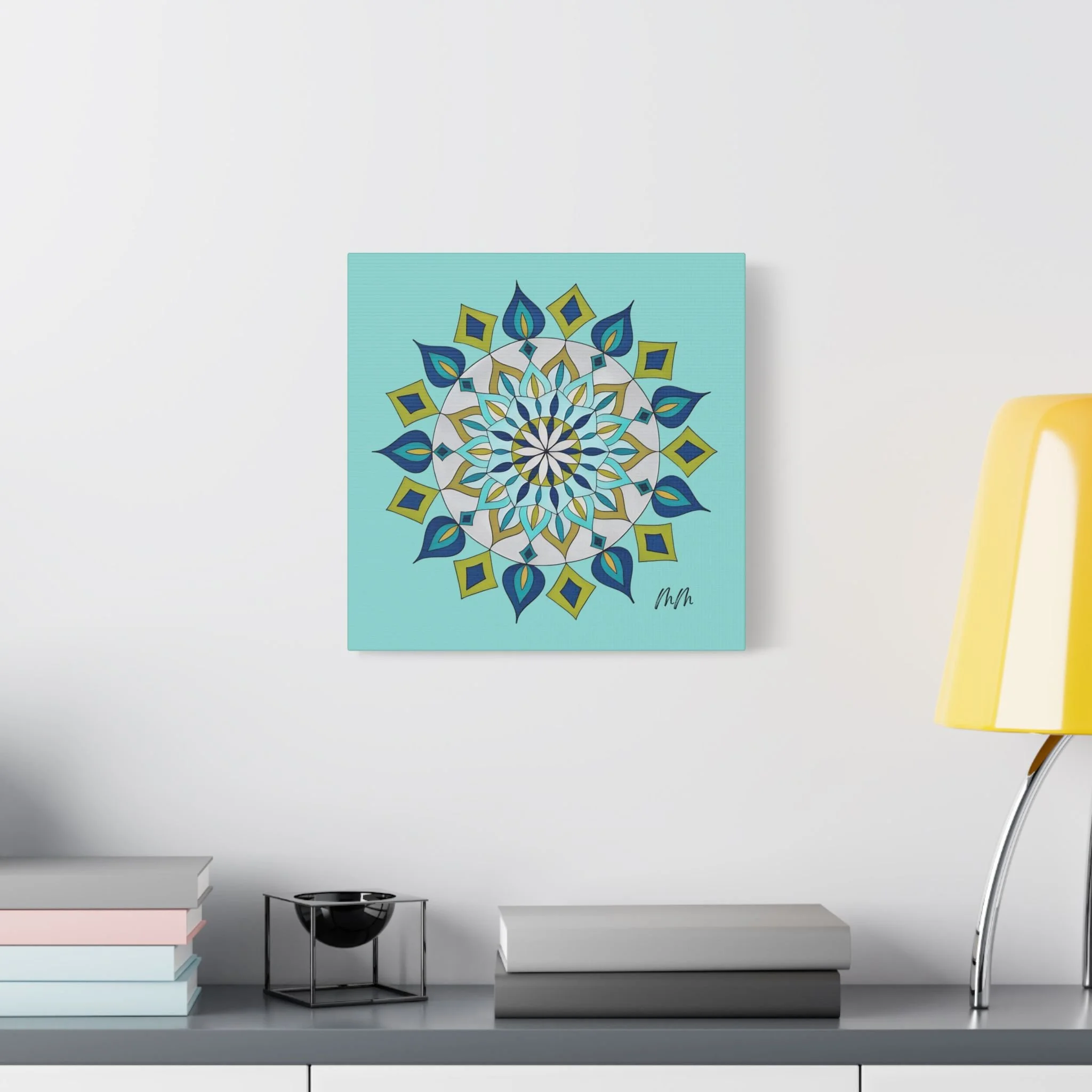 A satin-finish stretched canvas that brings calm, clarity, and a burst of color to indoor spaces. The print’s crisp mandala design sits on a bright teal background, inviting focus and balance in living rooms, studios, or bedrooms. Lightweight but sturdy, the 100% polyester canvas is stretched over a wooden inner frame and secured with metallic mounts for easy hanging. REACH-certified inks preserve the vivid blues, teals, and golds so the artwork keeps its brilliance for years. With a wide range of sizes and orientation options, this piece fits gallery walls and cozy nooks alike — a contemporary accent that reads as both modern décor and a quiet focal point.