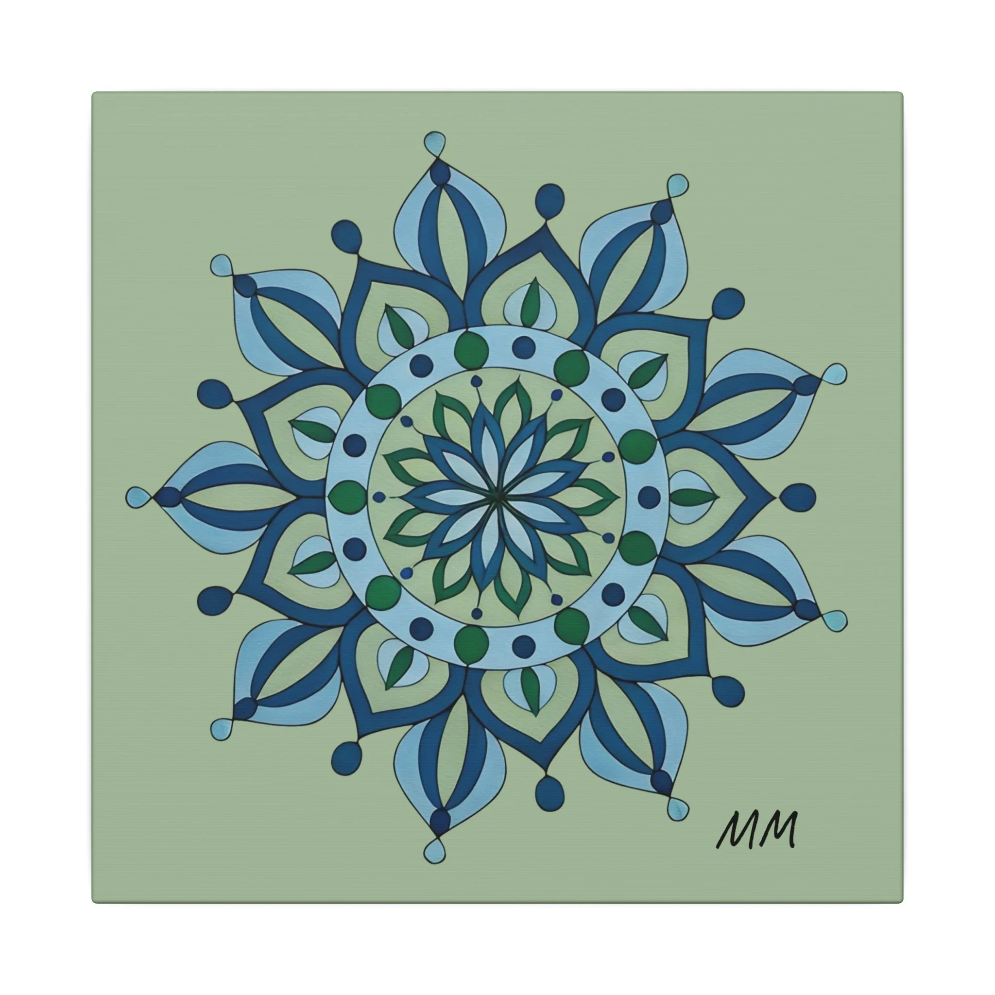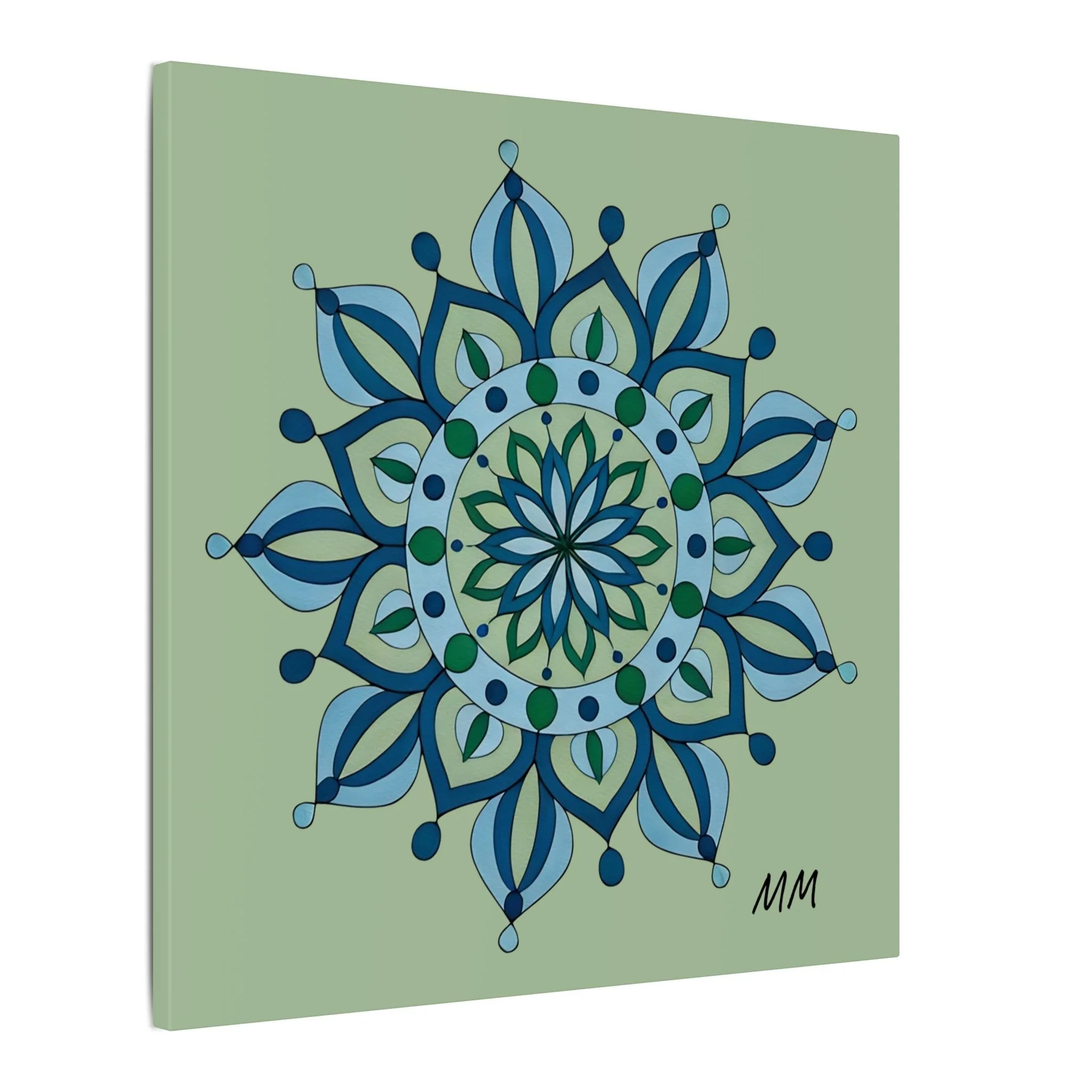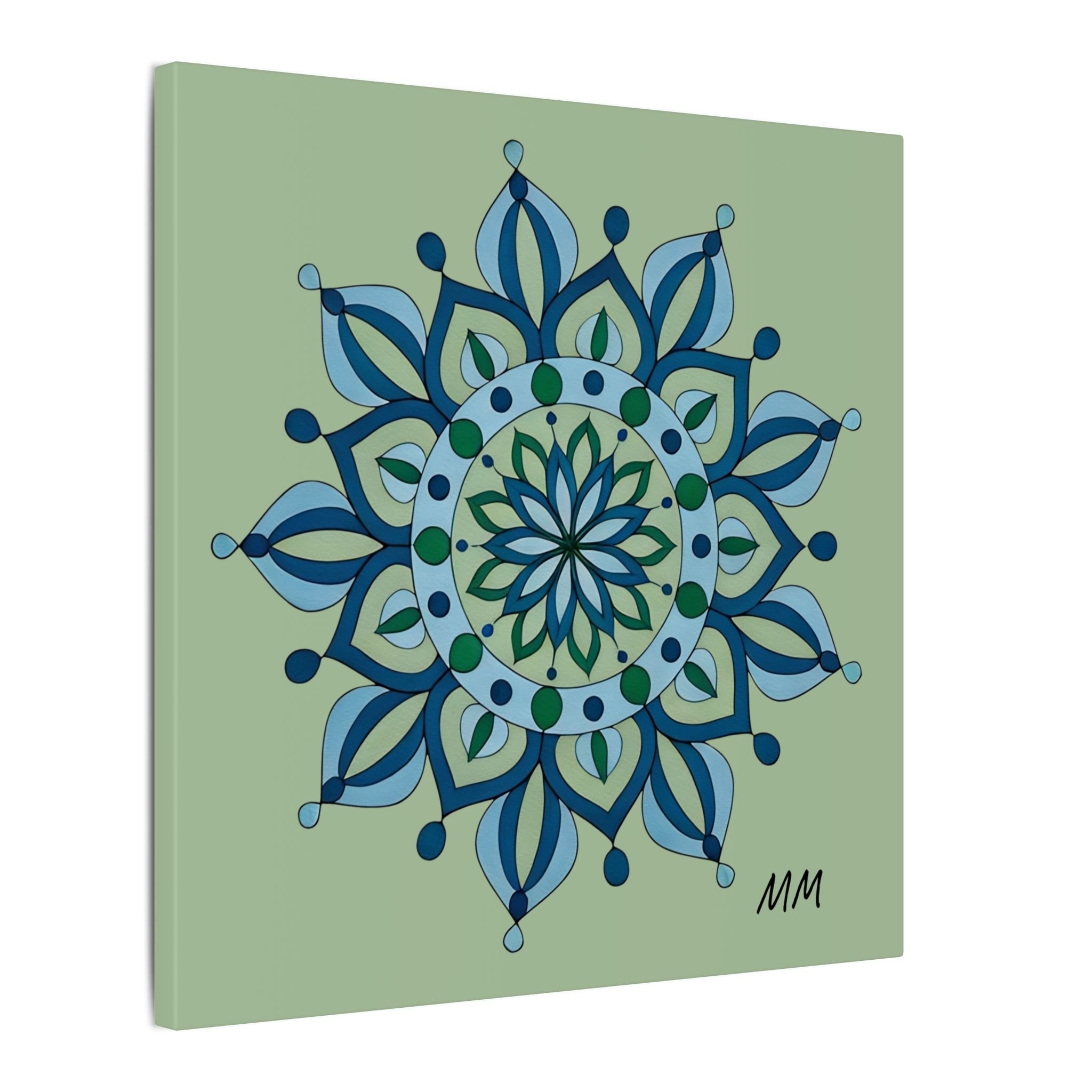 A calm, hand-finished stretched canvas that brings a quiet, meditative energy to a room. Soft greens and layered blues form a mandala-like bloom at the center, its symmetrical petals and dot accents drawing the eye inward. The subtle matte surface reduces glare and gives the print a painterly feel, while the slim 0.75" profile keeps the piece understated on the wall. It sits well above a nightstand, in a reading nook, or as a coordinating pair in a hallway—places where someone seeks a moment of pause.