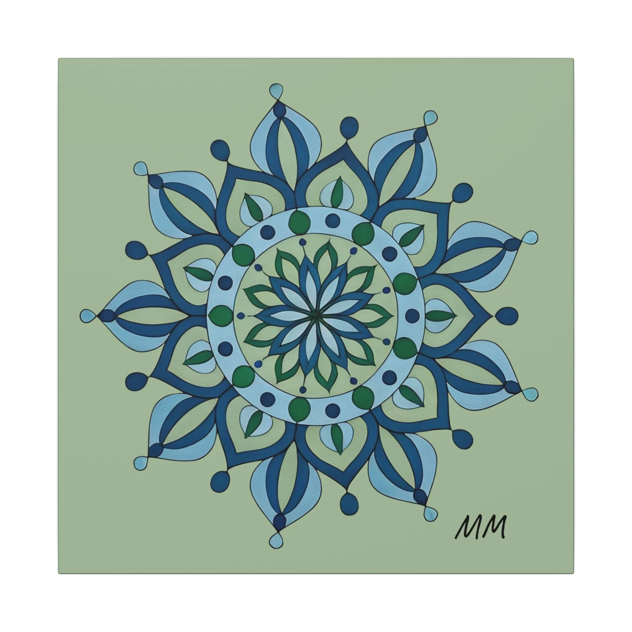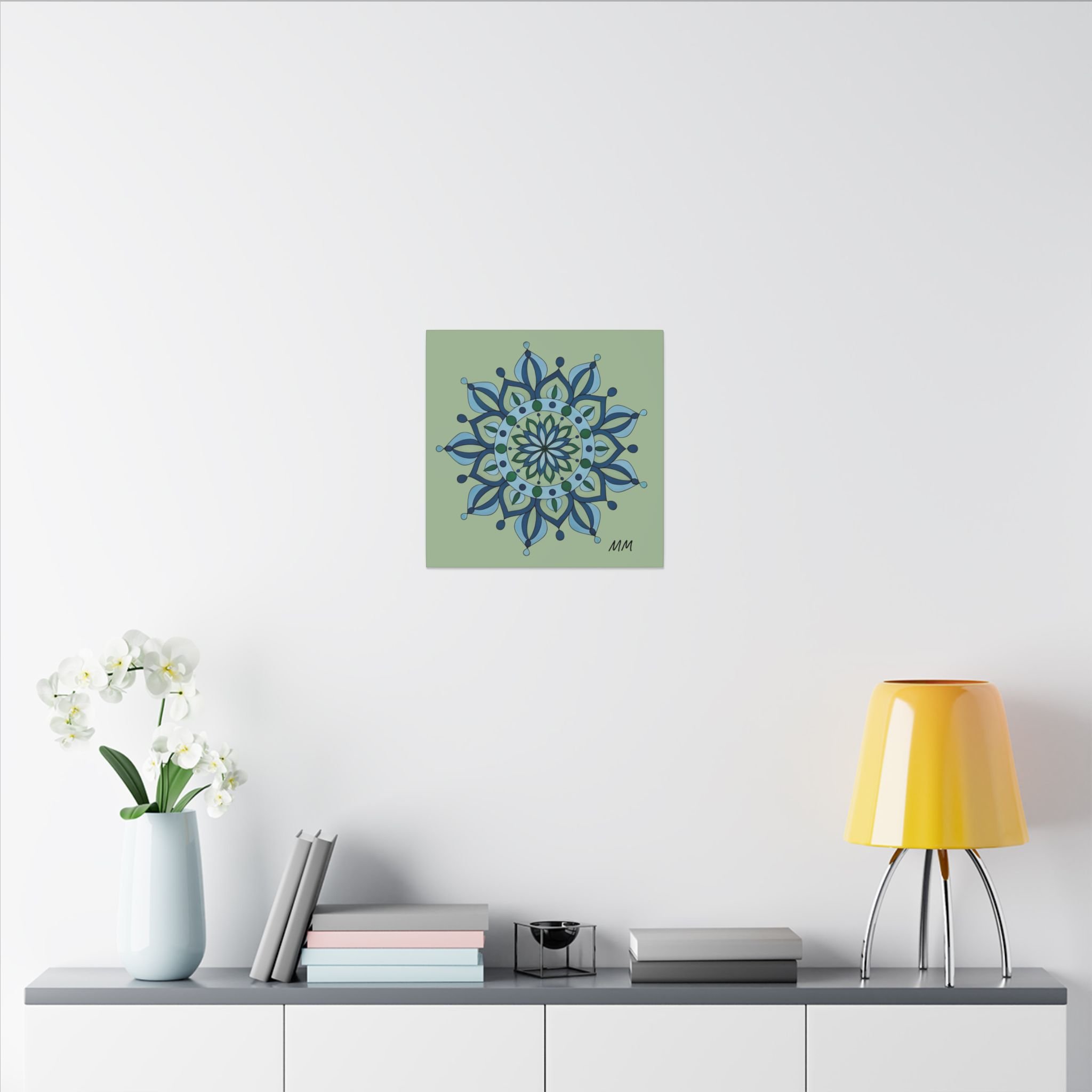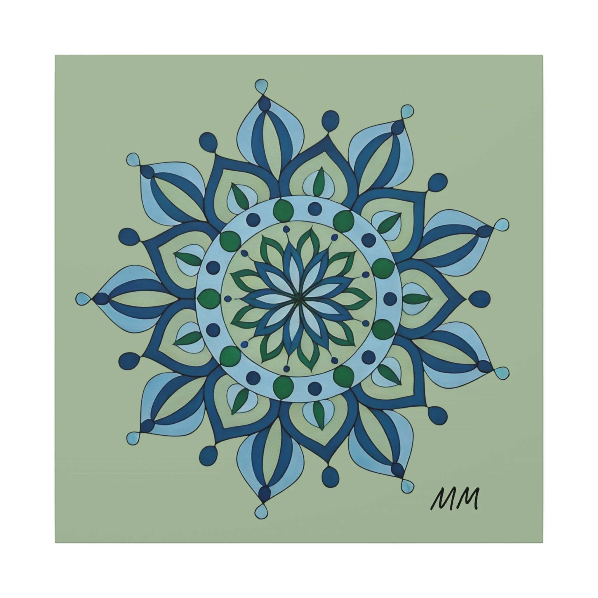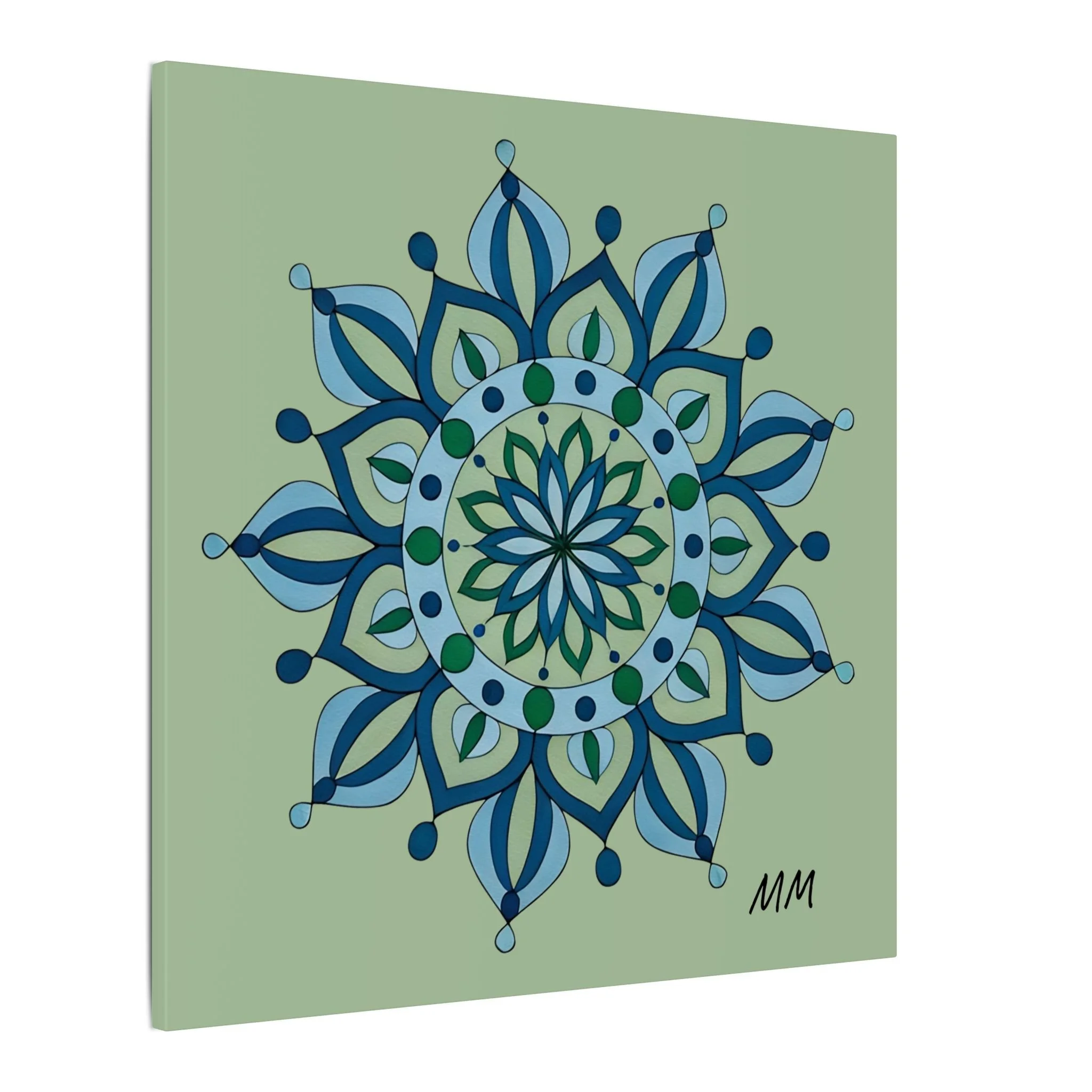 A calm, hand-finished stretched canvas that brings a quiet, meditative energy to a room. Soft greens and layered blues form a mandala-like bloom at the center, its symmetrical petals and dot accents drawing the eye inward. The subtle matte surface reduces glare and gives the print a painterly feel, while the slim 0.75" profile keeps the piece understated on the wall. It sits well above a nightstand, in a reading nook, or as a coordinating pair in a hallway—places where someone seeks a moment of pause.