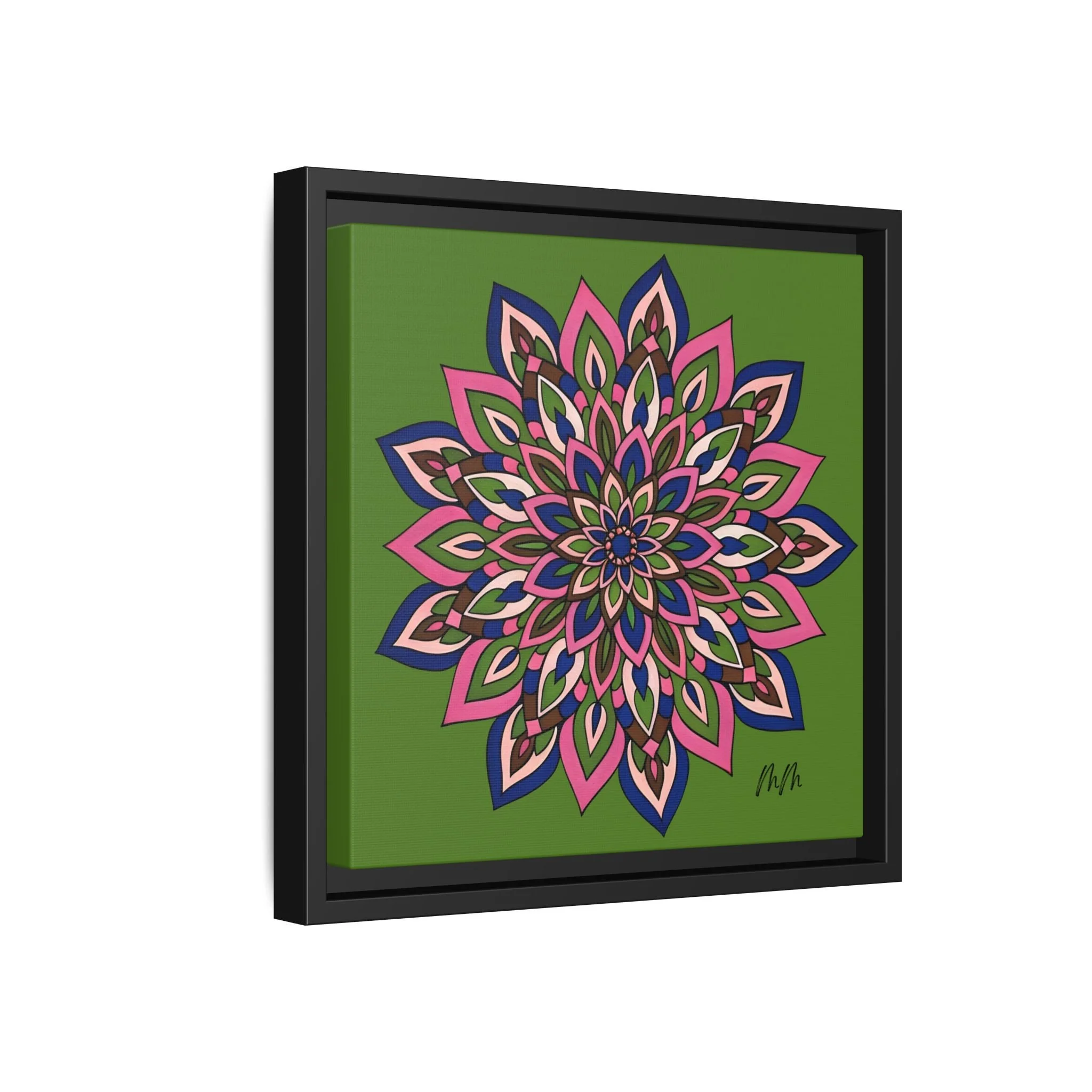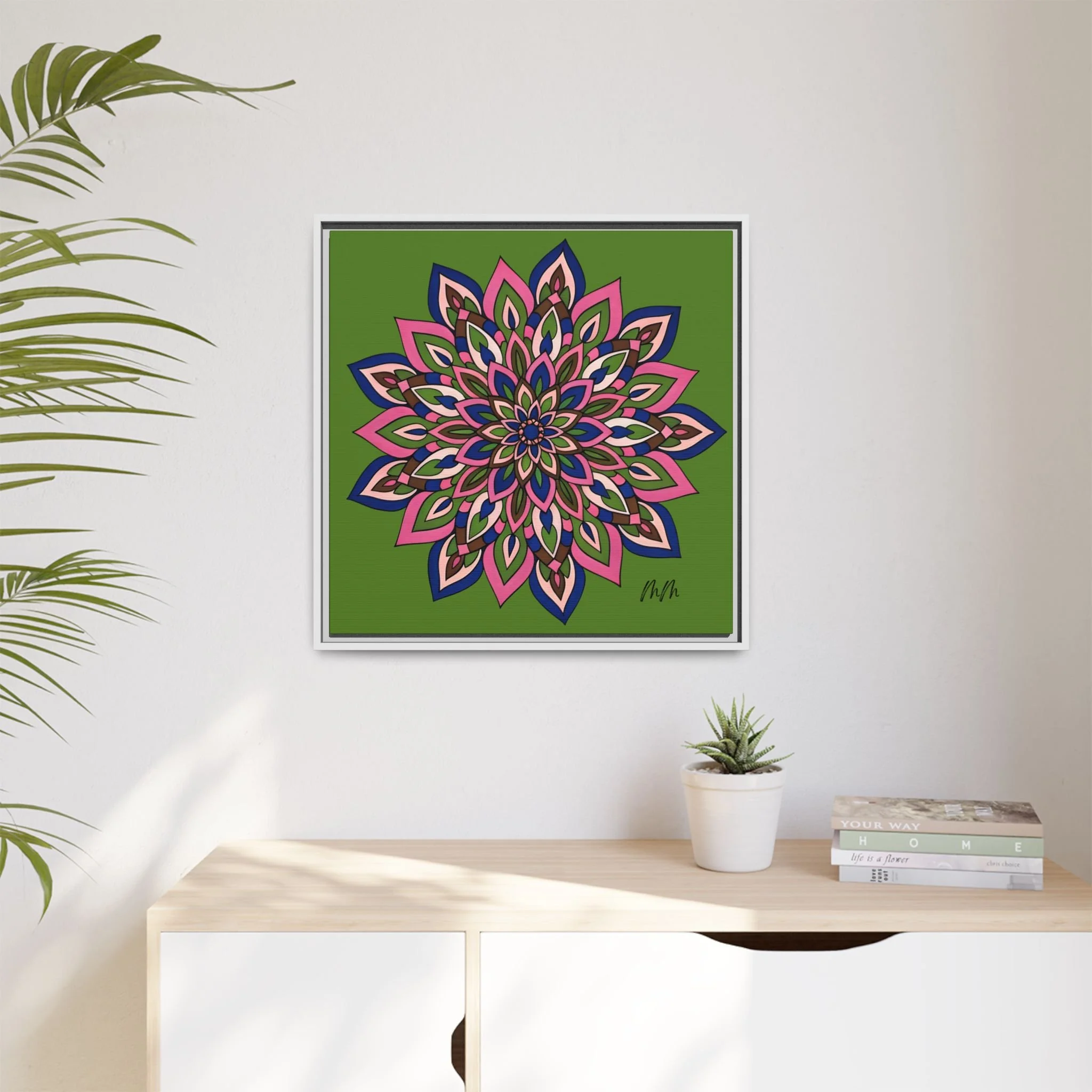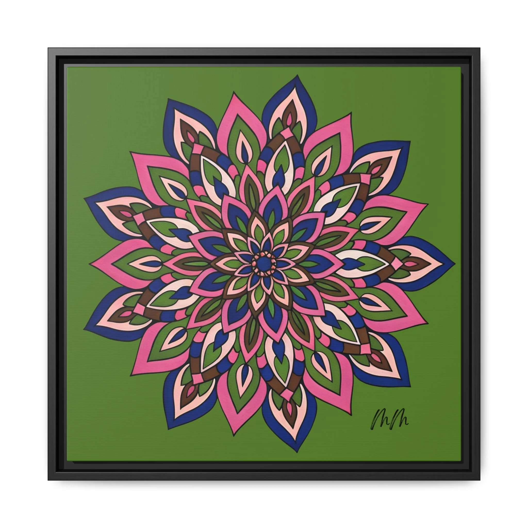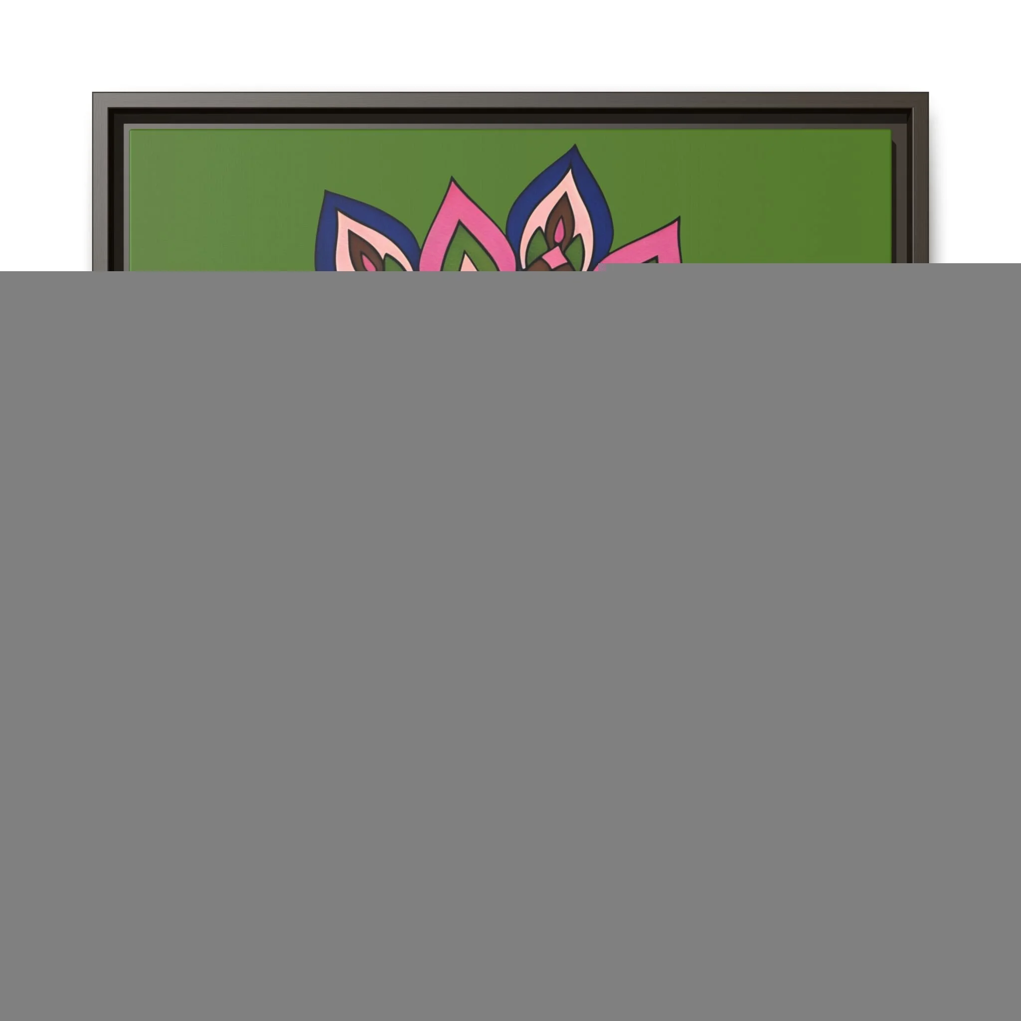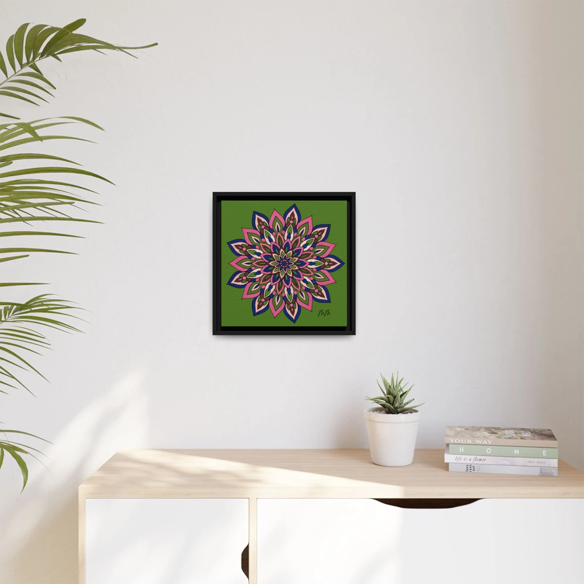 A vibrant, framed matte canvas that brings bold, layered mandala art into a living space with calm confidence. Rich pinks, deep navy and leafy greens meet in a hand-drawn floral geometry that feels both modern and meditative. The low-reflective matte surface keeps the colors deep and velvety while the slim pine frame gives clean structure — perfect for a cozy reading nook, studio wall, or entryway that welcomes color without shouting. Hang it alone as a focal point or group with other prints to build a collected, mindful gallery that reflects a love of pattern and calm energy.