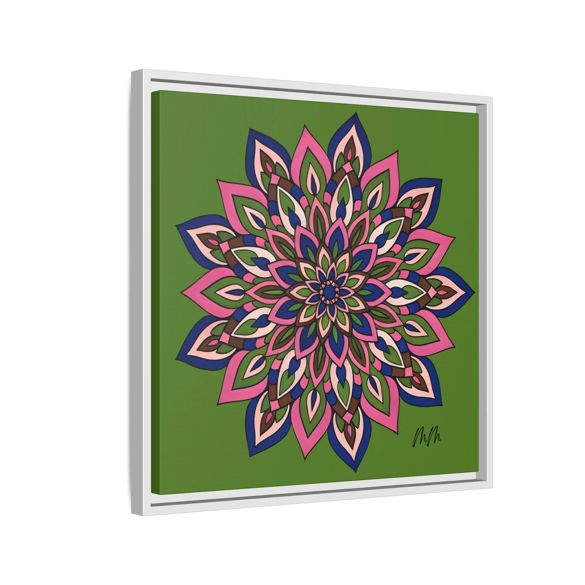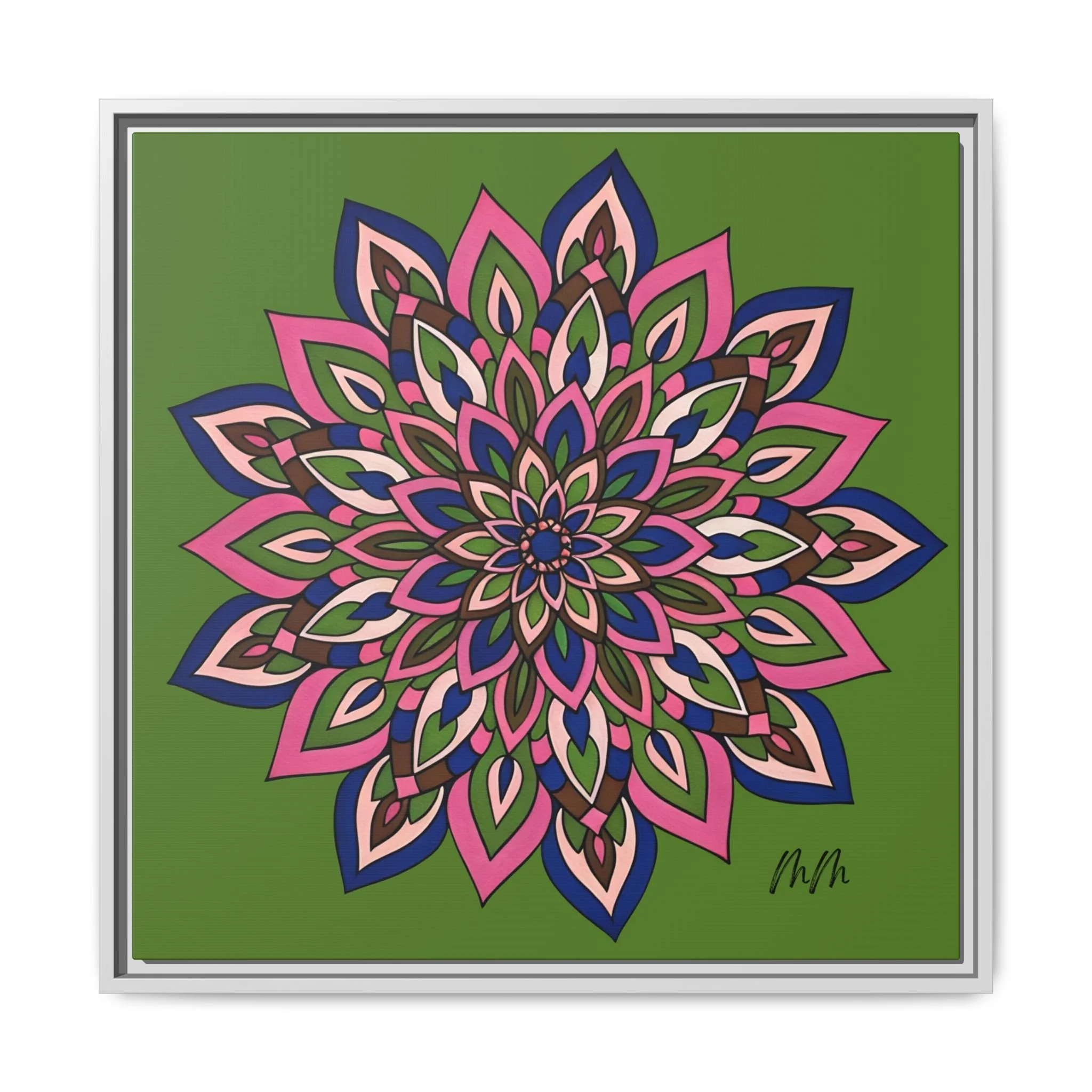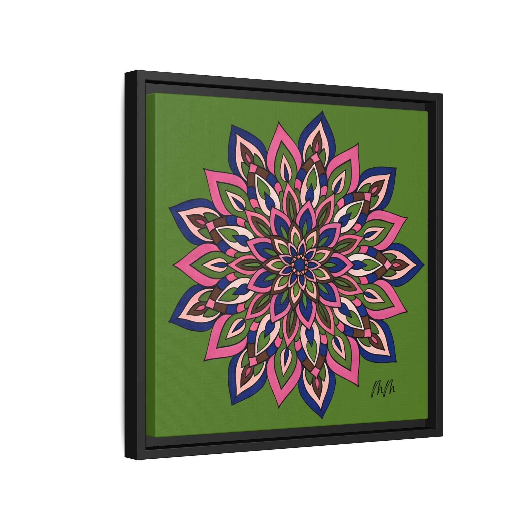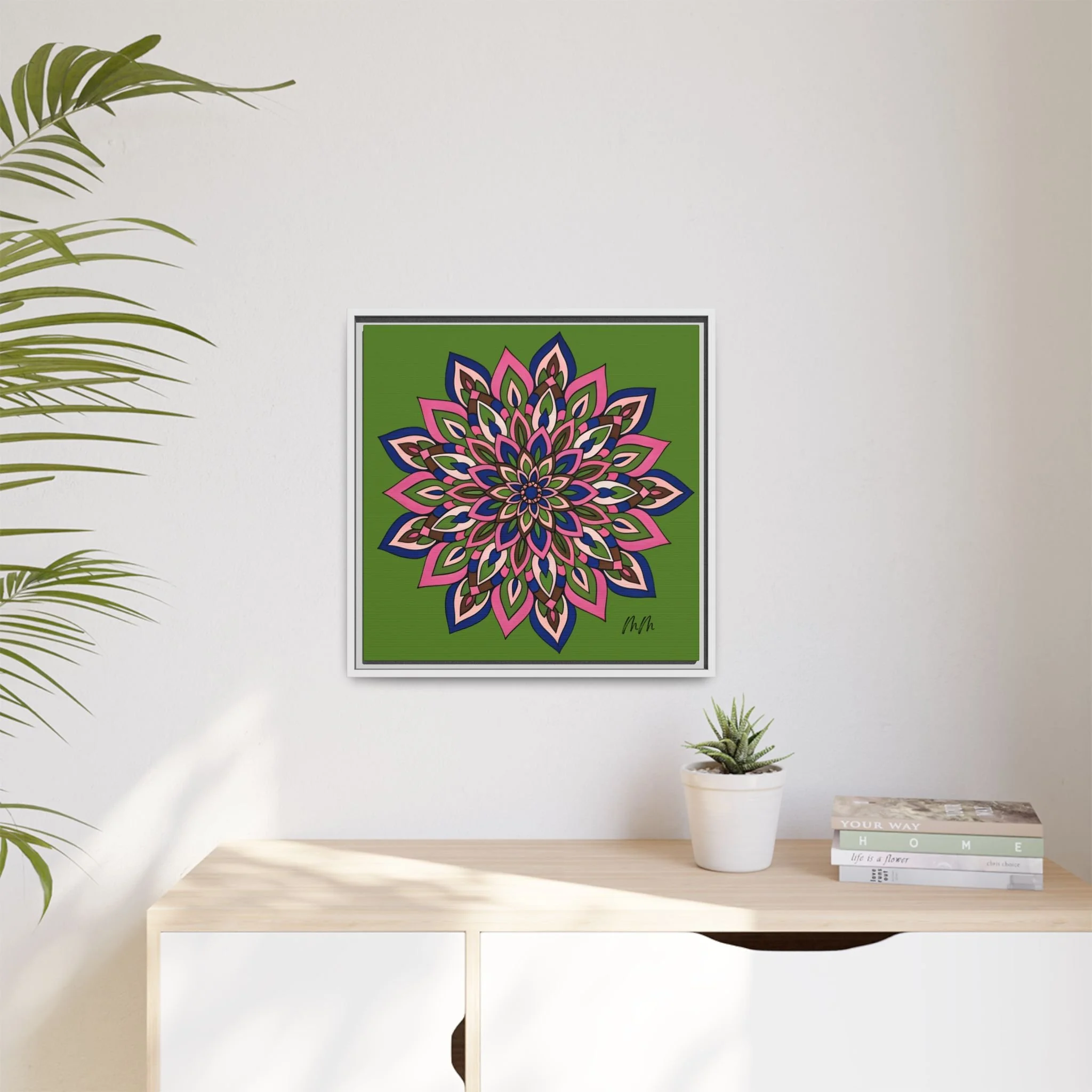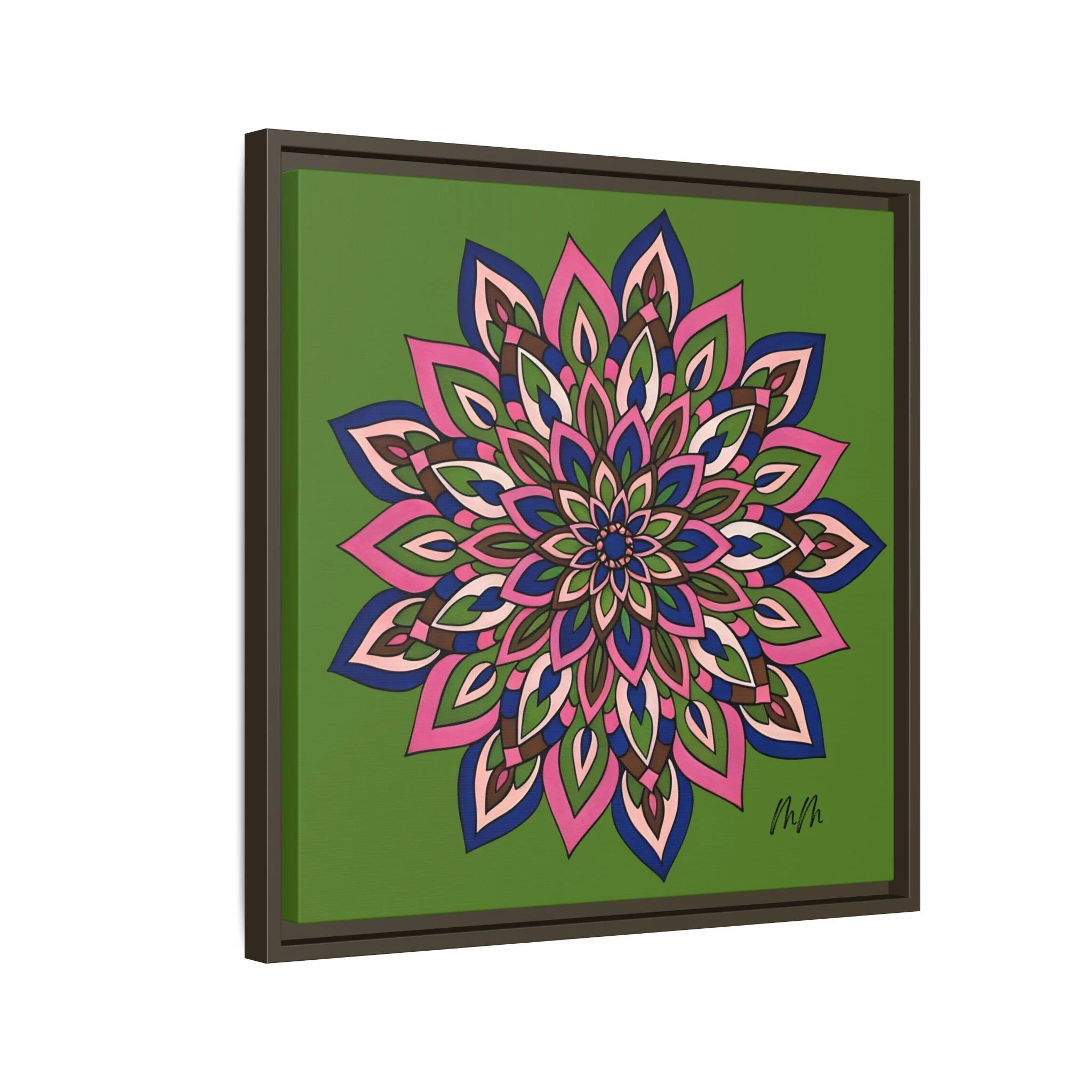 A vibrant, framed matte canvas that brings bold, layered mandala art into a living space with calm confidence. Rich pinks, deep navy and leafy greens meet in a hand-drawn floral geometry that feels both modern and meditative. The low-reflective matte surface keeps the colors deep and velvety while the slim pine frame gives clean structure — perfect for a cozy reading nook, studio wall, or entryway that welcomes color without shouting. Hang it alone as a focal point or group with other prints to build a collected, mindful gallery that reflects a love of pattern and calm energy.