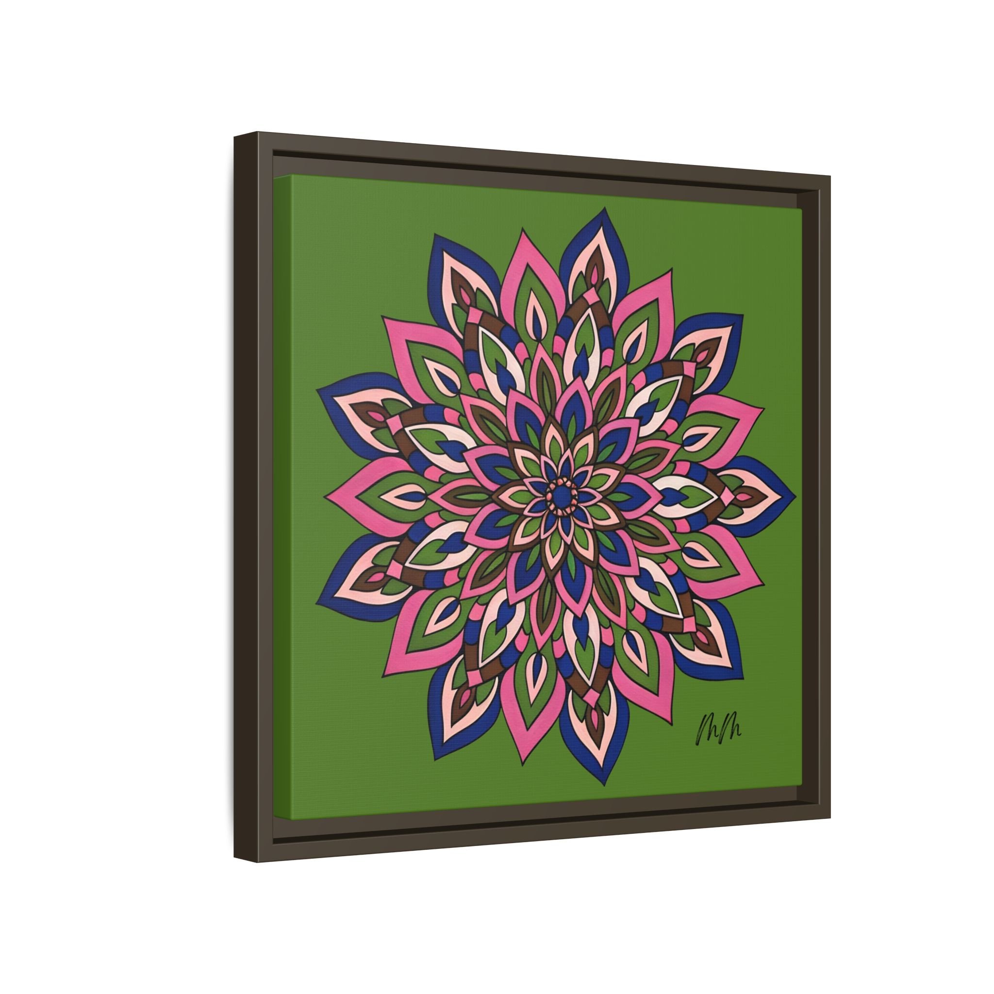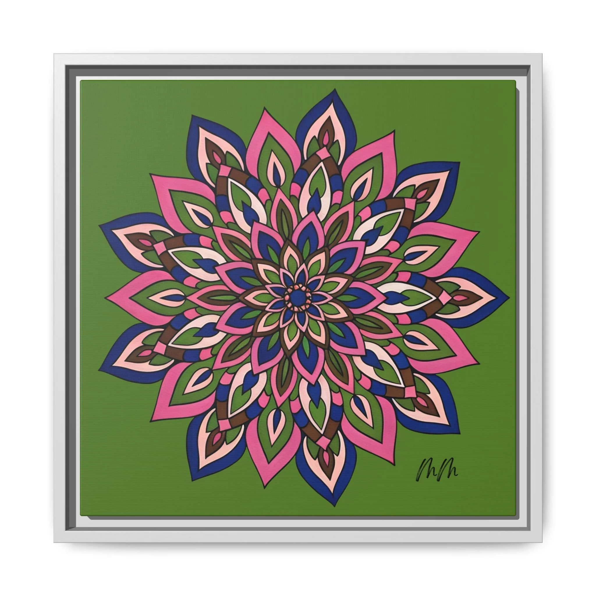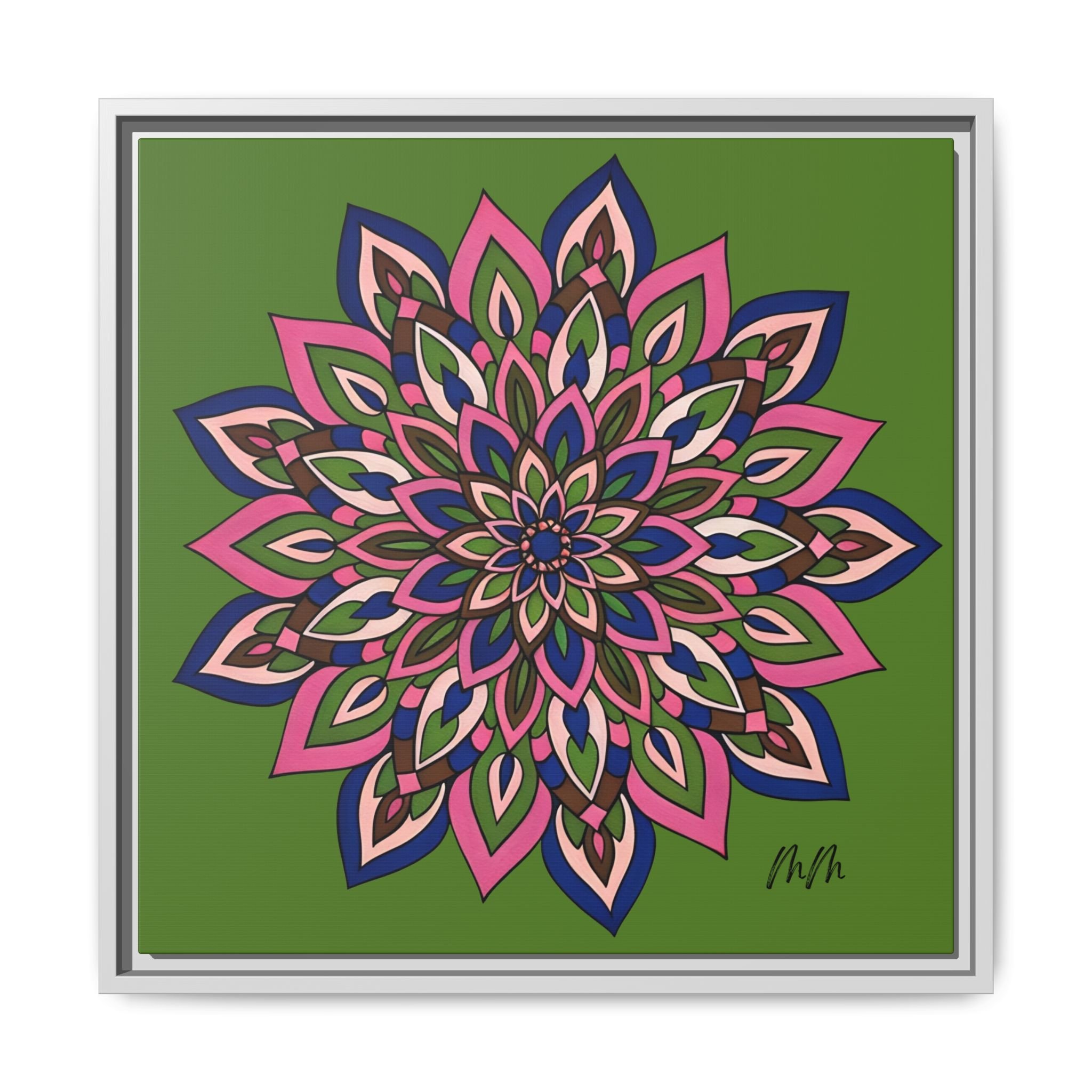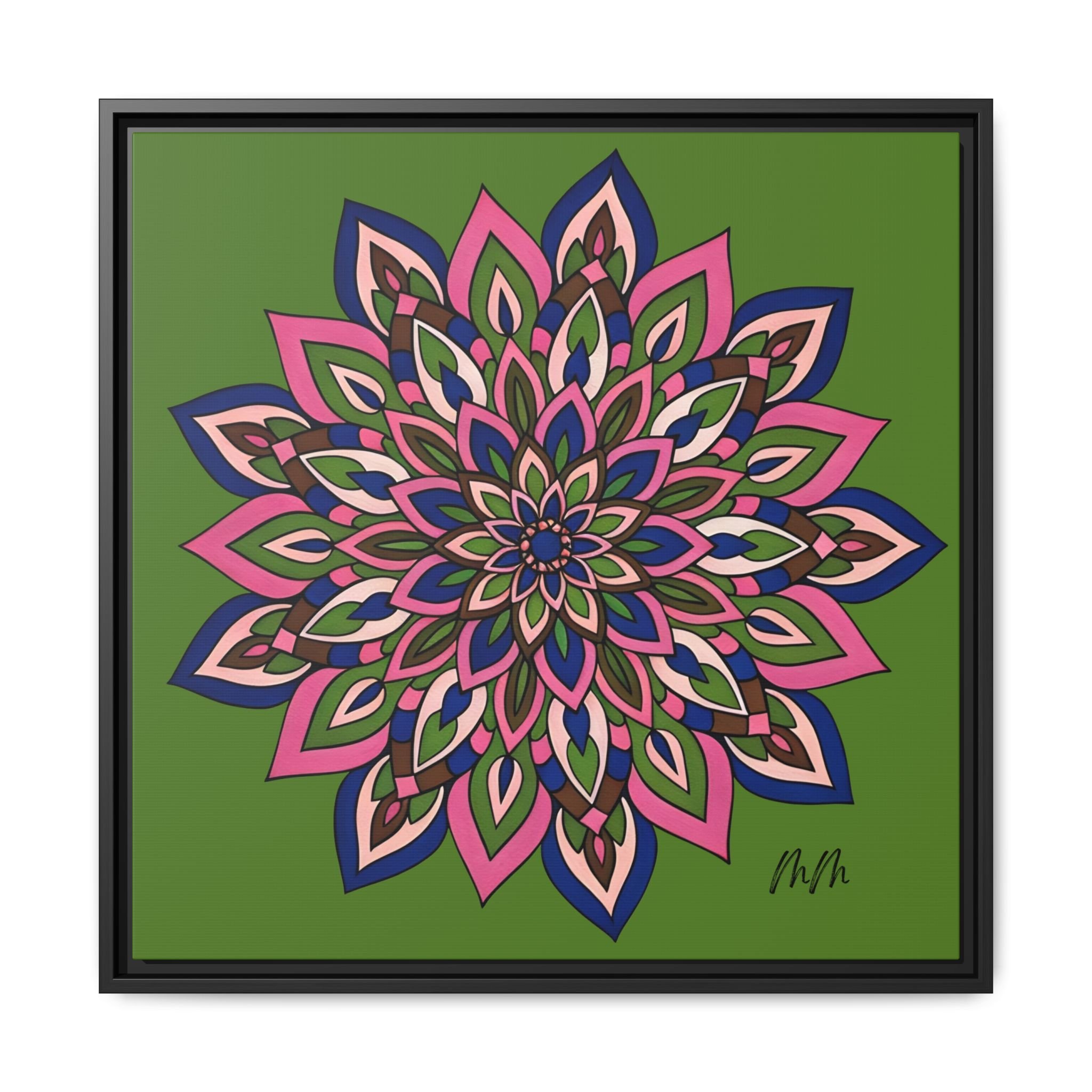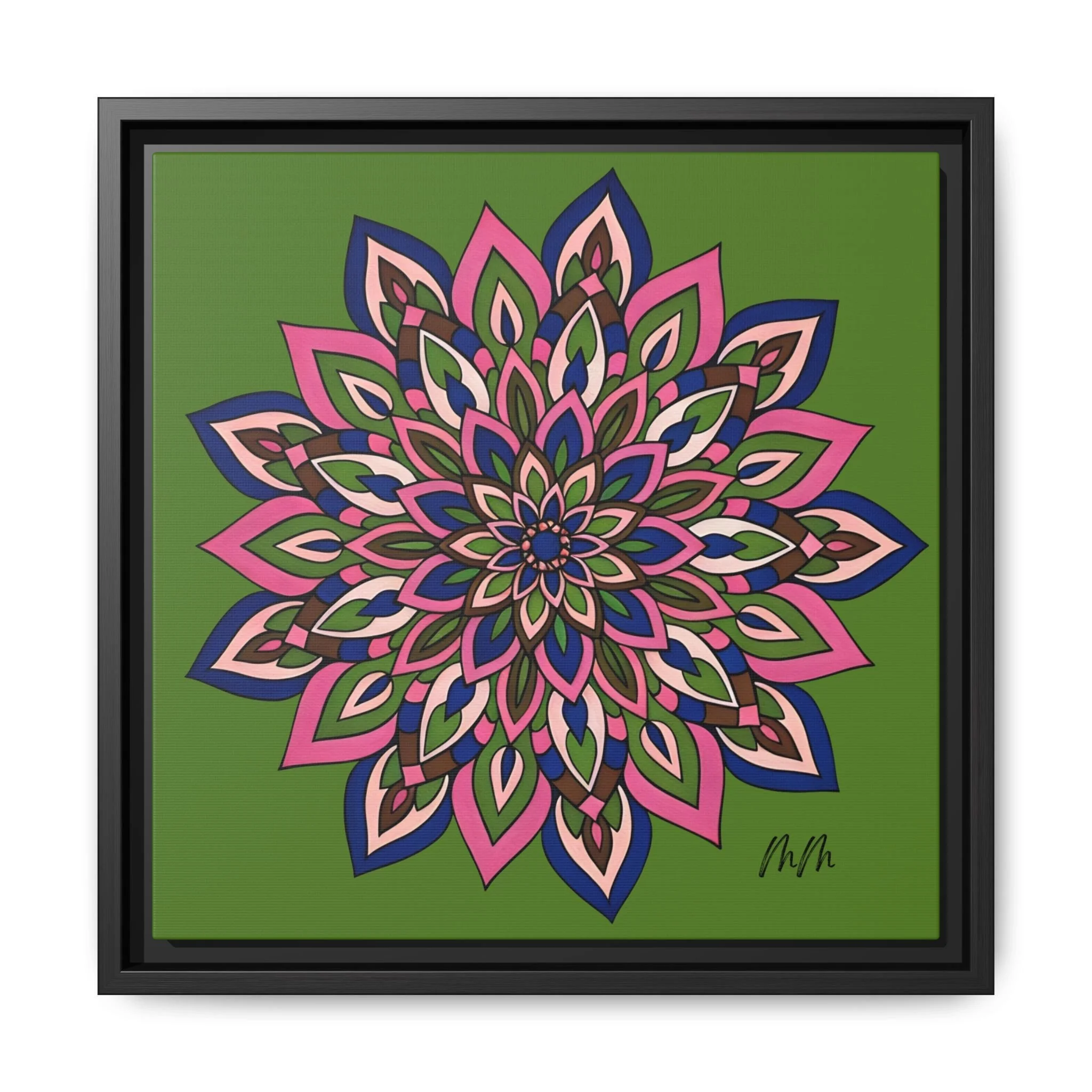 A vibrant, framed matte canvas that brings bold, layered mandala art into a living space with calm confidence. Rich pinks, deep navy and leafy greens meet in a hand-drawn floral geometry that feels both modern and meditative. The low-reflective matte surface keeps the colors deep and velvety while the slim pine frame gives clean structure — perfect for a cozy reading nook, studio wall, or entryway that welcomes color without shouting. Hang it alone as a focal point or group with other prints to build a collected, mindful gallery that reflects a love of pattern and calm energy.