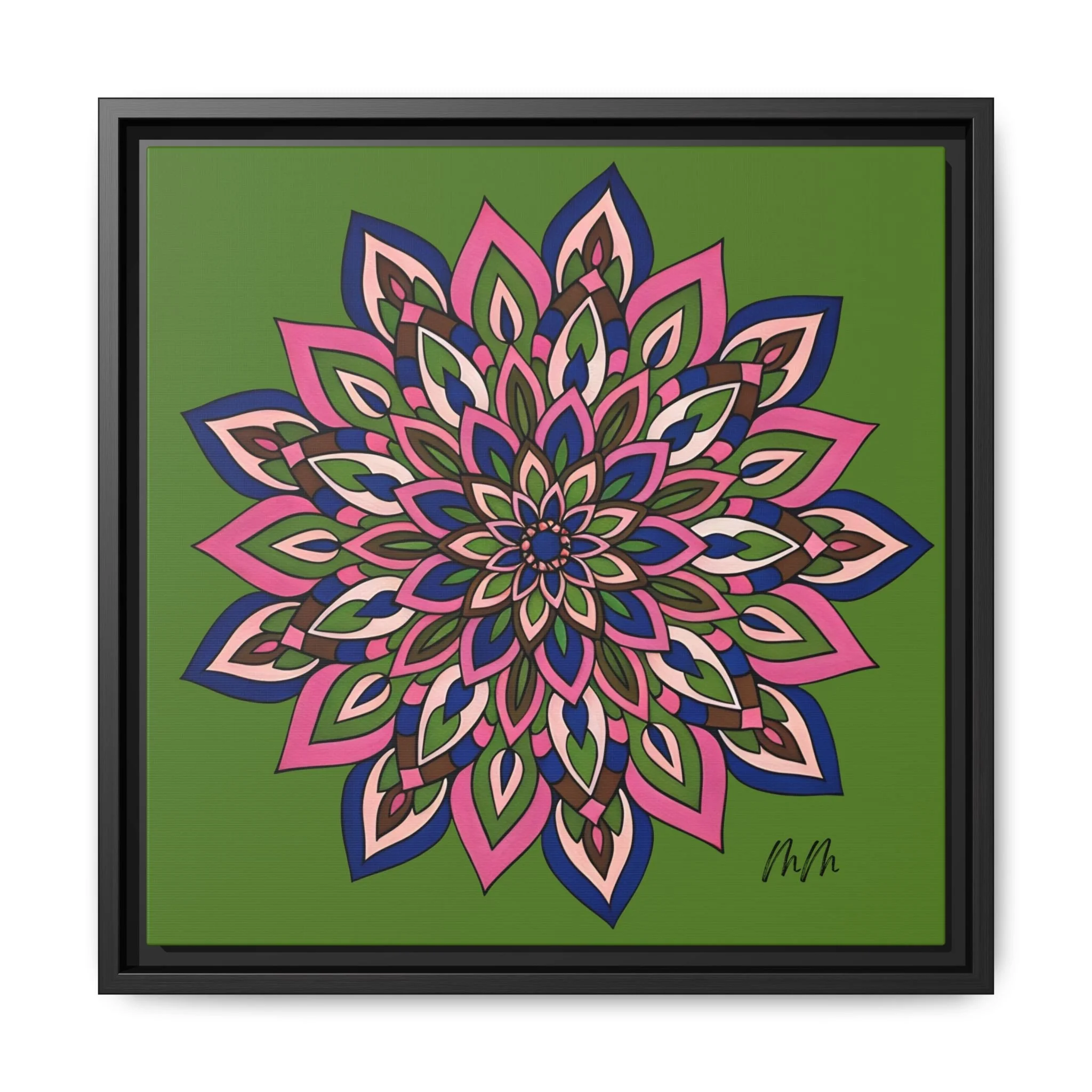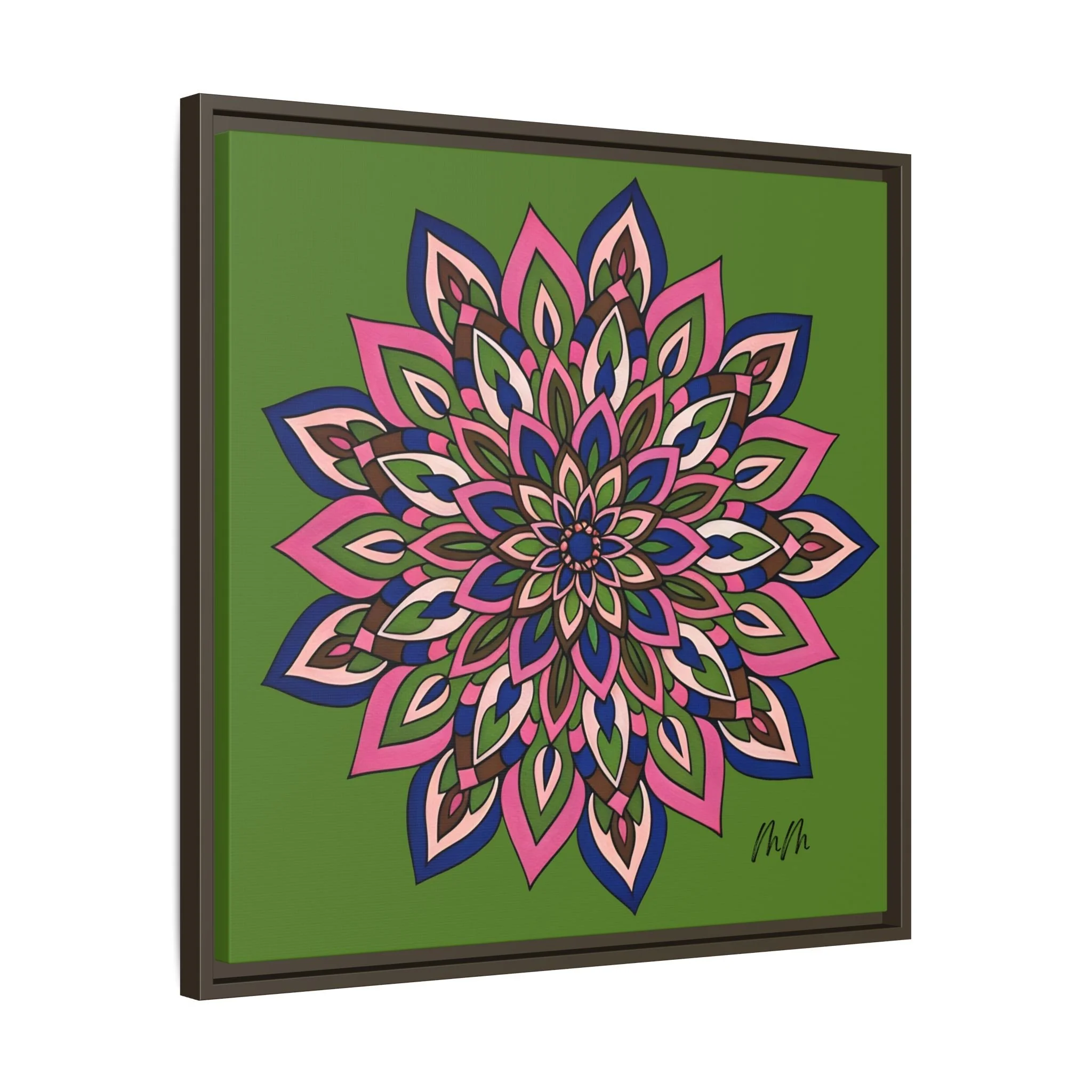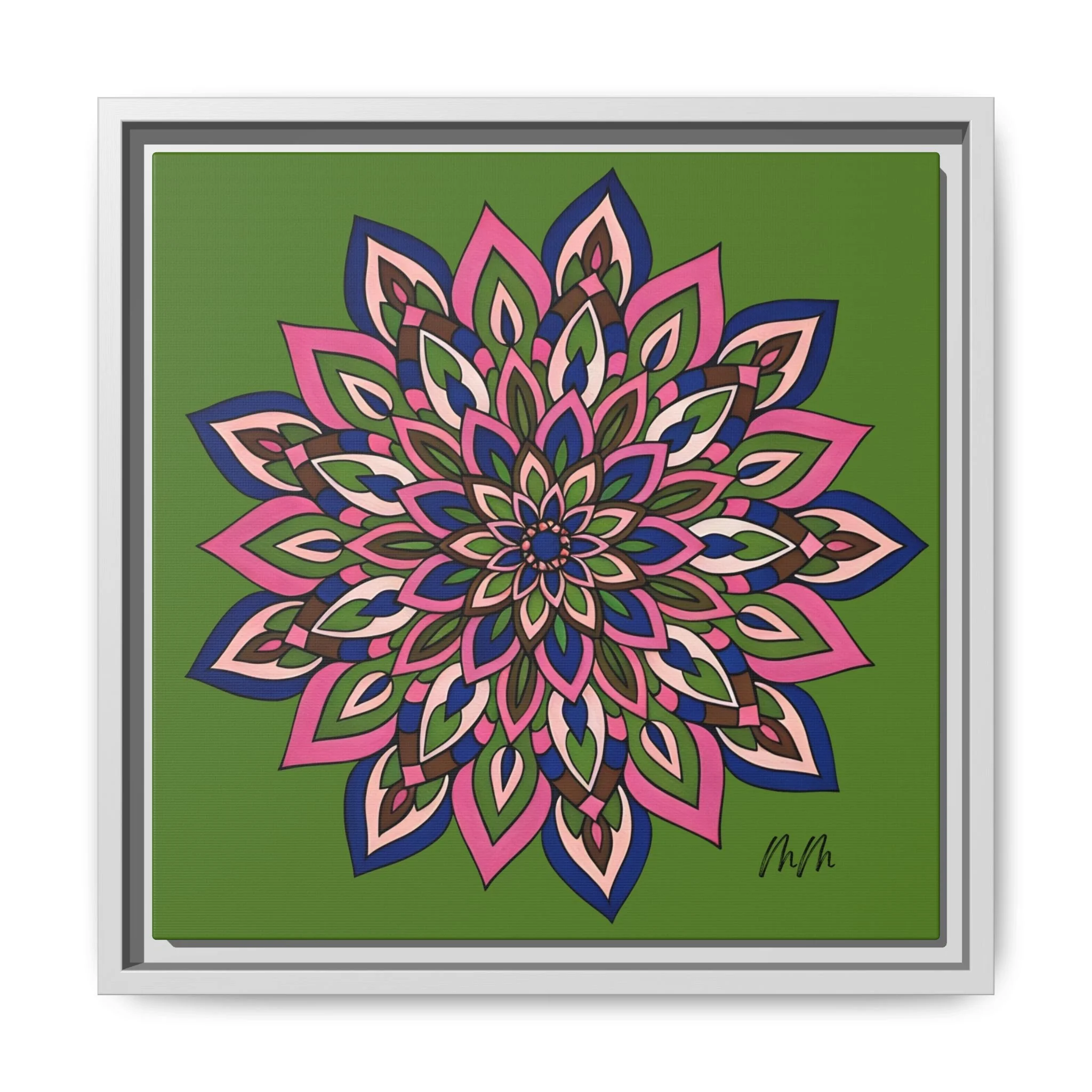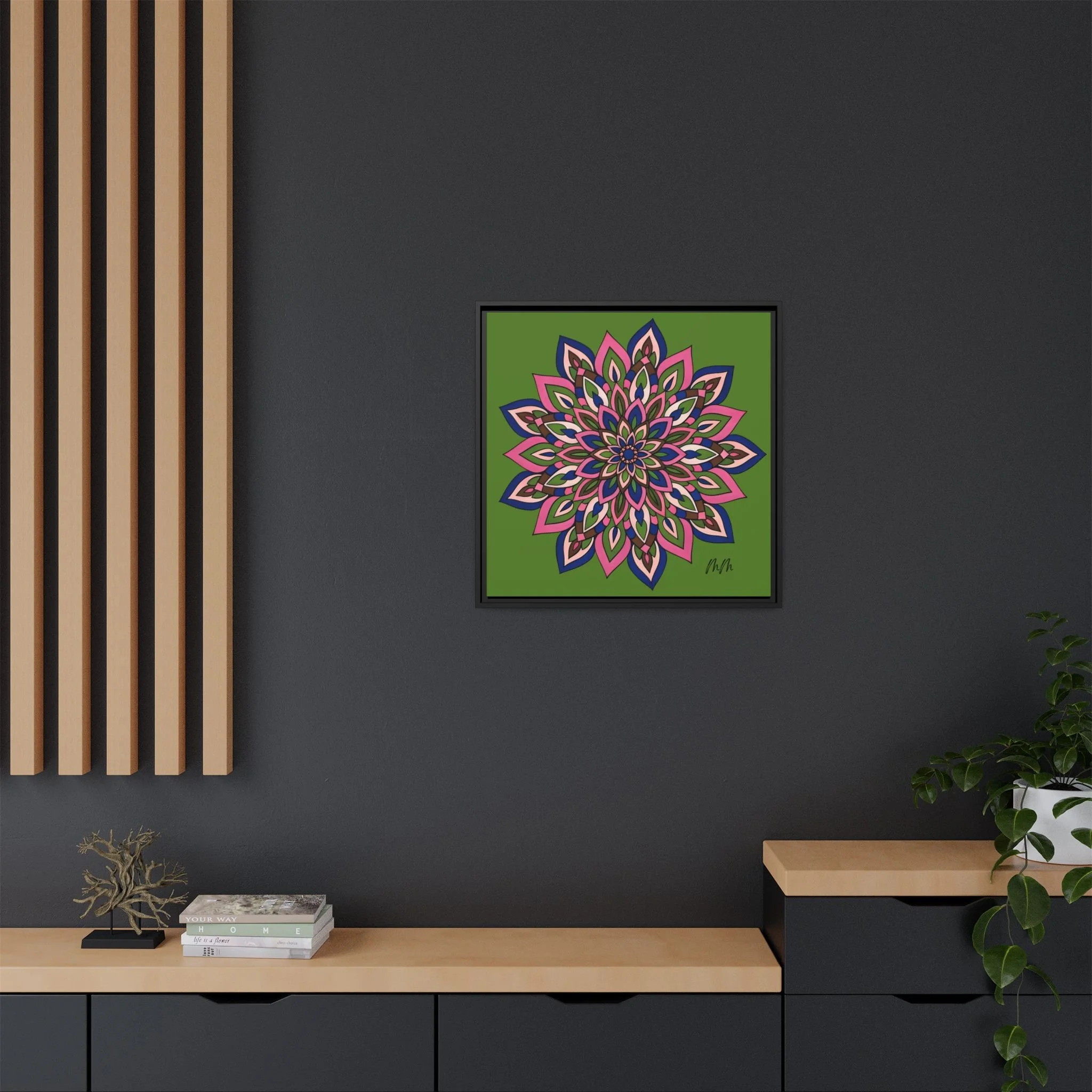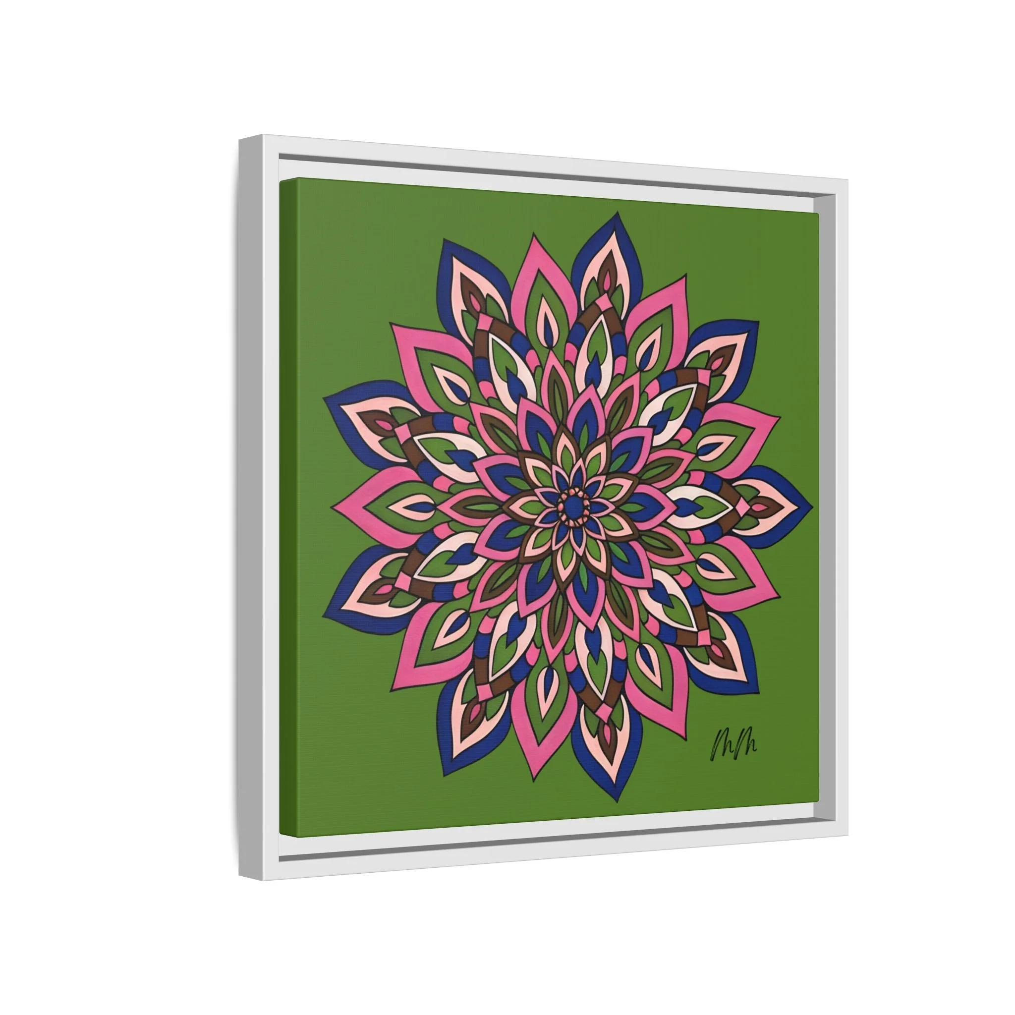 A vibrant, framed matte canvas that brings bold, layered mandala art into a living space with calm confidence. Rich pinks, deep navy and leafy greens meet in a hand-drawn floral geometry that feels both modern and meditative. The low-reflective matte surface keeps the colors deep and velvety while the slim pine frame gives clean structure — perfect for a cozy reading nook, studio wall, or entryway that welcomes color without shouting. Hang it alone as a focal point or group with other prints to build a collected, mindful gallery that reflects a love of pattern and calm energy.