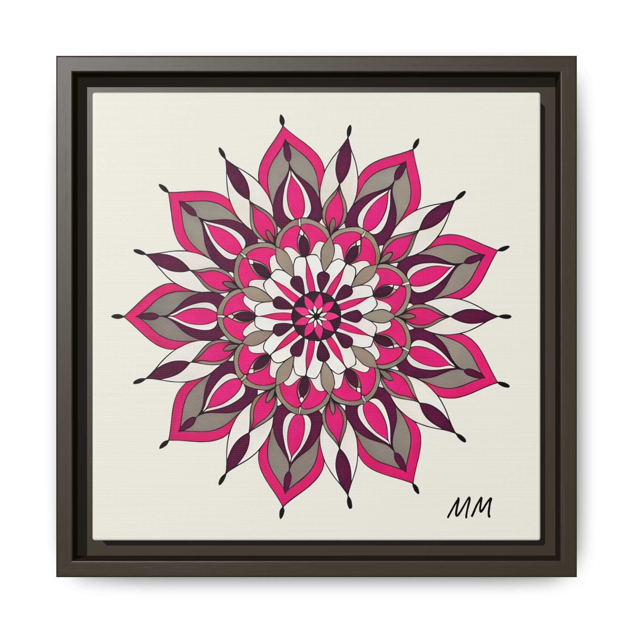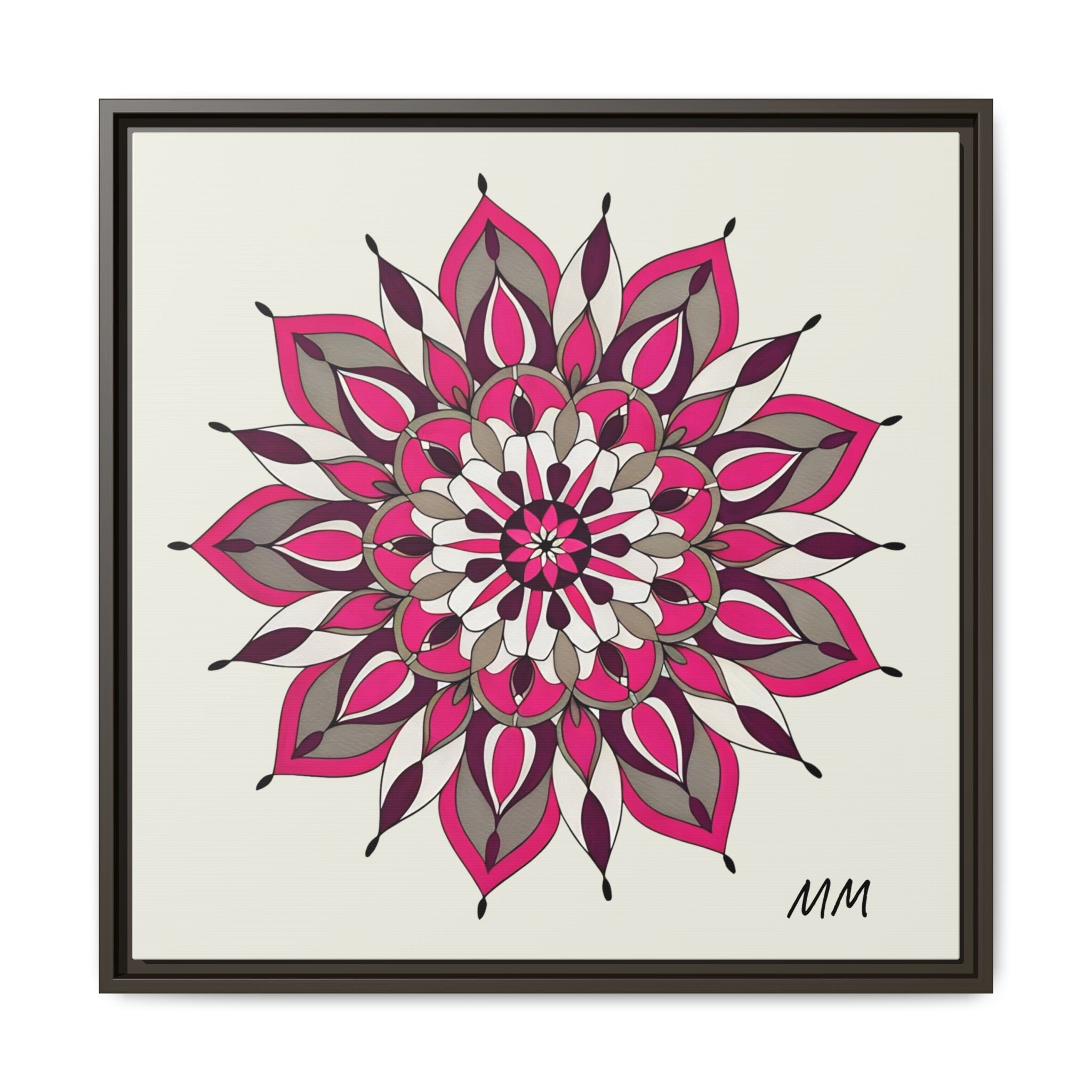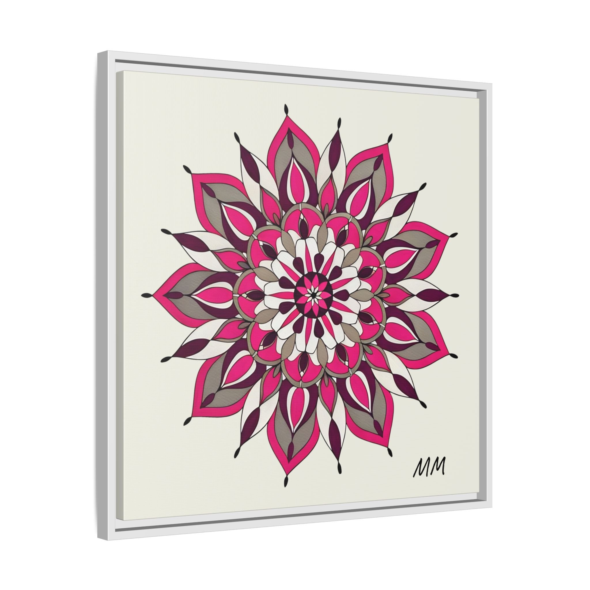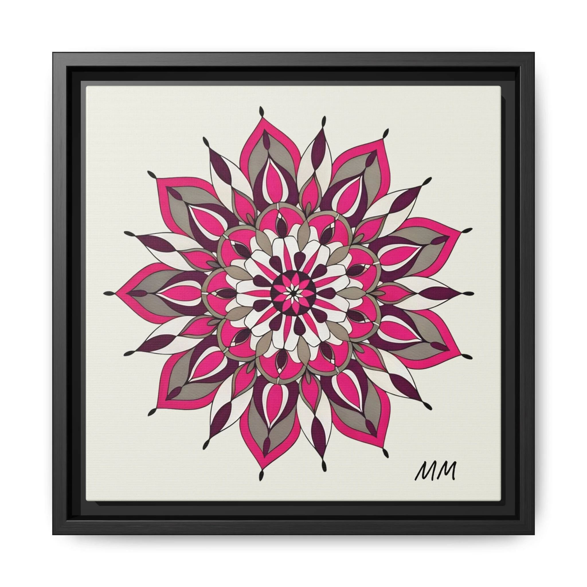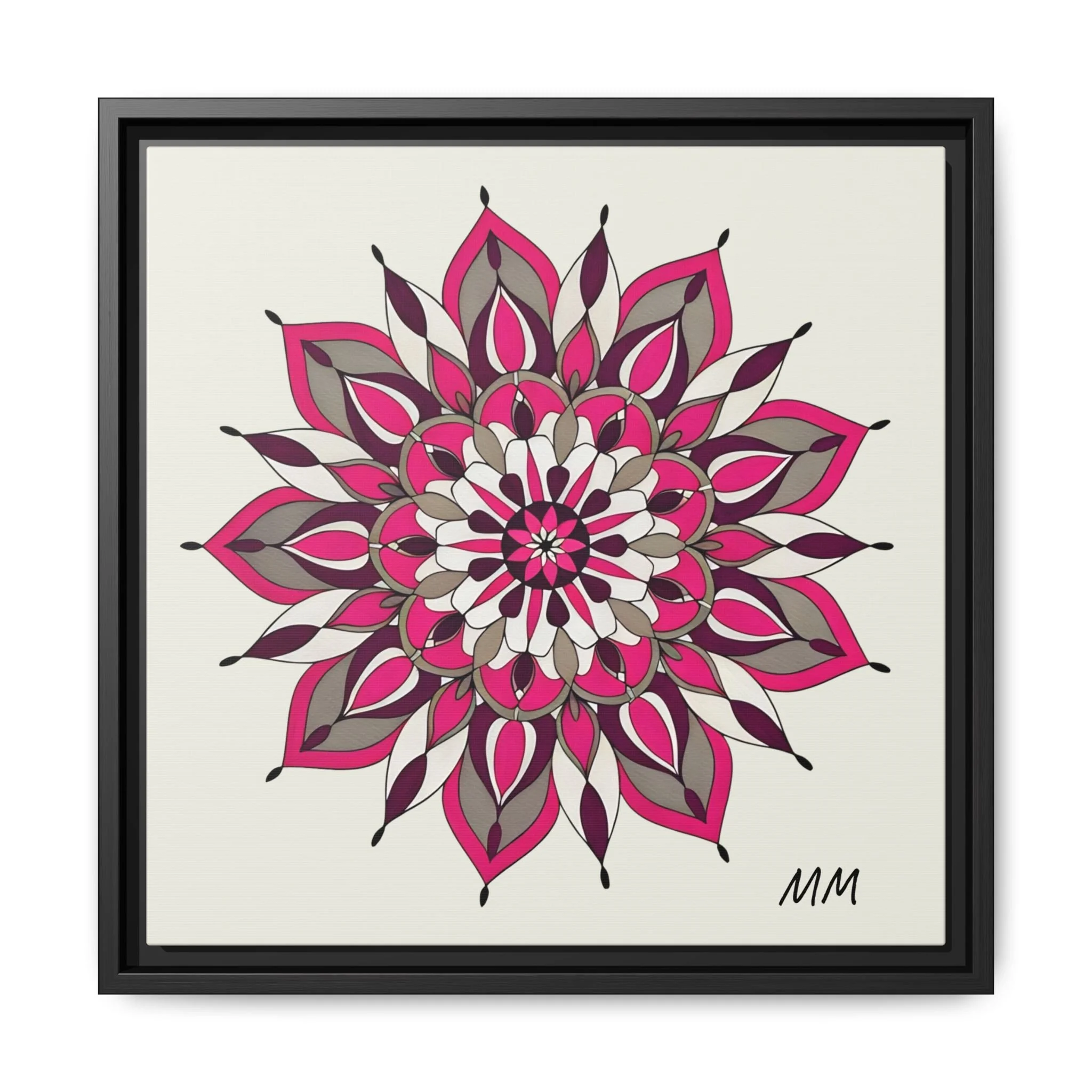 A framed matte canvas print that brings a calm, modern energy to any room. The hand-drawn mandala of layered petals in deep pinks, muted mauves and soft grays sits on a warm ivory ground, creating a bold yet meditative focal point. The slim black pine frame gives the piece a clean, contemporary edge while the canvas texture keeps it feeling handcrafted and personal. Hang it above a console, lean it on a bookshelf, or pair it with other botanical or geometric pieces to build a curated wall that feels intentional and reflective.