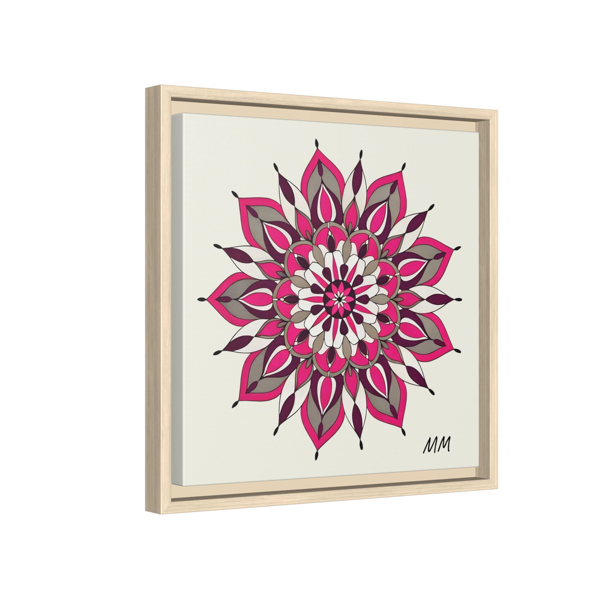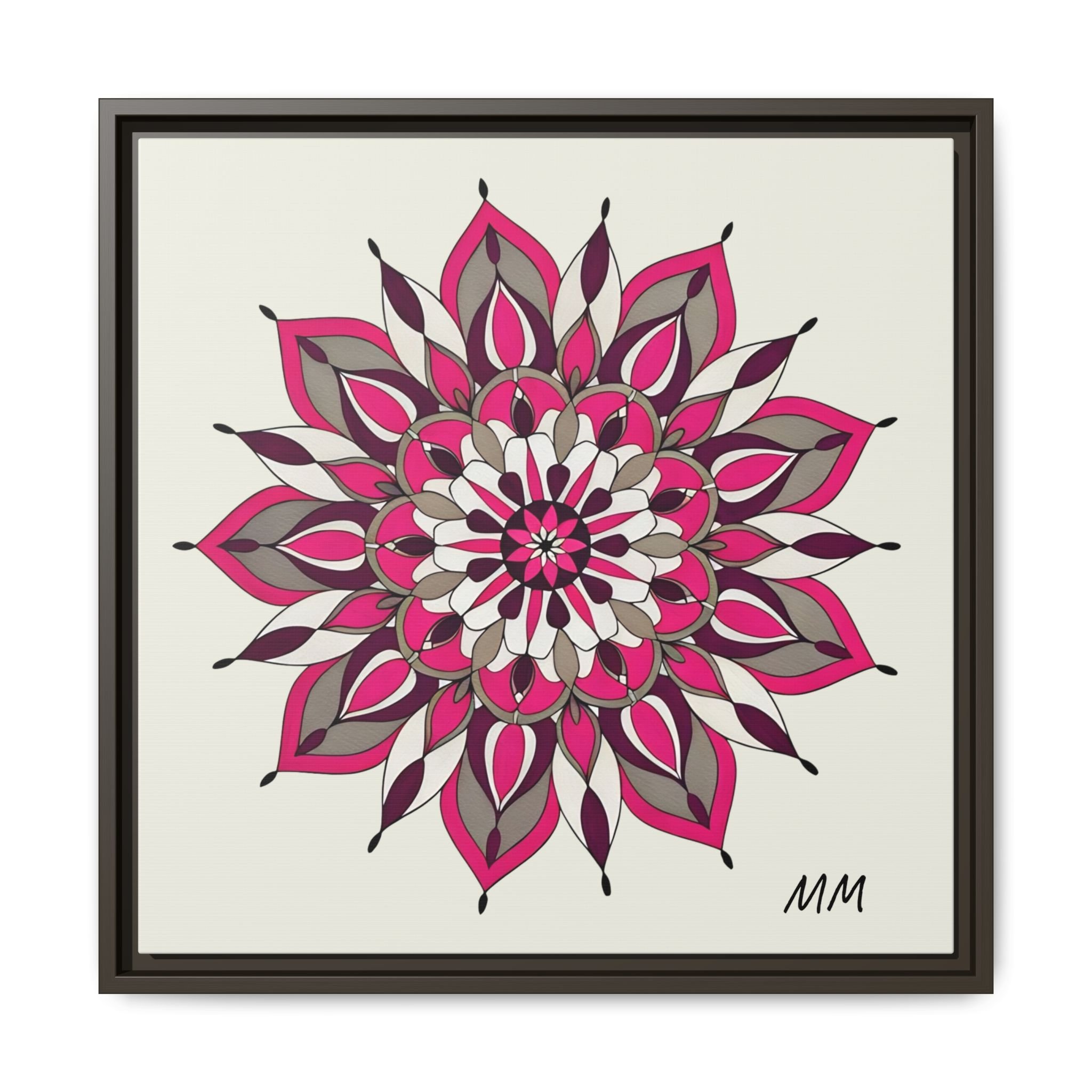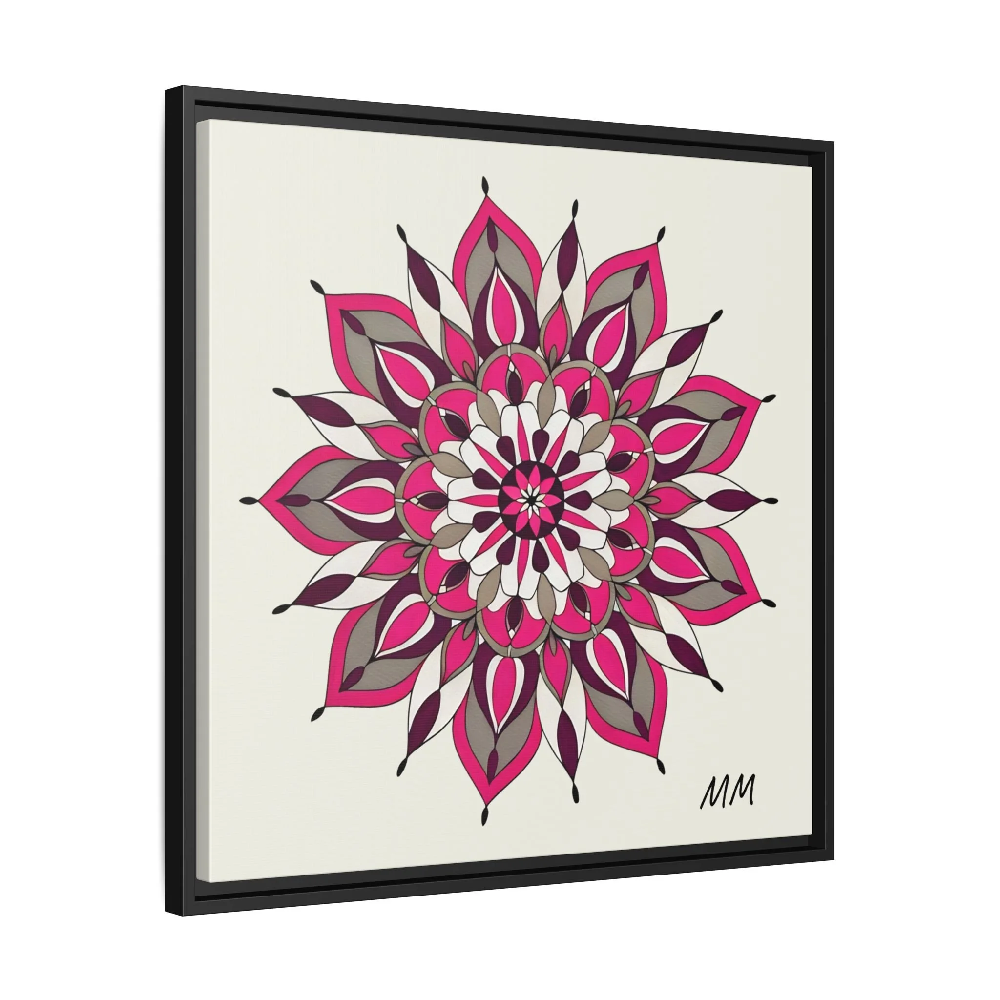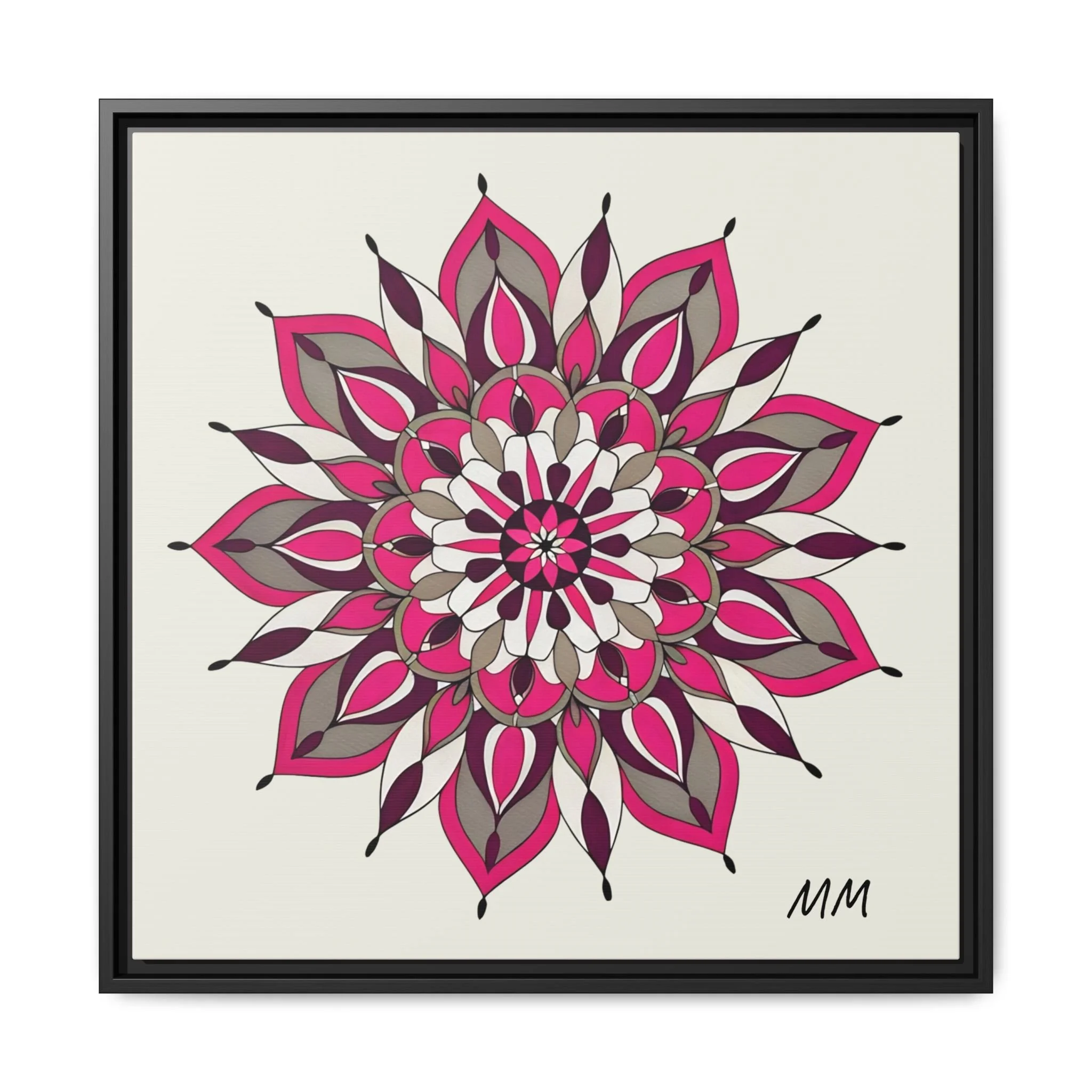 A framed matte canvas print that brings a calm, modern energy to any room. The hand-drawn mandala of layered petals in deep pinks, muted mauves and soft grays sits on a warm ivory ground, creating a bold yet meditative focal point. The slim black pine frame gives the piece a clean, contemporary edge while the canvas texture keeps it feeling handcrafted and personal. Hang it above a console, lean it on a bookshelf, or pair it with other botanical or geometric pieces to build a curated wall that feels intentional and reflective.