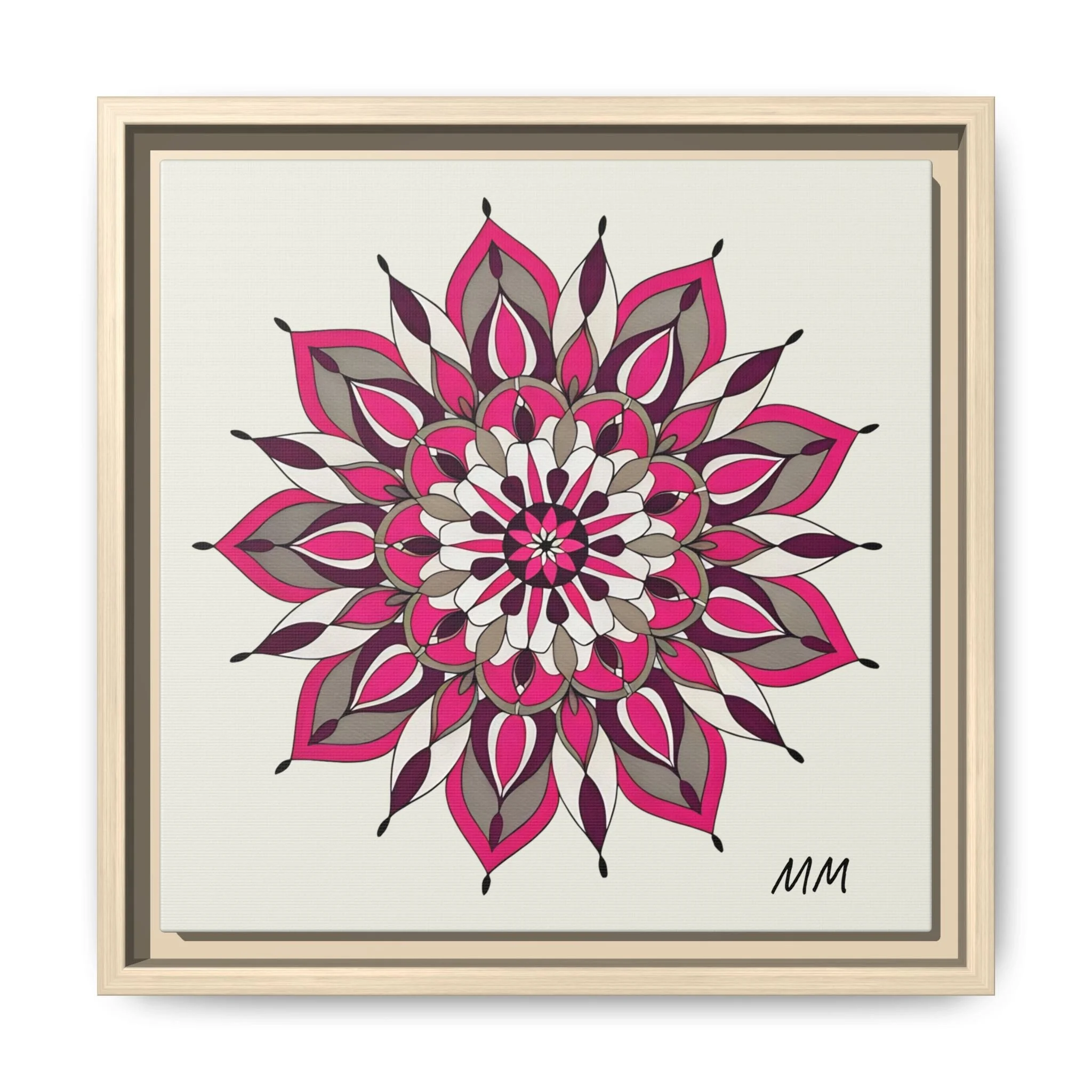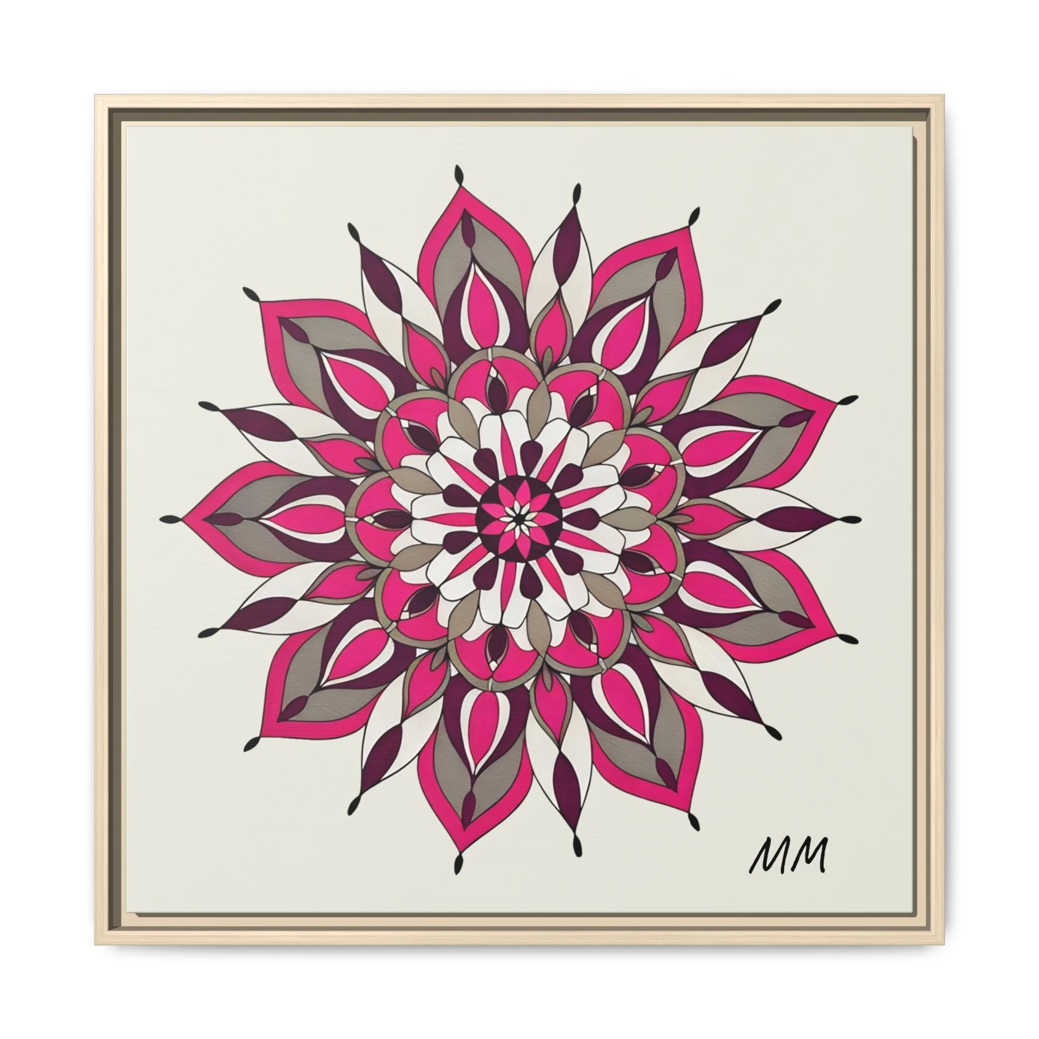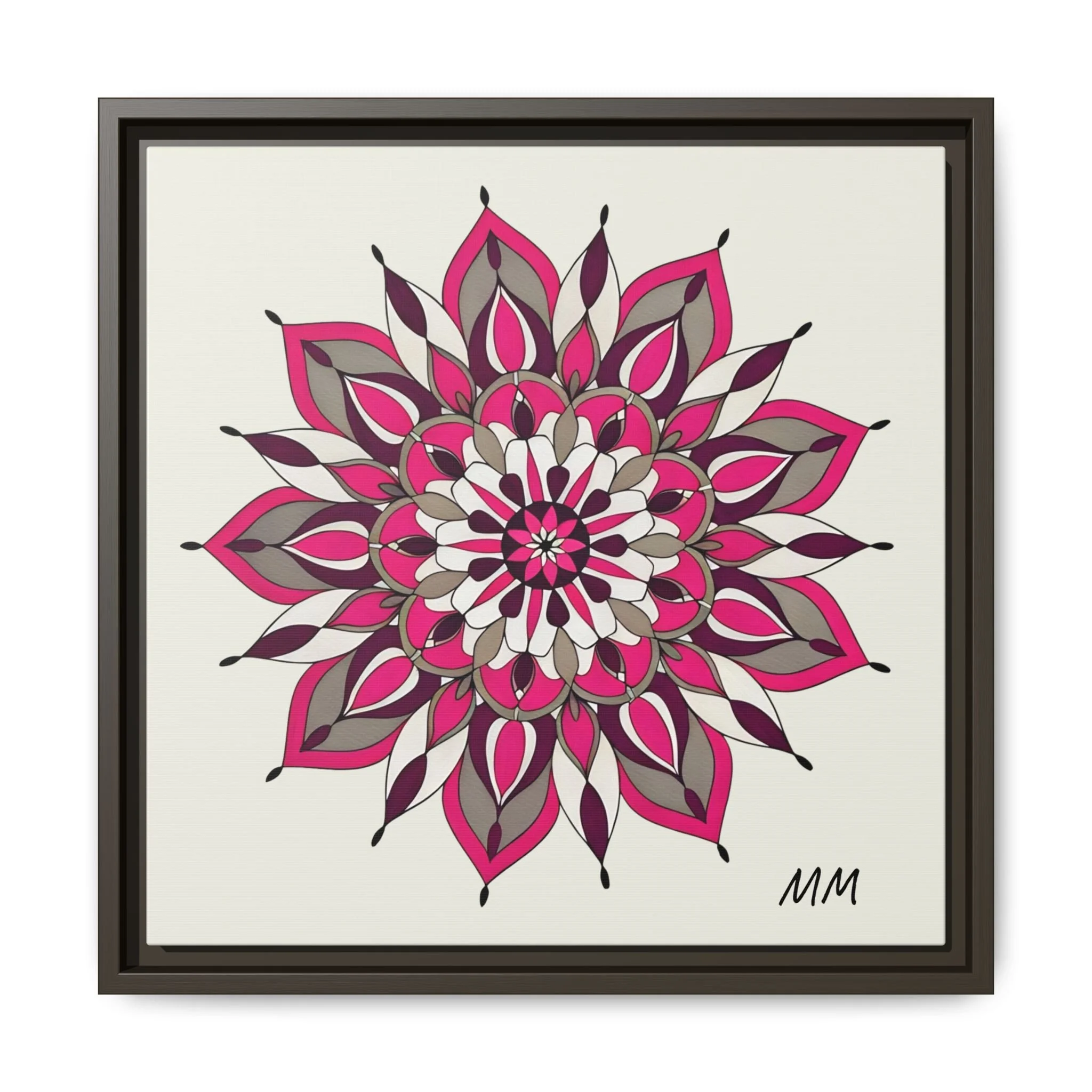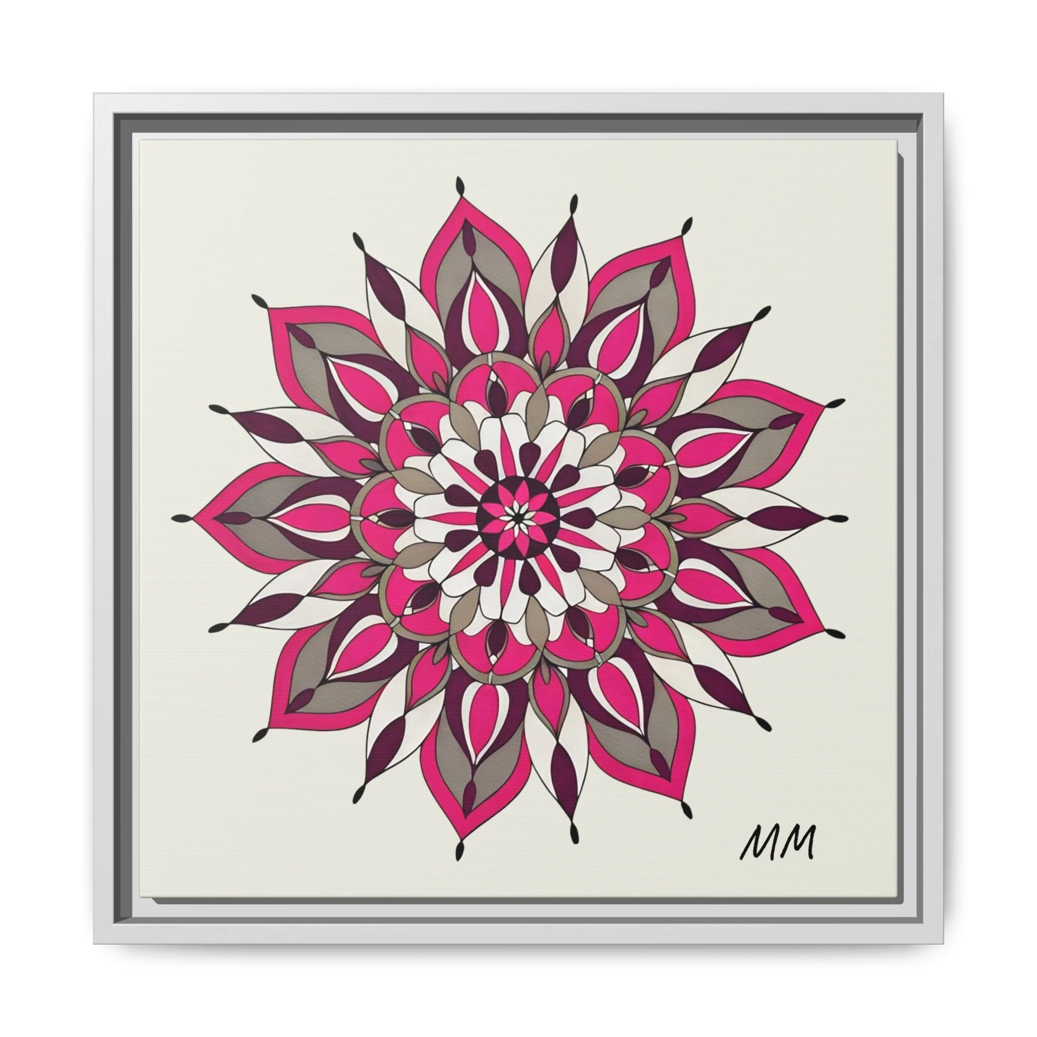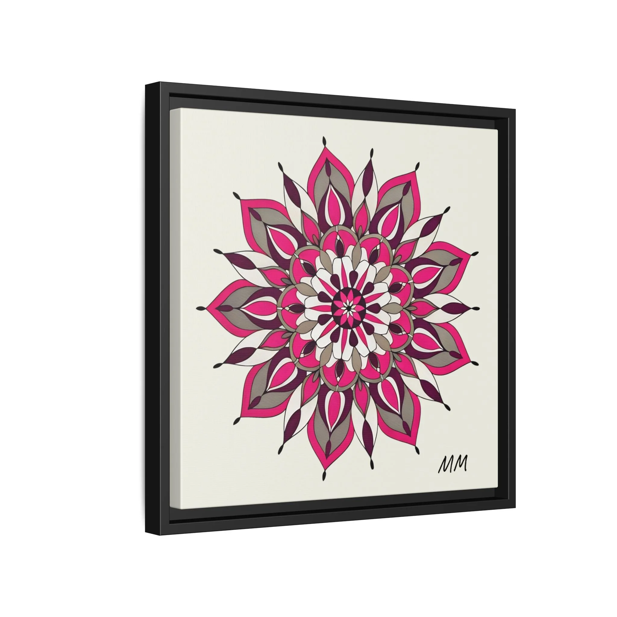 A framed matte canvas print that brings a calm, modern energy to any room. The hand-drawn mandala of layered petals in deep pinks, muted mauves and soft grays sits on a warm ivory ground, creating a bold yet meditative focal point. The slim black pine frame gives the piece a clean, contemporary edge while the canvas texture keeps it feeling handcrafted and personal. Hang it above a console, lean it on a bookshelf, or pair it with other botanical or geometric pieces to build a curated wall that feels intentional and reflective.
