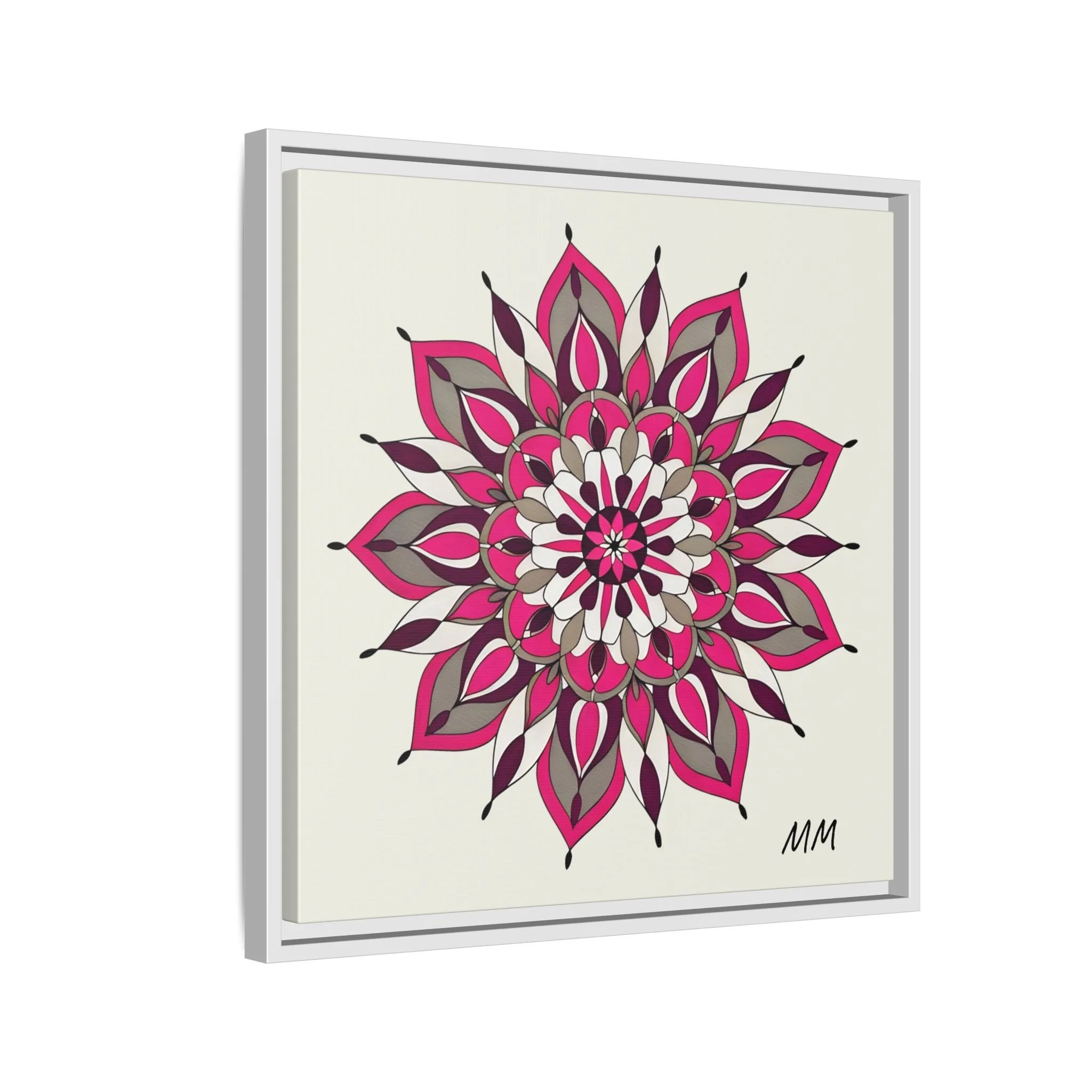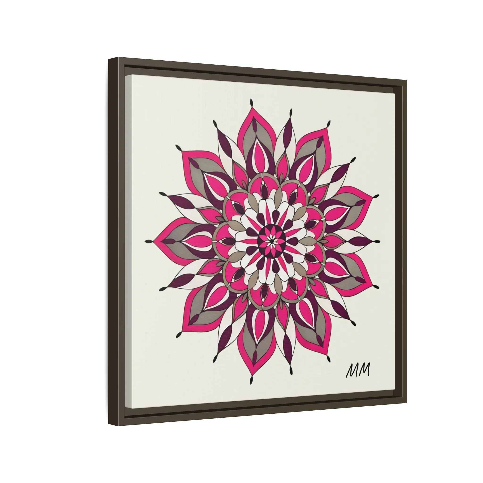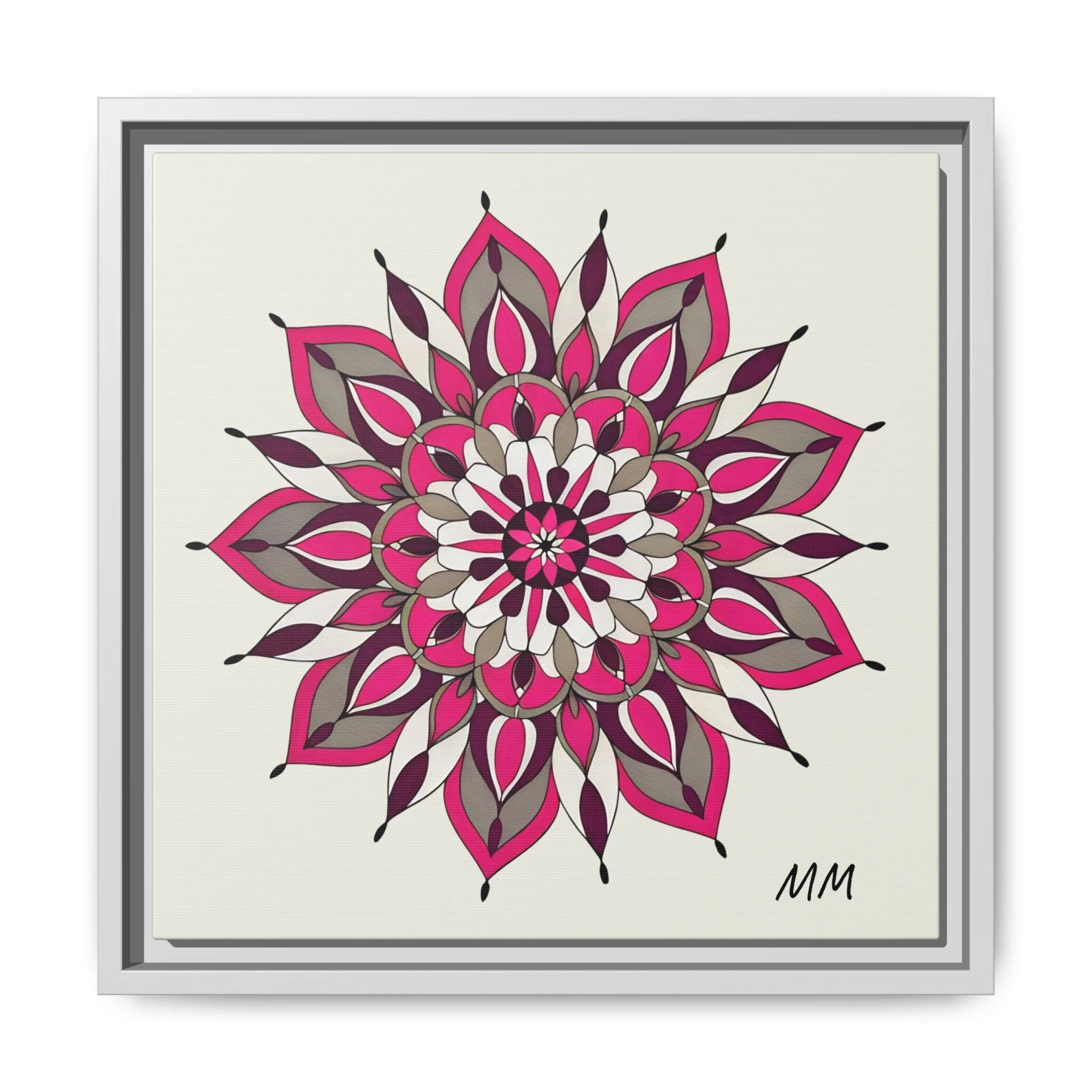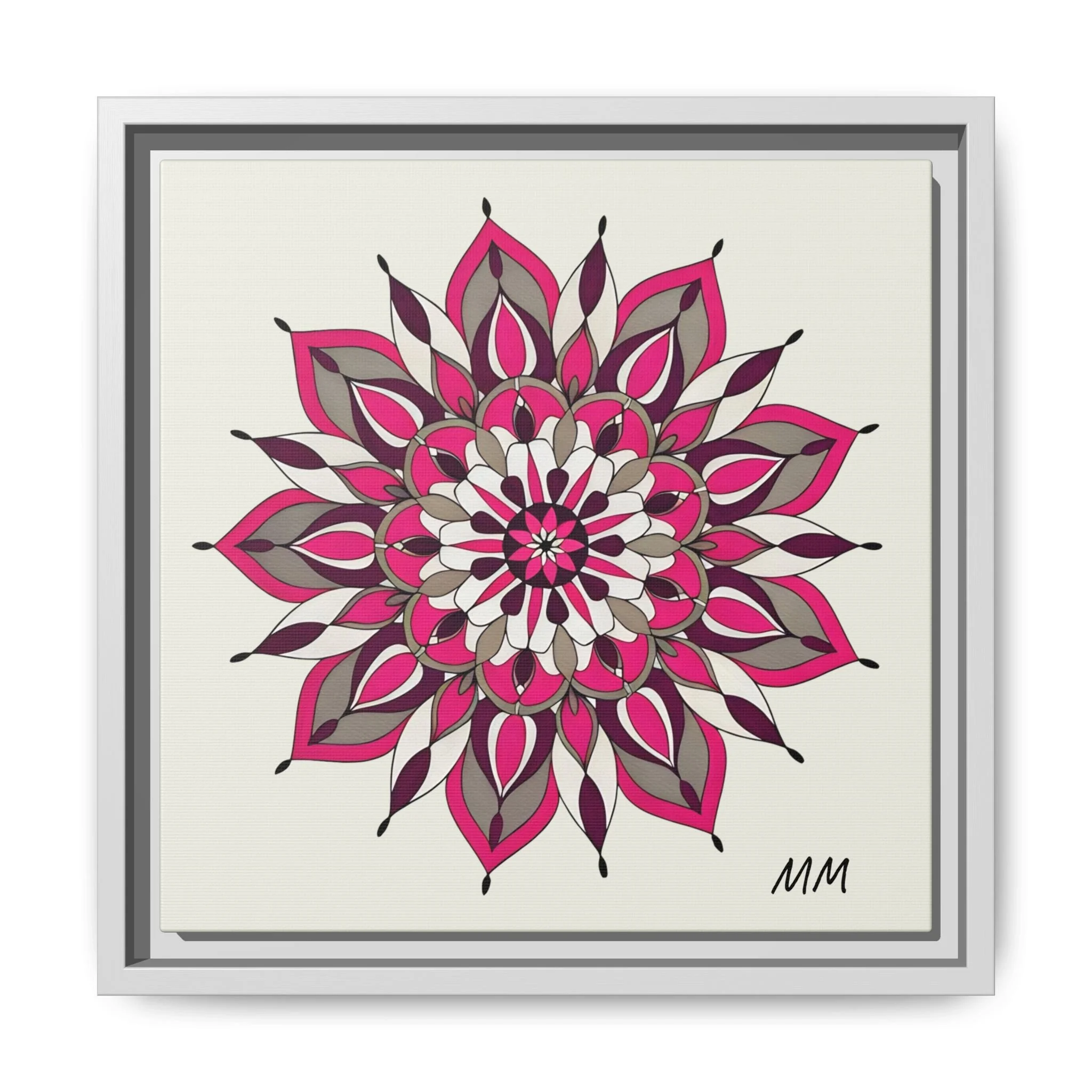 A framed matte canvas print that brings a calm, modern energy to any room. The hand-drawn mandala of layered petals in deep pinks, muted mauves and soft grays sits on a warm ivory ground, creating a bold yet meditative focal point. The slim black pine frame gives the piece a clean, contemporary edge while the canvas texture keeps it feeling handcrafted and personal. Hang it above a console, lean it on a bookshelf, or pair it with other botanical or geometric pieces to build a curated wall that feels intentional and reflective.