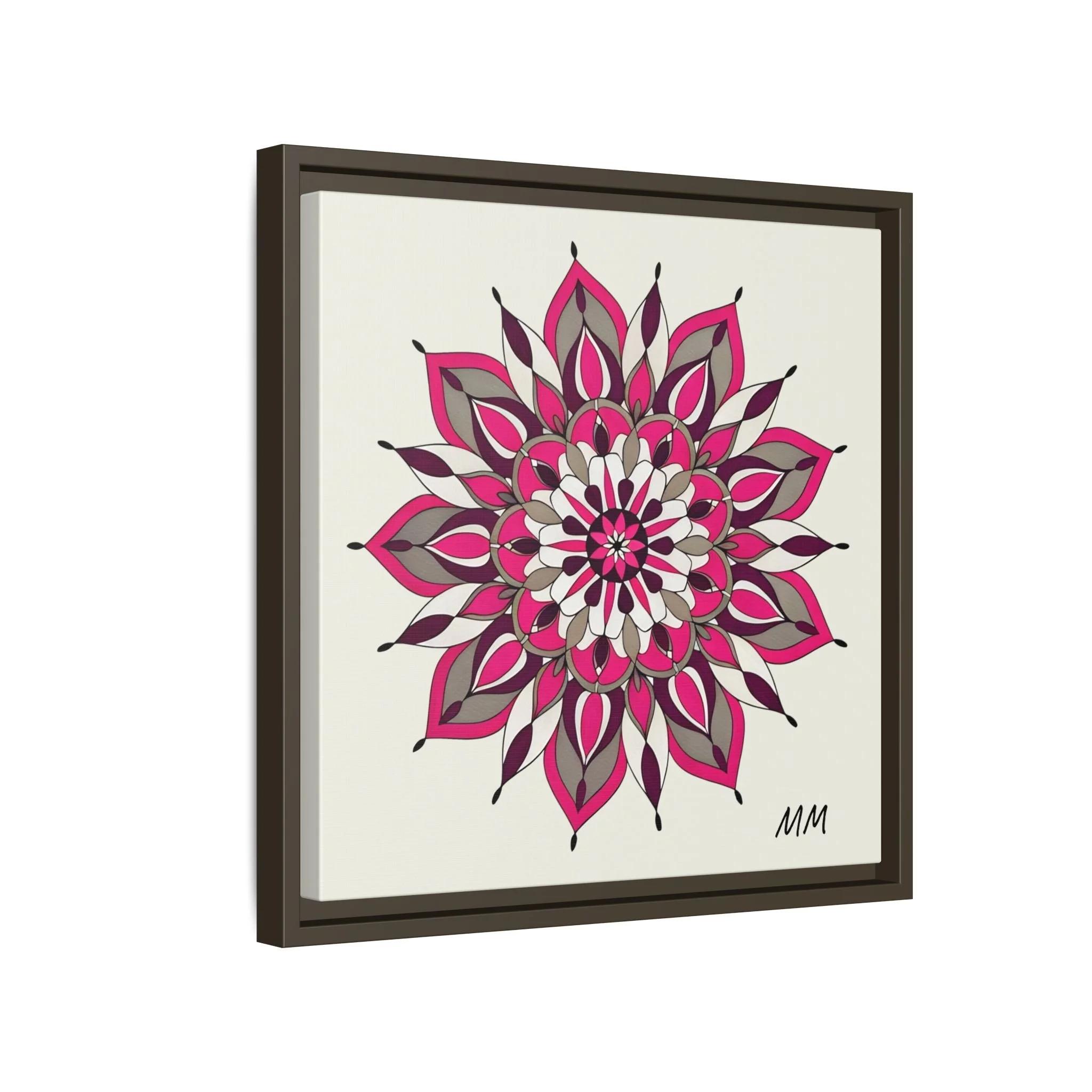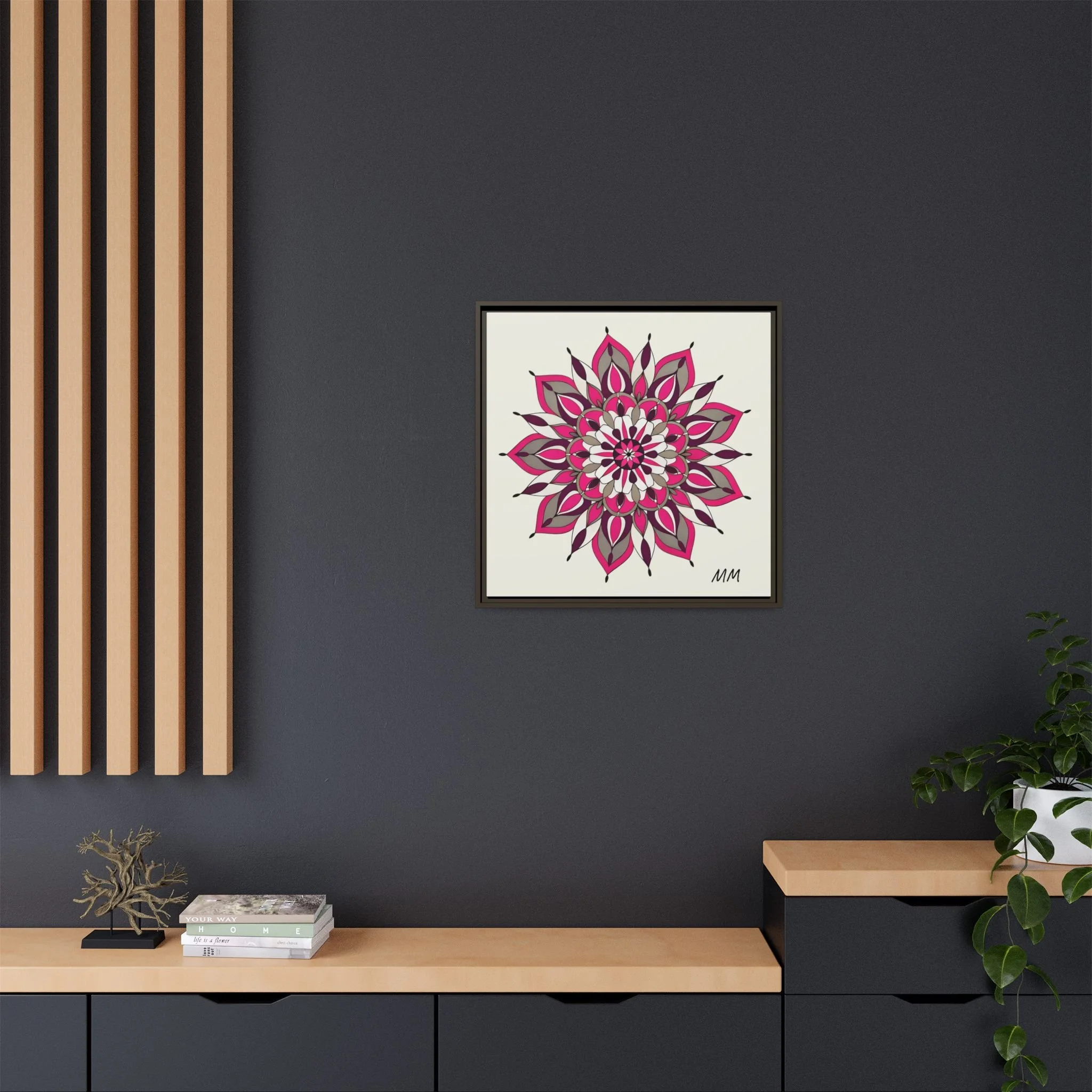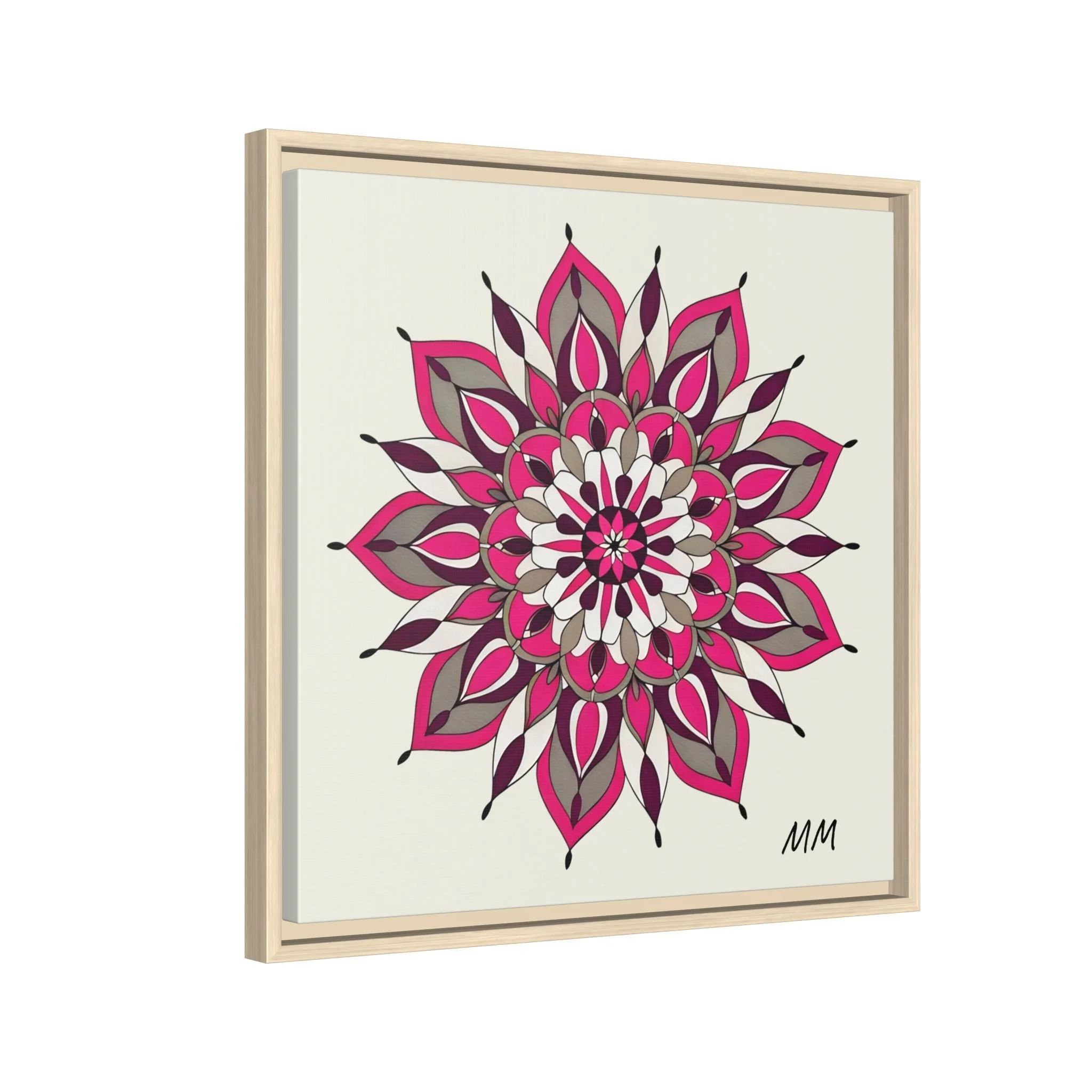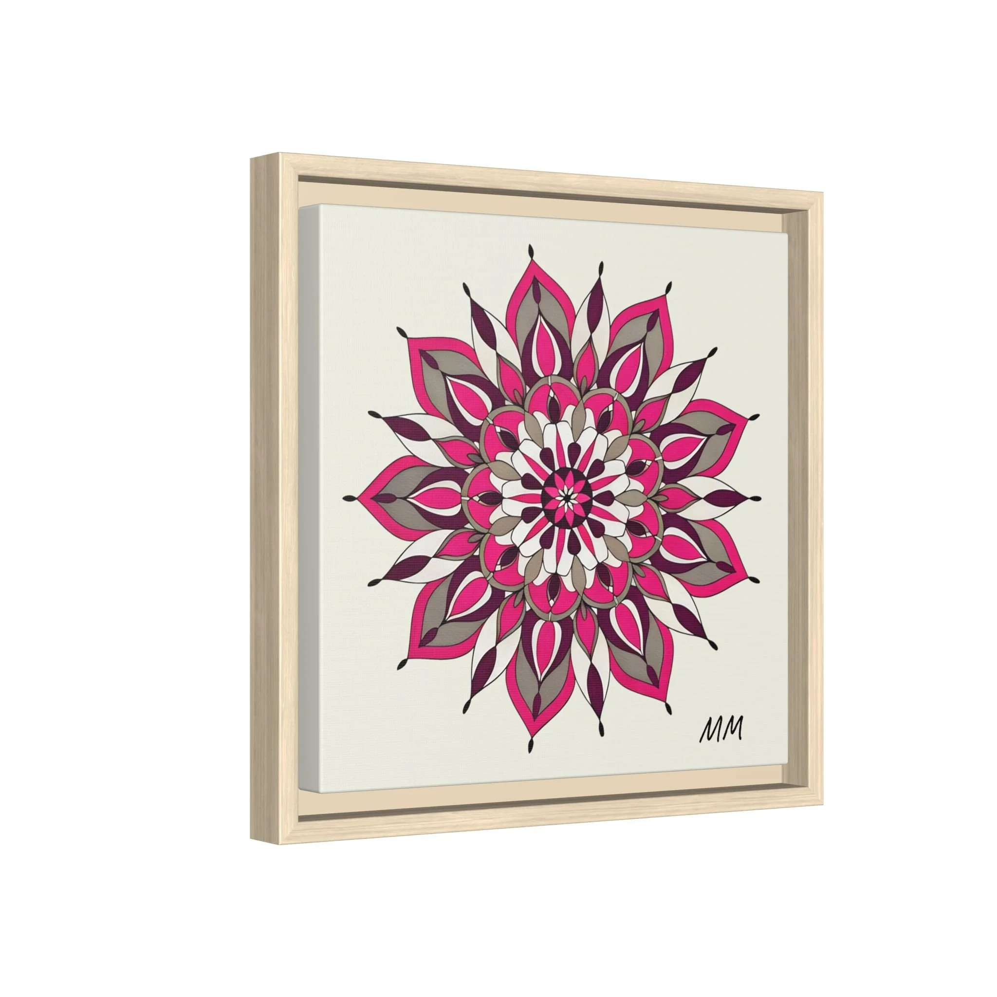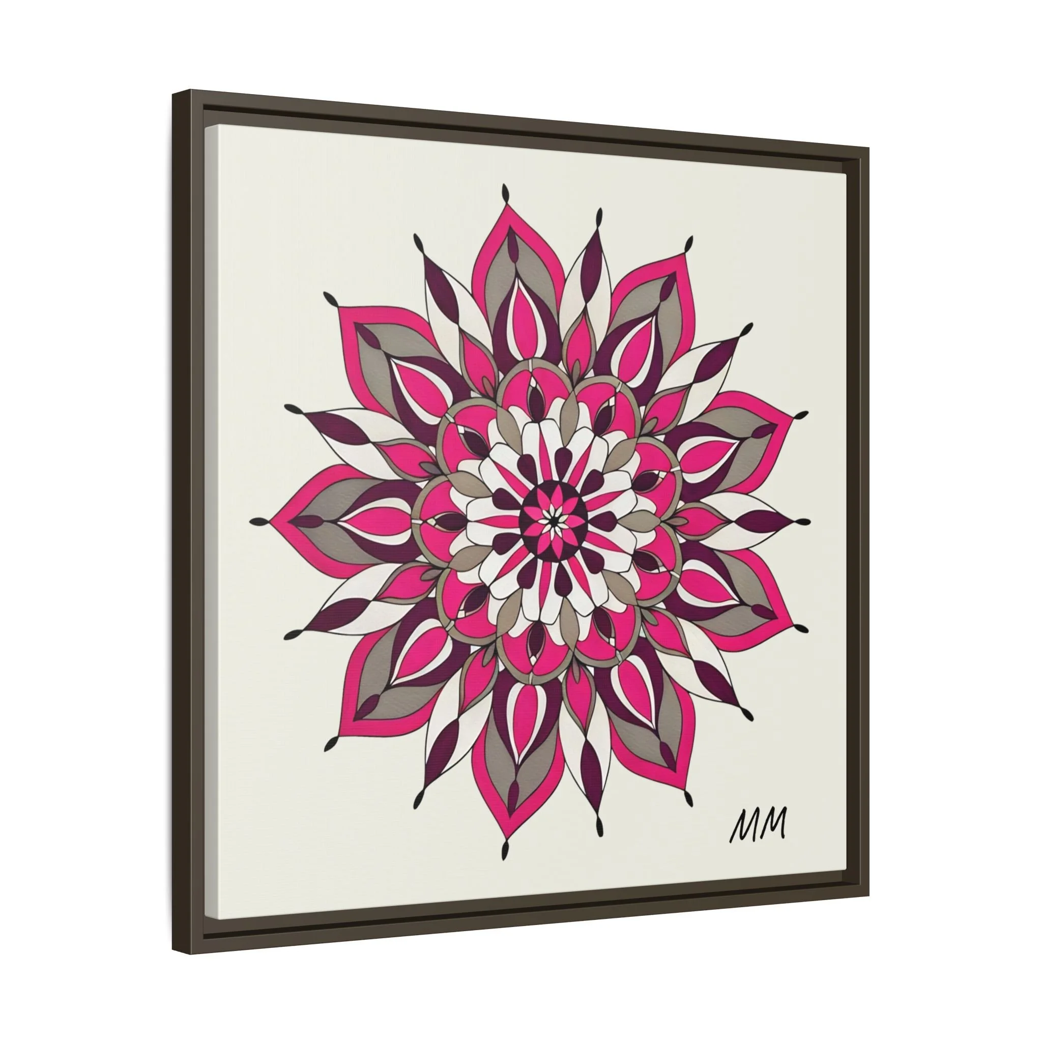 A framed matte canvas print that brings a calm, modern energy to any room. The hand-drawn mandala of layered petals in deep pinks, muted mauves and soft grays sits on a warm ivory ground, creating a bold yet meditative focal point. The slim black pine frame gives the piece a clean, contemporary edge while the canvas texture keeps it feeling handcrafted and personal. Hang it above a console, lean it on a bookshelf, or pair it with other botanical or geometric pieces to build a curated wall that feels intentional and reflective.