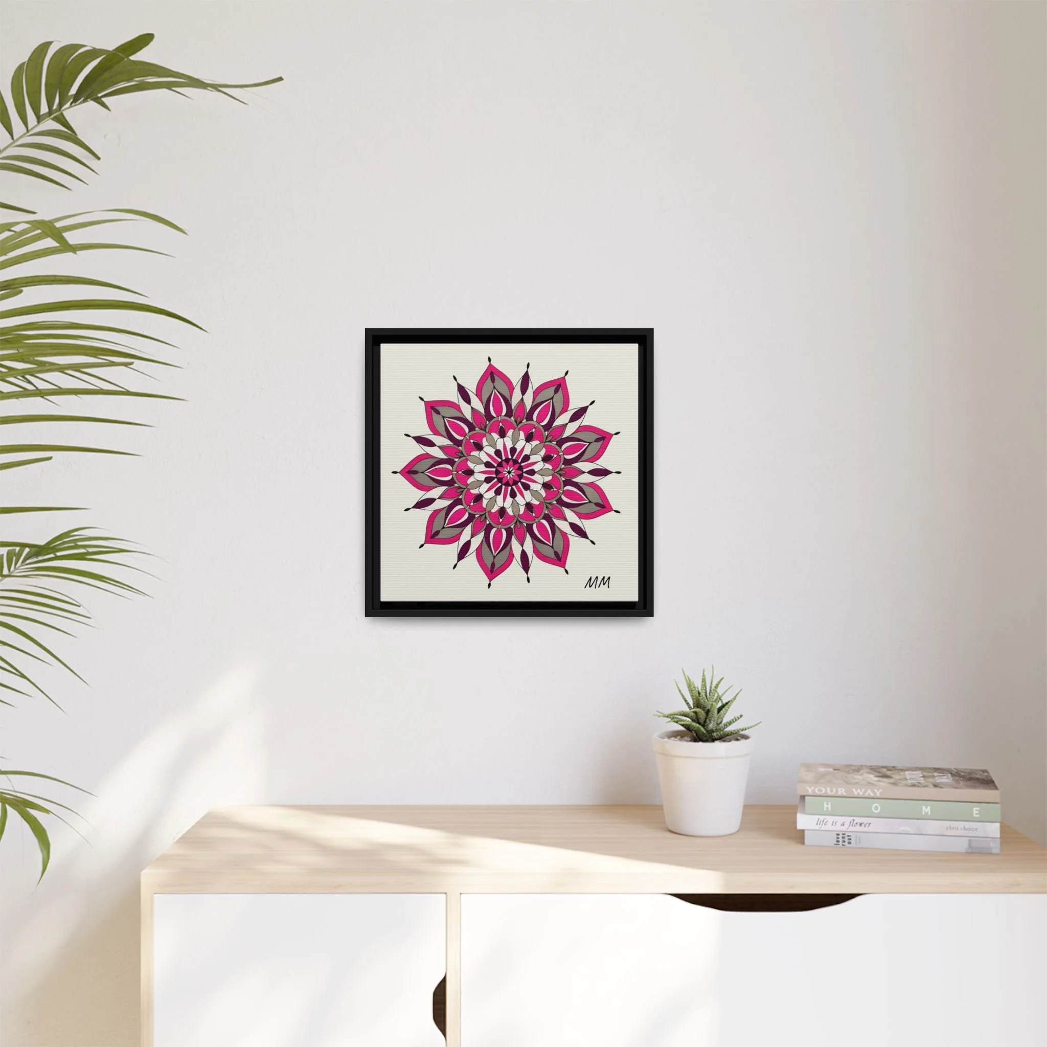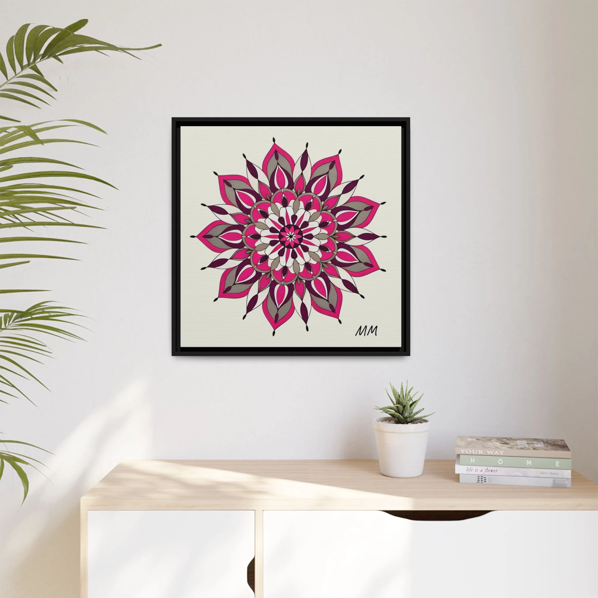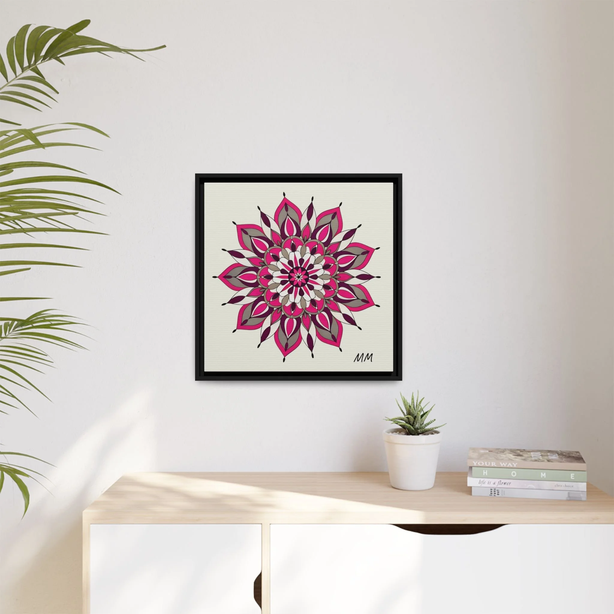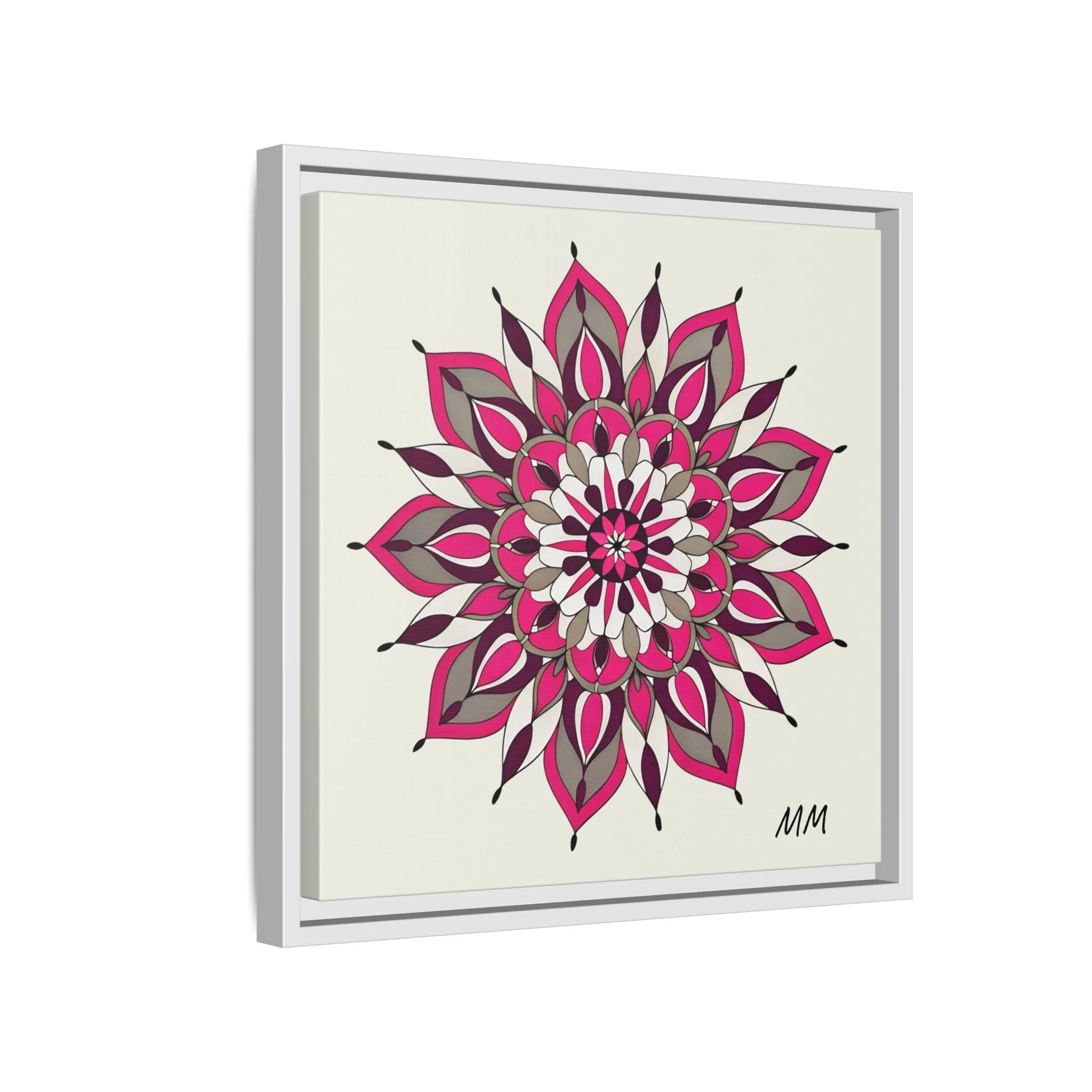 A framed matte canvas print that brings a calm, modern energy to any room. The hand-drawn mandala of layered petals in deep pinks, muted mauves and soft grays sits on a warm ivory ground, creating a bold yet meditative focal point. The slim black pine frame gives the piece a clean, contemporary edge while the canvas texture keeps it feeling handcrafted and personal. Hang it above a console, lean it on a bookshelf, or pair it with other botanical or geometric pieces to build a curated wall that feels intentional and reflective.