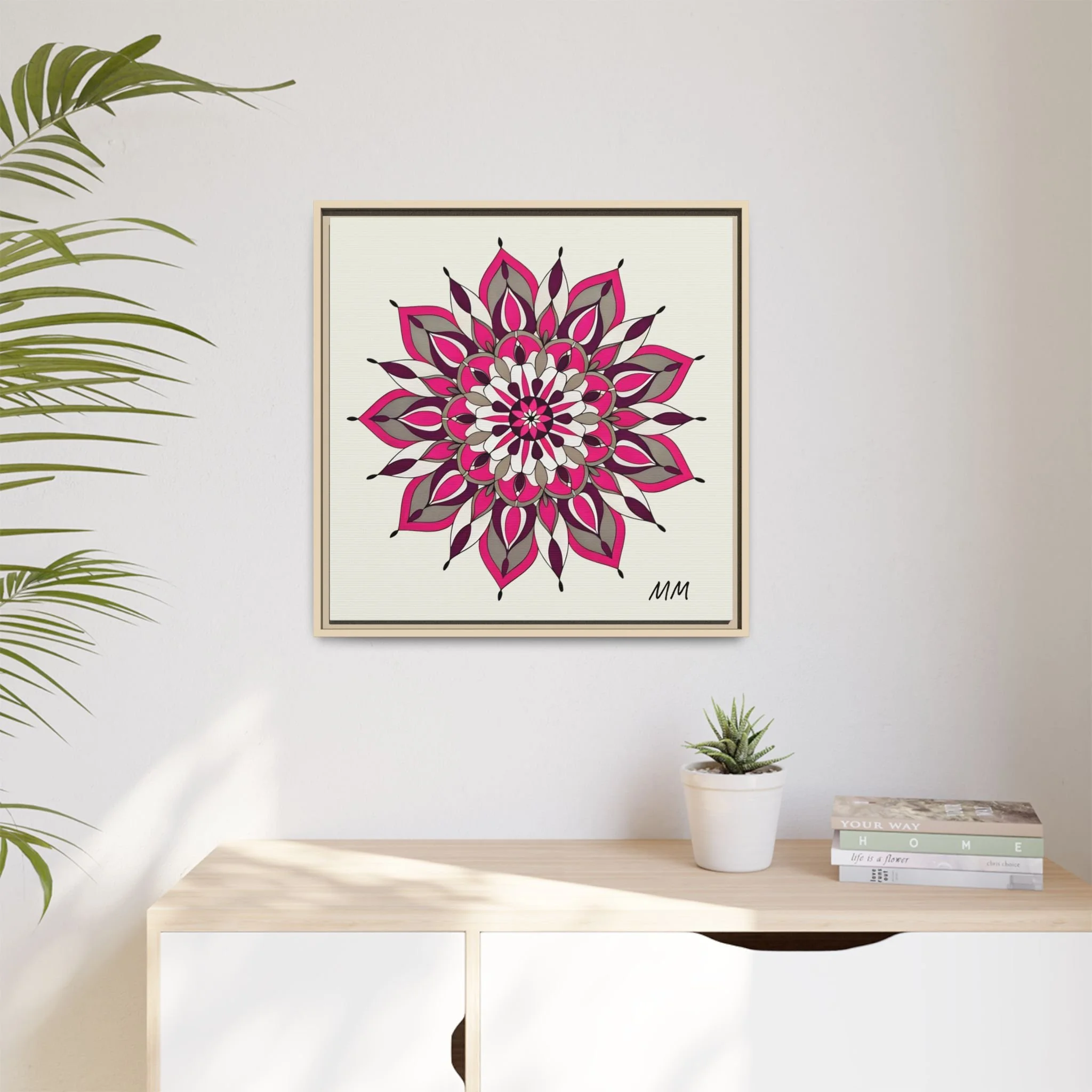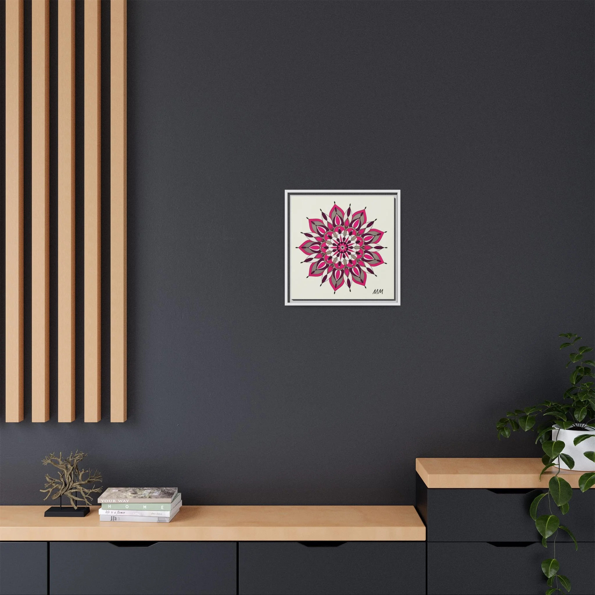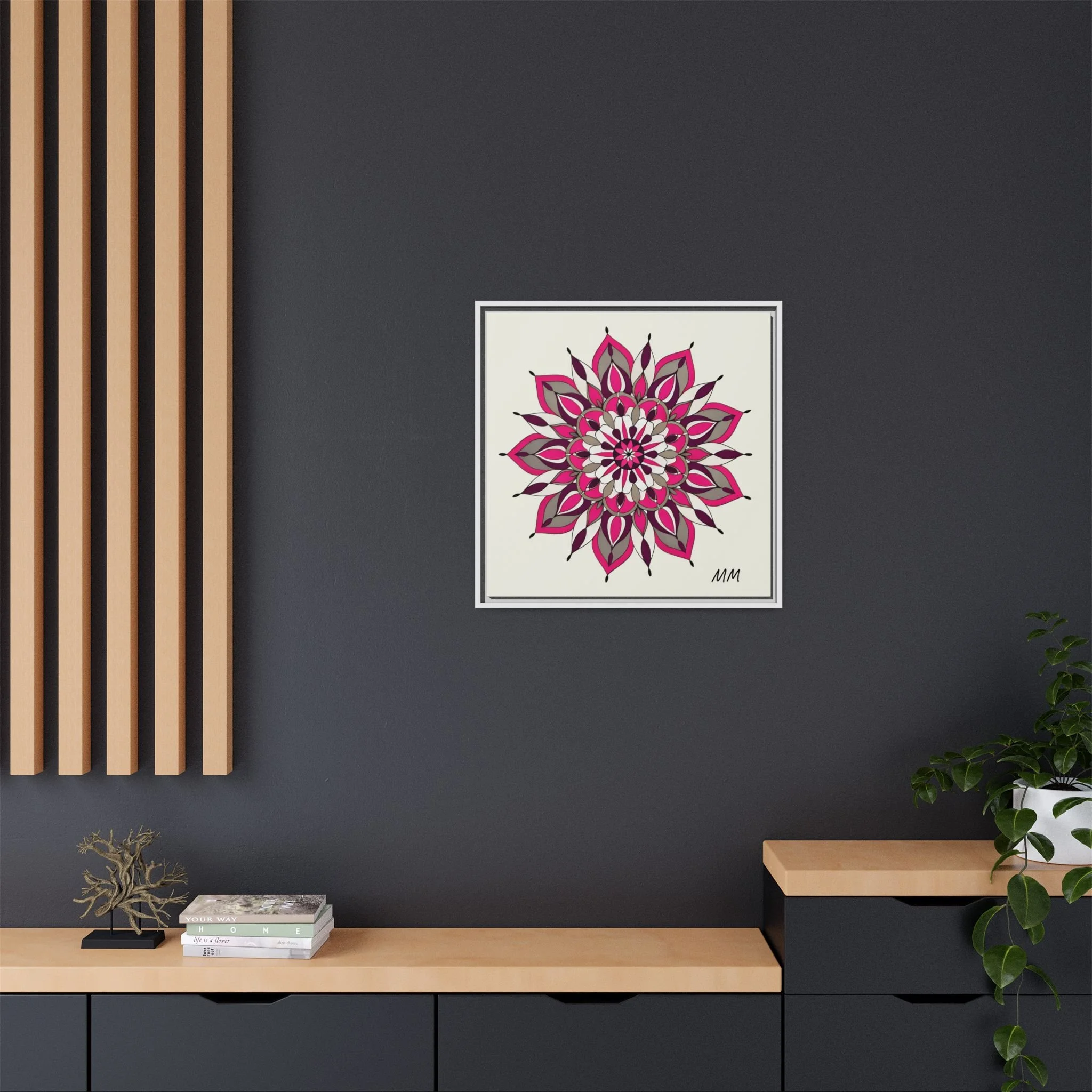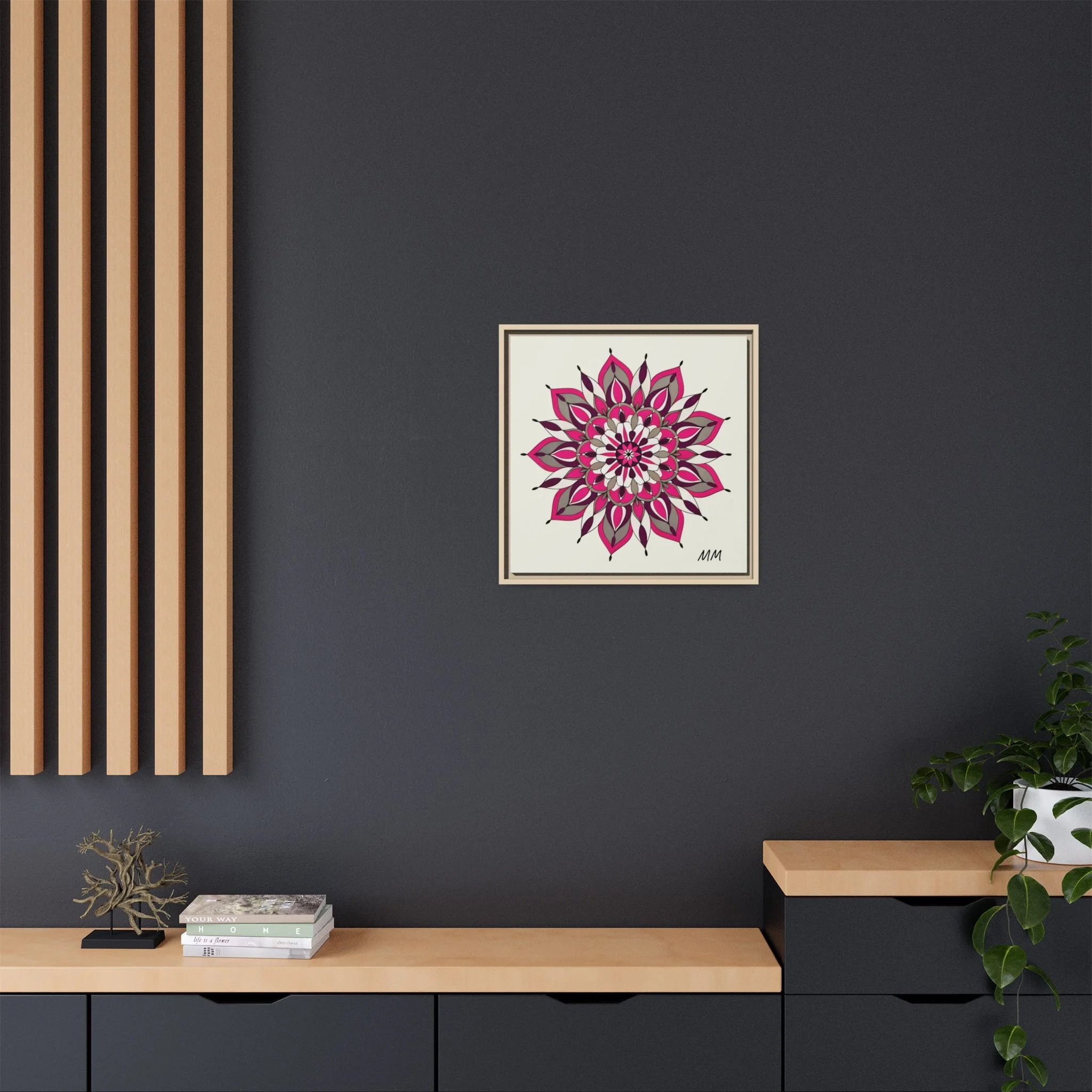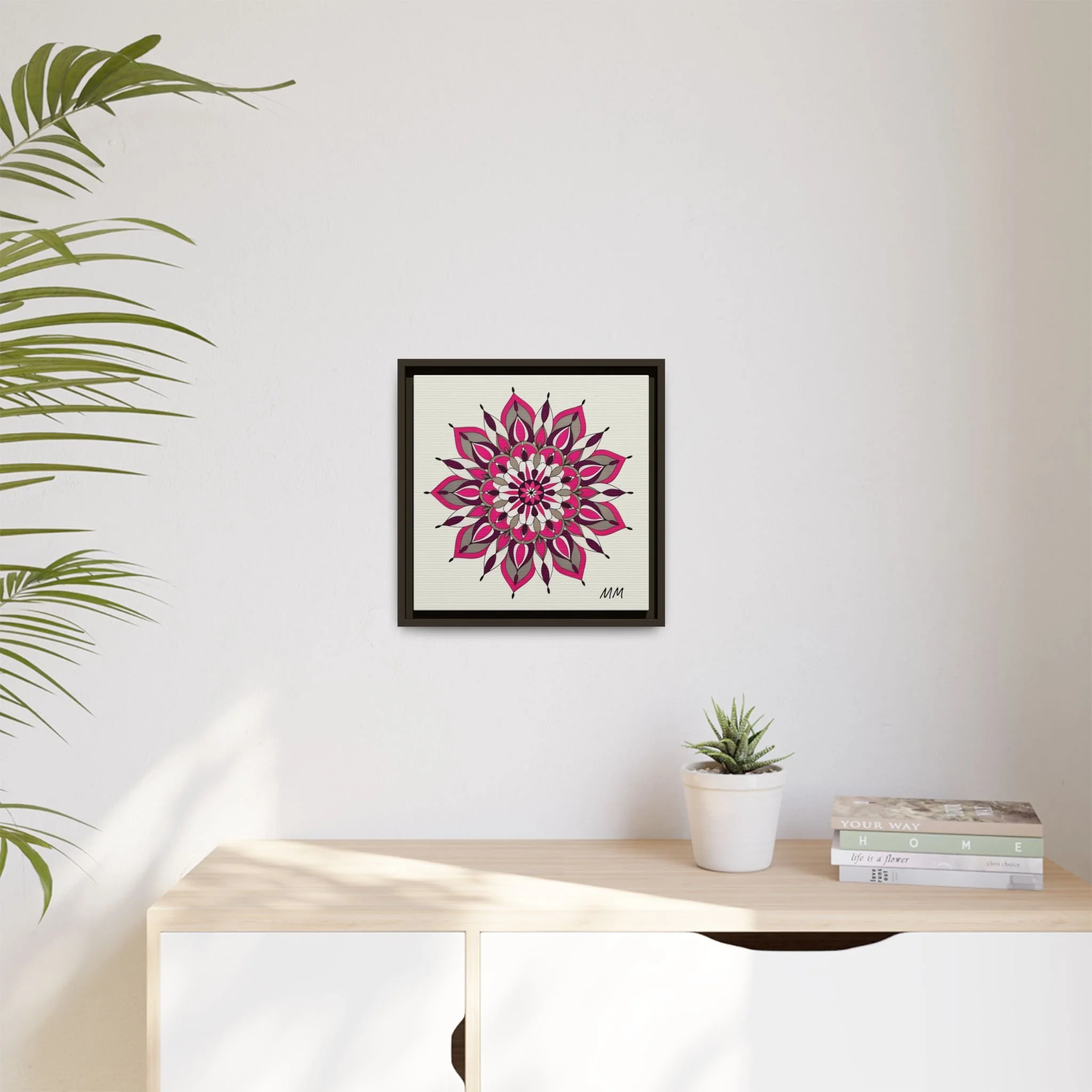 A framed matte canvas print that brings a calm, modern energy to any room. The hand-drawn mandala of layered petals in deep pinks, muted mauves and soft grays sits on a warm ivory ground, creating a bold yet meditative focal point. The slim black pine frame gives the piece a clean, contemporary edge while the canvas texture keeps it feeling handcrafted and personal. Hang it above a console, lean it on a bookshelf, or pair it with other botanical or geometric pieces to build a curated wall that feels intentional and reflective.