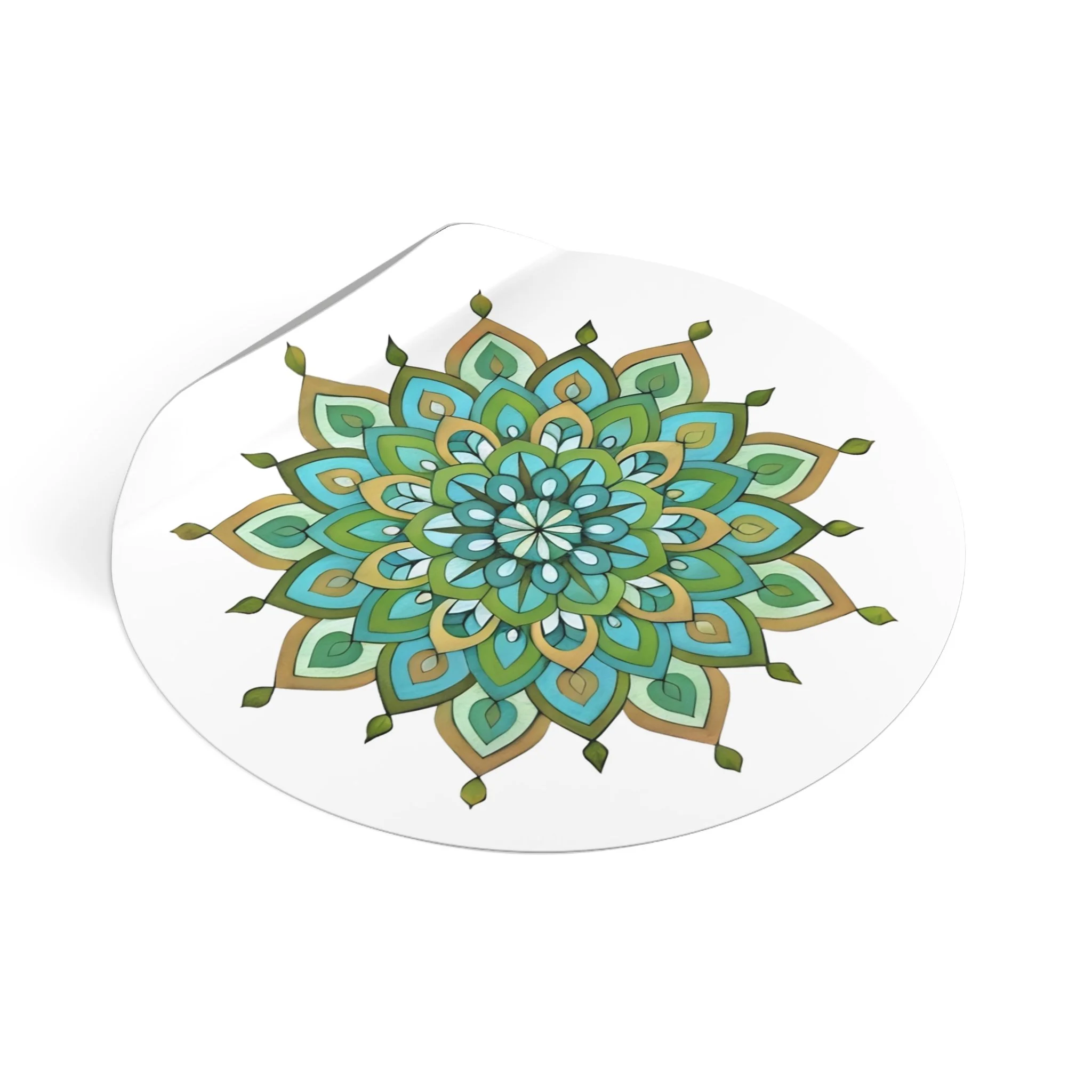 A calming round vinyl sticker that brings a hand-drawn mandala of teal, aqua, and warm olive tones into everyday spaces. The layered petals and subtle gradients feel meditative — like a small window to a quiet studio or a forest clearing. Stick it on journals, water bottles, laptops, or instrument cases to add a gentle, focused accent that ages gracefully outdoors thanks to the protective matte laminate and durable, weather-resistant vinyl.